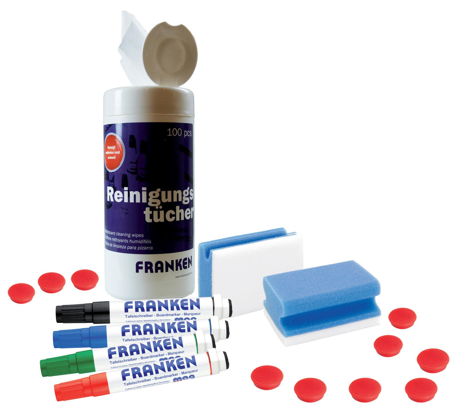 Die Zubehörteile bestehen überwiegend aus Kunststoff und sind auf die weiße Farbgebung der meisten Magnettafeln abgestimmt. Das Set eignet sich ideal für den Einsatz in Büros, Schulen oder anderen Arbeitsumgebungen, in denen Magnettafeln regelmäßig genutzt und gepflegt werden. Hersteller des Produkts ist die Franken-Planungs- und Organisationsmittel GmbH aus Neuss, Deutschland.
