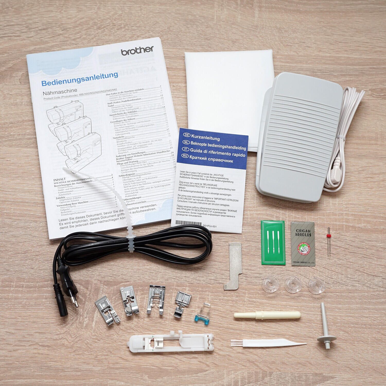 Knopflochfuß A, Überwendlingfuß G, Monogramm Nähfuß N, Reißverschlussfuß I, Nähfuß J (an der Maschine), Knopfannähfuß M, Blindstichfuß R, Pfeiltrenner, 3+1 Spulen, Nadelsatz (3 Stk), Goldfarbene Nadel mit Kugelspitze (Jerseynadel #14), Reinigungspinsel, Schraubendreher (L-förmig), Staubschutzhaube, Nähmaschine, Fußpedal, Netzkabel, Bedienungsanleitungen, |