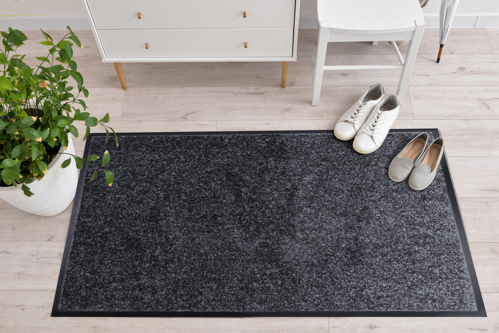 Die Mercury Fußmatte Alpha in der eleganten Farbe schwarz ist die ideale Wahl für deinen Innenbereich. Mit den großzügigen Maßen von 90,0 x 150,0 cm bietet sie ausreichend Platz, um Schmutz und Nässe von deinen Schuhen effektiv zu entfernen, bevor du dein Zuhause betrittst. Das rechteckige Design fügt sich nahtlos in jede Raumgestaltung ein und sorgt für einen stilvollen Akzent in deinem Eingangsbereich. Hergestellt aus 100% Polyprop twisted heatset, überzeugt die Matte nicht nur durch ihre ansprechende Optik, sondern auch durch ihre Langlebigkeit und Pflegeleichtigkeit. Die Unterseite aus 100% Vinyl sorgt für einen stabilen Halt auf dem Boden, während die Stoßkante ein zusätzliches Plus an Sicherheit bietet. Obwohl die Fußmatte nicht rutschfest ist, hält sie dennoch sicher an ihrem Platz und schützt deinen Boden vor unschönen Abnutzungen. Ein weiterer Vorteil der Mercury Fußmatte Alpha ist ihre Waschbarkeit. Sie kann bei Handwäsche bis zu 30°C gereinigt werden, was dir die Pflege erheblich erleichtert und dafür sorgt, dass die Matte stets frisch und einladend aussieht. Beachte jedoch, dass sie nicht für Holzböden oder Fußbodenheizungen geeignet ist, was bei der Auswahl des richtigen Platzes berücksichtigt werden sollte. Die Mercury Fußmatte Alpha kombiniert Funktionalität mit einem schlichten, modernen Design und ist somit eine praktische Ergänzung für jeden Haushalt. Egal ob im Flur, in der Küche oder im Eingangsbereich, diese Fußmatte bietet dir nicht nur einen hygienischen Eingangsbereich, sondern auch eine stilvolle Möglichkeit, Schmutz und Feuchtigkeit fernzuhalten.Technische Daten