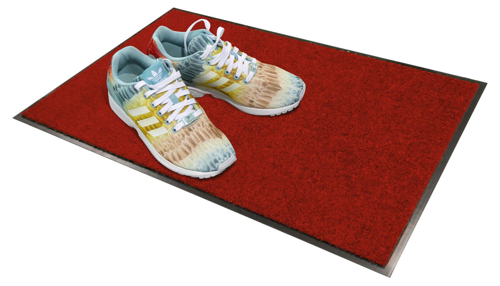 Die Fußmatte ist in einem lebendigen karminroten Farbton gehalten und gehört zur Rainbow-Serie des Herstellers Mercury. Das Material des Flors besteht zu 100% aus Polyamid, was für Strapazierfähigkeit und Langlebigkeit sorgt. Zudem ist die Matte mit einer Stoßkante ausgestattet, die das Stolpern verhindert und zusätzliche Sicherheit bietet.