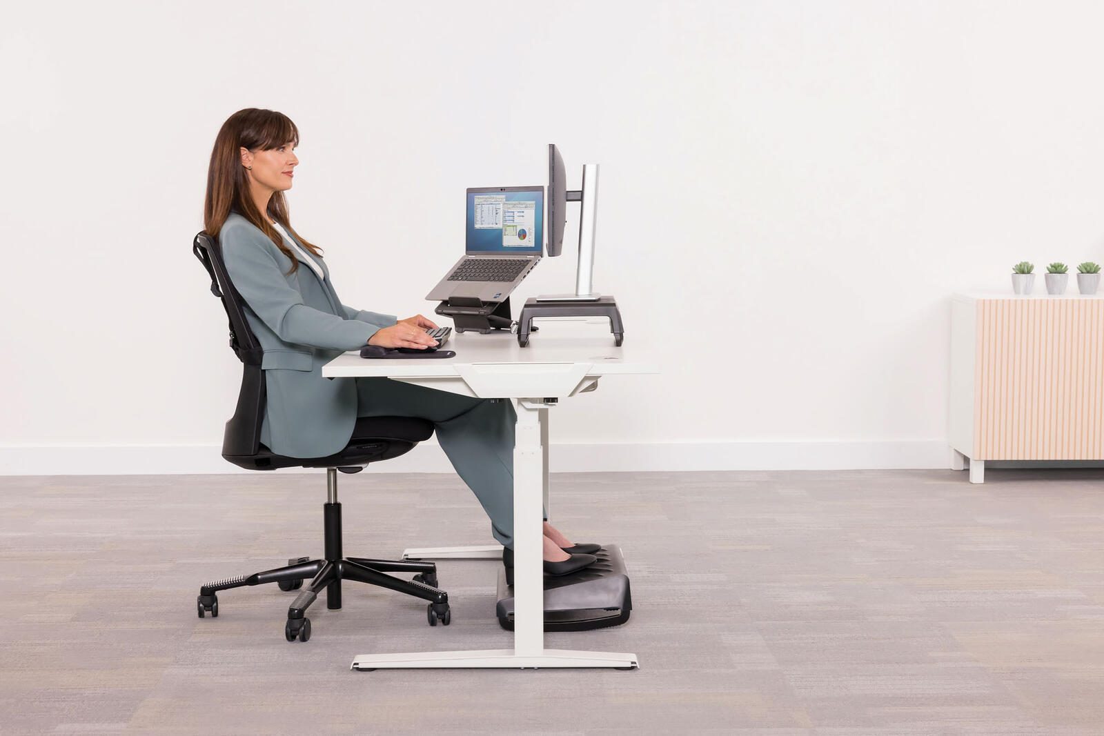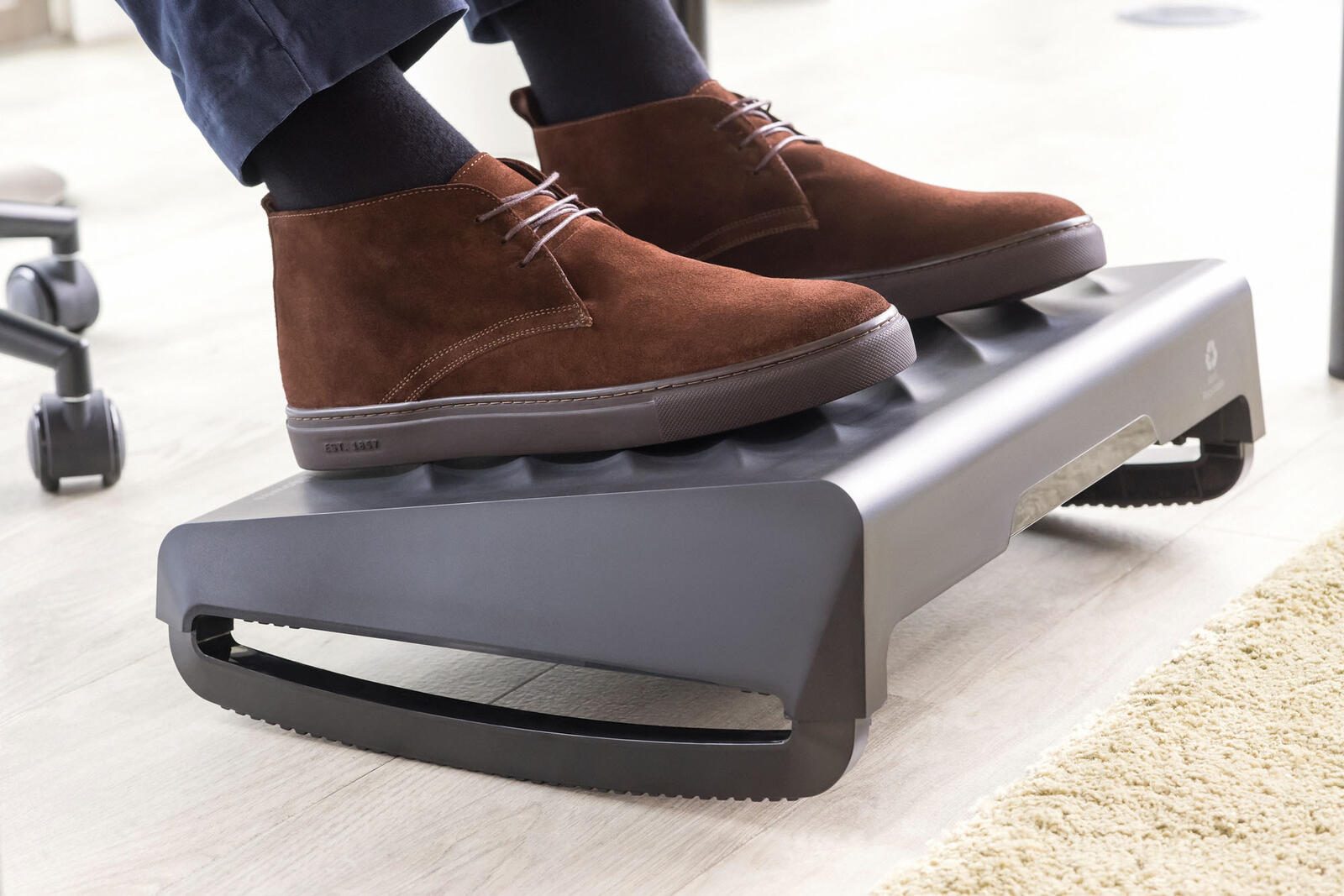 Die Fußstütze Breyta™ schwarz von Fellowes ist die ideale Lösung für mehr Komfort und Ergonomie am Arbeitsplatz. Mit ihrem durchdachten Design und hochwertigen Materialien bietet sie eine optimale Unterstützung für deine Füße, was zu einer verbesserten Körperhaltung und weniger Ermüdung während langer Arbeitsstunden führt. Die Fußstütze zeichnet sich durch einen statischen Winkel von 9° aus, der eine stabile und komfortable Position ermöglicht. Darüber hinaus kannst du die Fußstütze in einem Bereich von 0° bis 18° schaukeln, was dir die Möglichkeit gibt, die Position deiner Füße dynamisch zu verändern und somit die Durchblutung zu fördern. Diese Funktion ist besonders vorteilhaft, um Verspannungen und Beschwerden im Rücken- und Beinbereich vorzubeugen. Ein integrierter Tragegriff und ein verstellbarer Fuß erleichtern den Transport und die Aufbewahrung der Fußstütze. So kannst du sie problemlos von einem Arbeitsplatz zum anderen mitnehmen oder verstauen, wenn sie nicht benötigt wird. Das elegante schwarze Design fügt sich harmonisch in jede Büroumgebung ein und sorgt dafür, dass du nicht nur funktional, sondern auch stilvoll ausgestattet bist. Hergestellt aus robustem ABS-Kunststoff, ist die Fußstütze Breyta™ langlebig und widerstandsfähig, sodass sie den Anforderungen des täglichen Gebrauchs problemlos standhält. Mit dieser Fußstütze investierst du in dein Wohlbefinden und deine Gesundheit am Arbeitsplatz.Technische Daten