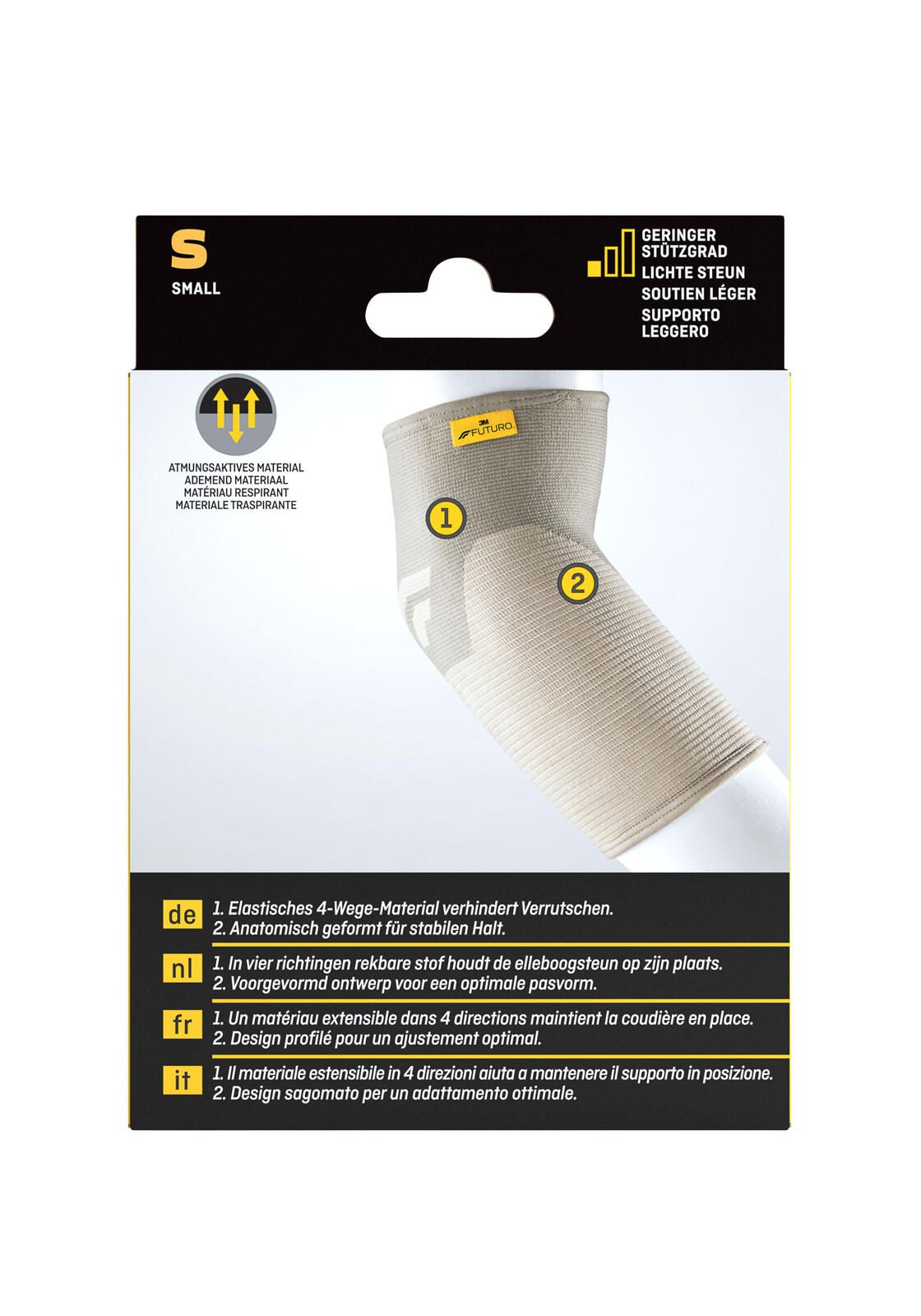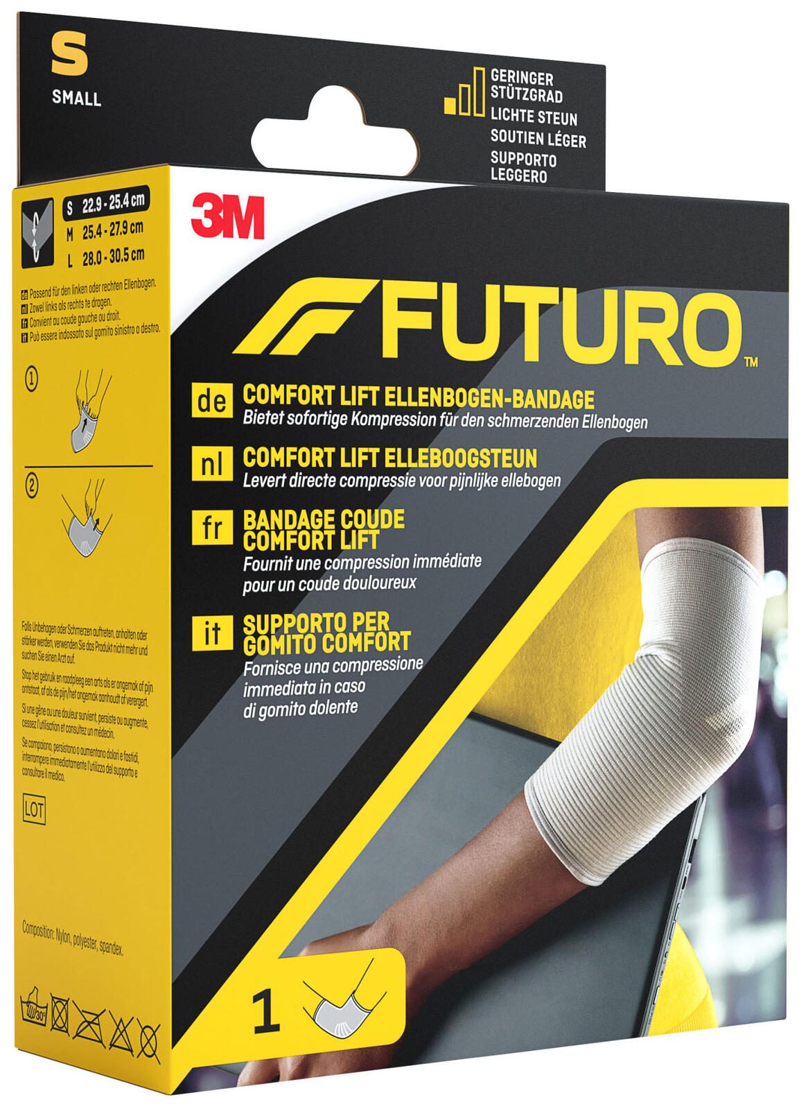 Im Lieferumfang ist ein Stück enthalten, das sich einfach anlegen lässt. Die FUTURO® Ellenbogenbandage eignet sich für den täglichen Gebrauch und unterstützt bei leichten Beschwerden oder zur Vorbeugung von Belastungen im Ellenbogenbereich. Sie ist Teil der Produktfamilie Wundpflaster (verbrauchsfertig) und wird von der 3M Deutschland GmbH unter der Marke FUTURO® hergestellt.