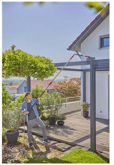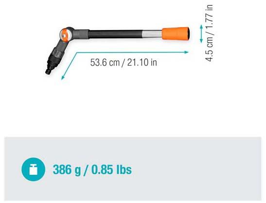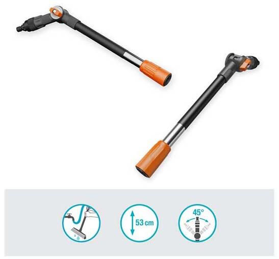 Mit einer Länge von 53 cm ermöglicht der Stiel eine praktische Verlängerung eines bereits vorhandenen Stiels um exakt diese Länge. Dadurch gewinnen Sie eine größere Reichweite bei der Reinigung von schwer zugänglichen Stellen im Garten oder an Außenflächen. Besonders hervorzuheben ist das innovative Gelenk, das sich um bis zu 45 Grad feinstufig abwinkeln lässt. Diese flexible Anpassungsmöglichkeit erleichtert die Reinigung deutlich, da sich der Stiel optimal an verschiedene Winkel und Oberflächen anpassen lässt, ohne dass Sie sich unkomfortabel verrenken müssen.