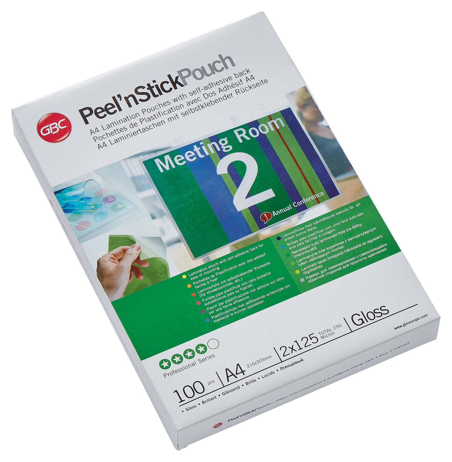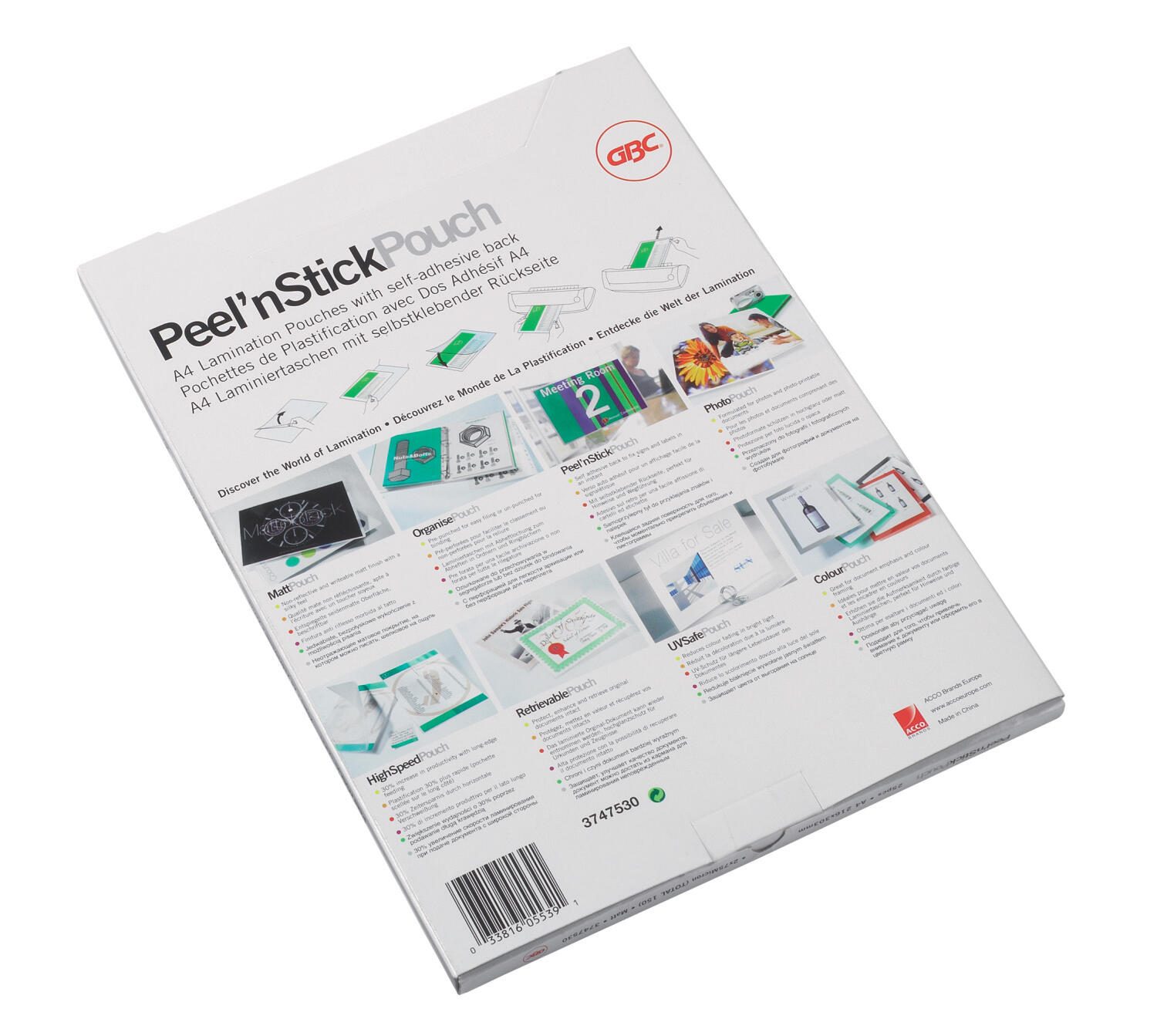 Die Laminierfolien bestehen aus Polyethylen und sind in einer Packung mit 100 Stück erhältlich. Die Größe des Zipbags beträgt 21,6 x 30,3 cm, passend zum Format A4. Das Produkt ist Teil der Peel´nStick Serie von GBC, einem Hersteller mit Sitz in Stuttgart, Deutschland. Diese Folien sind ideal für den Einsatz im Büro oder zu Hause, wenn eine einfache und effektive Laminierung mit zusätzlicher Klebefunktion gewünscht wird.