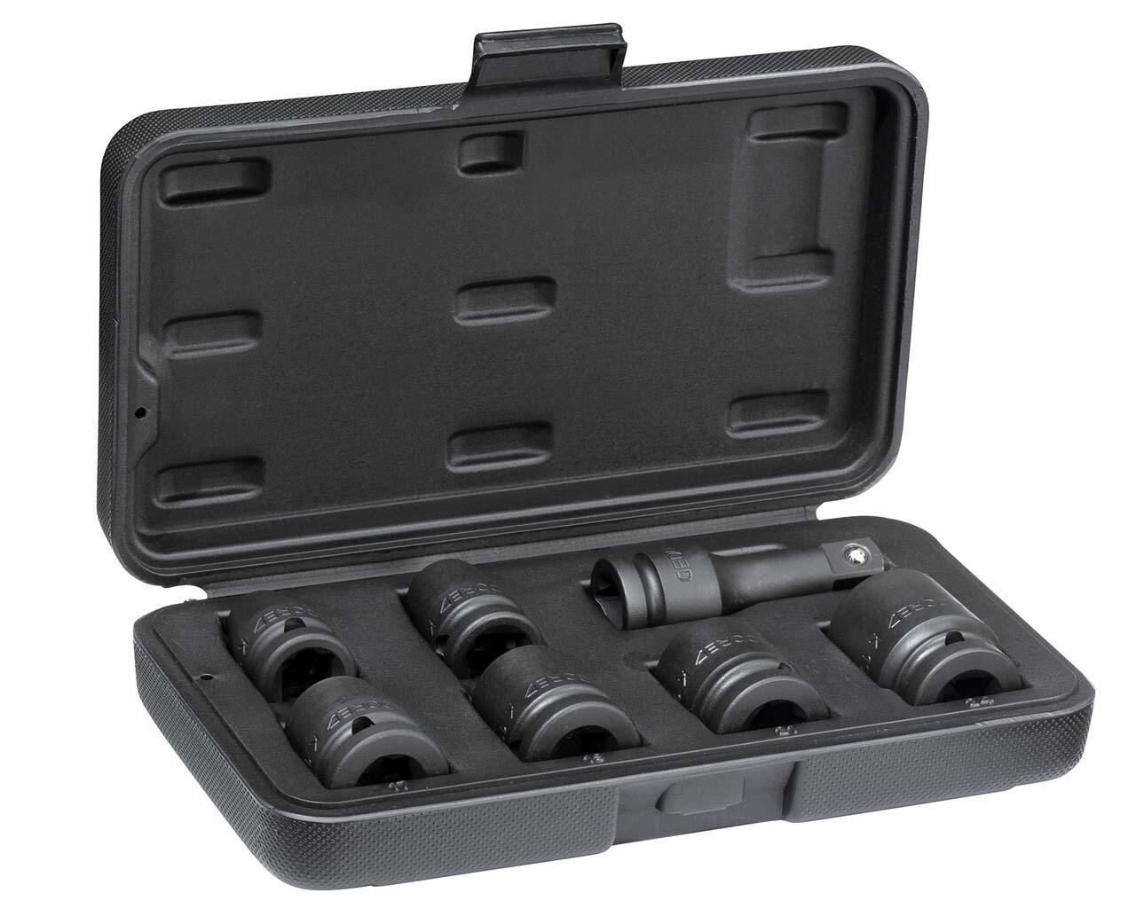 - 6 Kraftschraubereinsätze passend für alle gängigen Druckluft- und Elektroschrauber; 1 Kraftschrauber Verlängerung 75 mm mit Kugelsicherung am Vierkant; Betätigungsart: hand- und maschinenbetätigt; Einsatzbereich: Reparatur und Instandsetzung Wartung und