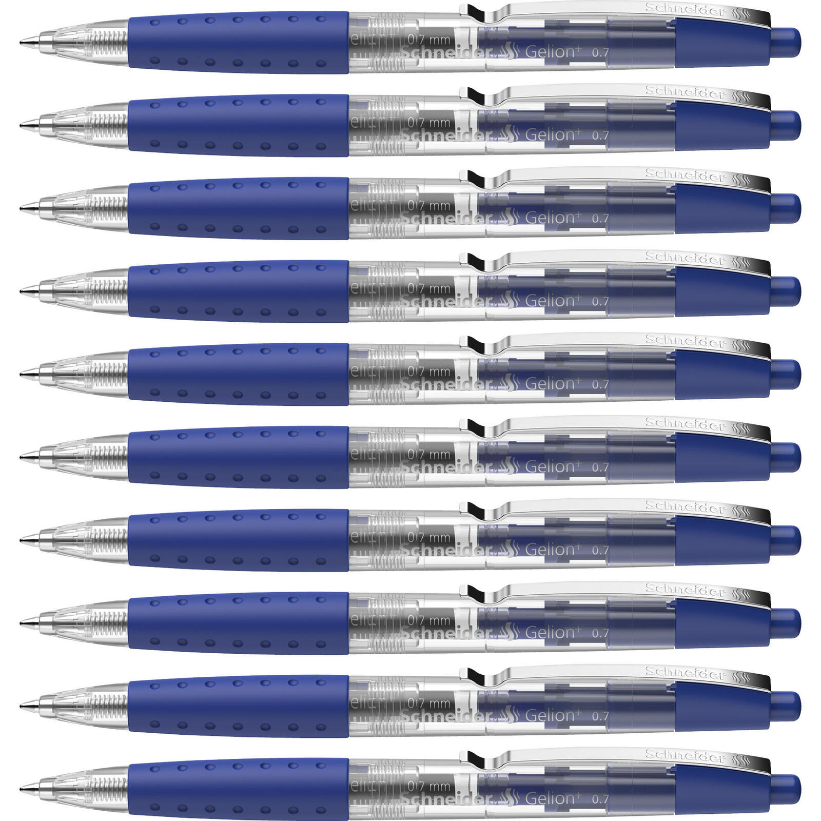 Der Schneider Gelion Gelschreiber mit einer feinen Strichstärke von 0.4 mm ist der perfekte Begleiter für präzises Schreiben und Zeichnen. Mit seiner Edelstahlspitze gewährleistet er eine gleichmäßige Tinte und ein sanftes Schreibgefühl, während die gummierte Griffart für optimalen Komfort und Kontrolle sorgt. Die Schreibfarbe Blau überzeugt durch ihre lebendige und kräftige Nuancierung, die sowohl im Büro als auch in der Schule ideal zur Geltung kommt. Ein besonderes Merkmal des Gelion Gelschreibers ist die praktische Druckmechanik, die ein schnelles und einfaches Starten des Schreibens ermöglicht. Die integrierte Clip-Funktion sorgt dafür, dass du den Stift immer griffbereit hast und ihn sicher an einem Notizbuch oder einer Tasche befestigen kannst. Darüber hinaus ist dieser Gelschreiber nachfüllbar, was nicht nur umweltfreundlich ist, sondern auch für eine langfristige Nutzung sorgt. Die schnell trocknende und wischfeste Tinte verhindert unschöne Schmierereien und sorgt dafür, dass deine Notizen und Zeichnungen immer sauber und ordentlich bleiben. Mit einem Pack von 10 Stück hast du immer genügend Vorrat, um deine kreativen Ideen festzuhalten oder wichtige Informationen festzuschreiben. Der Schneider Gelion Gelschreiber ist nicht nur funktional, sondern auch stilvoll mit einem blauen Gehäuse, das ihn zu einem attraktiven Schreibgerät macht. Passende Ersatzminen sind die Schneider Gelion 39, die dir die Möglichkeit geben, deinen Gelschreiber immer wieder aufzufrischen und somit lange Freude daran zu haben. Mit dem Schneider Gelion Gelschreiber erhältst du ein qualitativ hochwertiges Schreibwerkzeug, das sowohl für den täglichen Gebrauch als auch für kreative Projekte bestens geeignet ist.Technische Daten