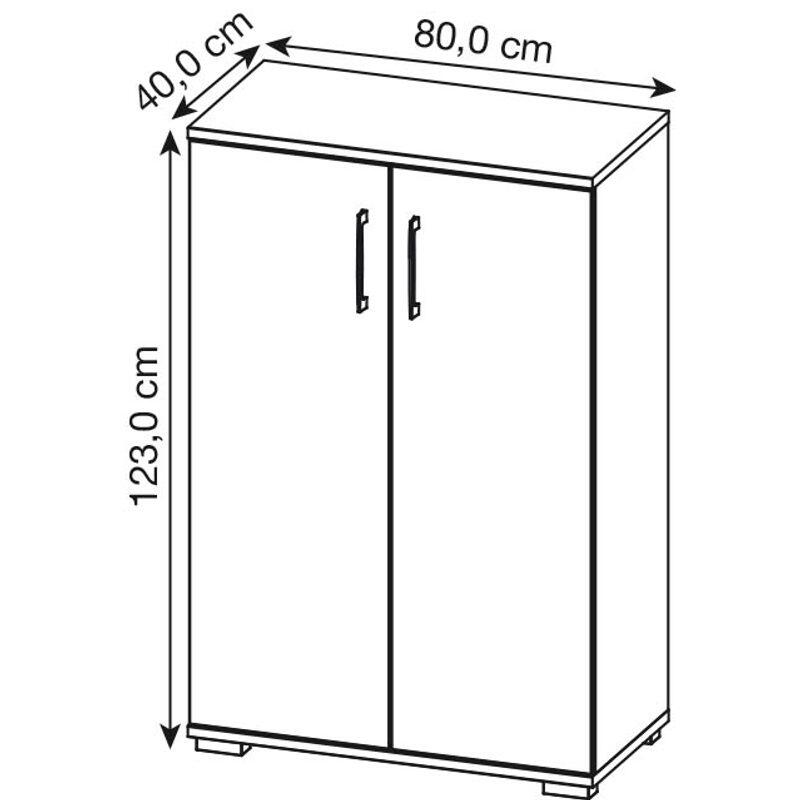 - mit zwei Türen, dahinter zwei feste Einlegeböden (jeweils belastbar bis zu 22 kg), sodass drei Fächer in Ordnerhöhe entstehen