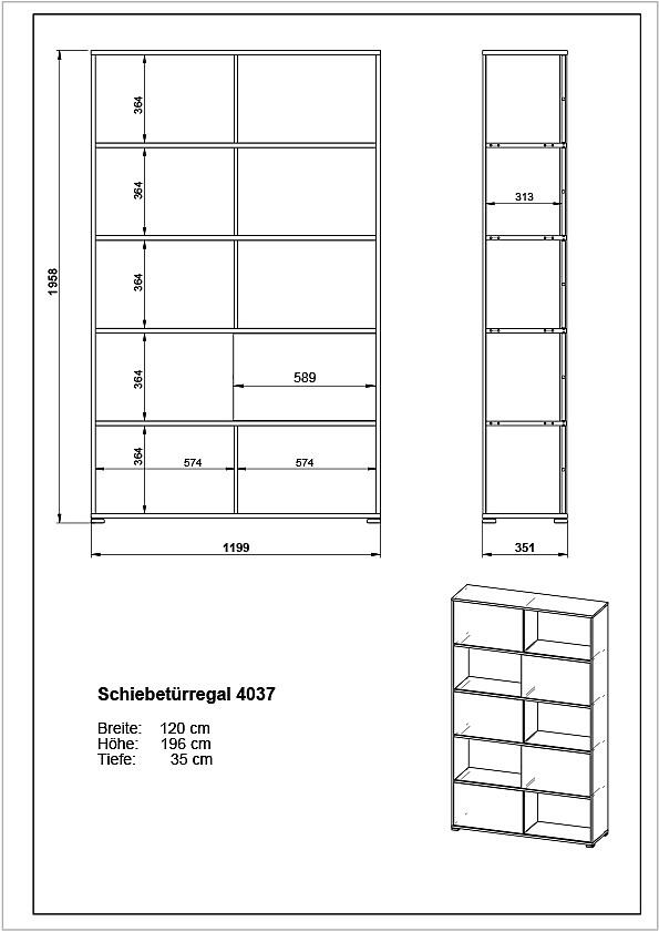 - Schiebetürregal mit zehn Fächern und fünf Schiebetüren, sodass fünf Fächer offen und fünf Fächer geschlossen sind, vier feste Böden (jeweils belastbar bis zu 15 kg), unterteilt durch fünf Mittelseiten, Oberboden belastbar bis zu 15 kg