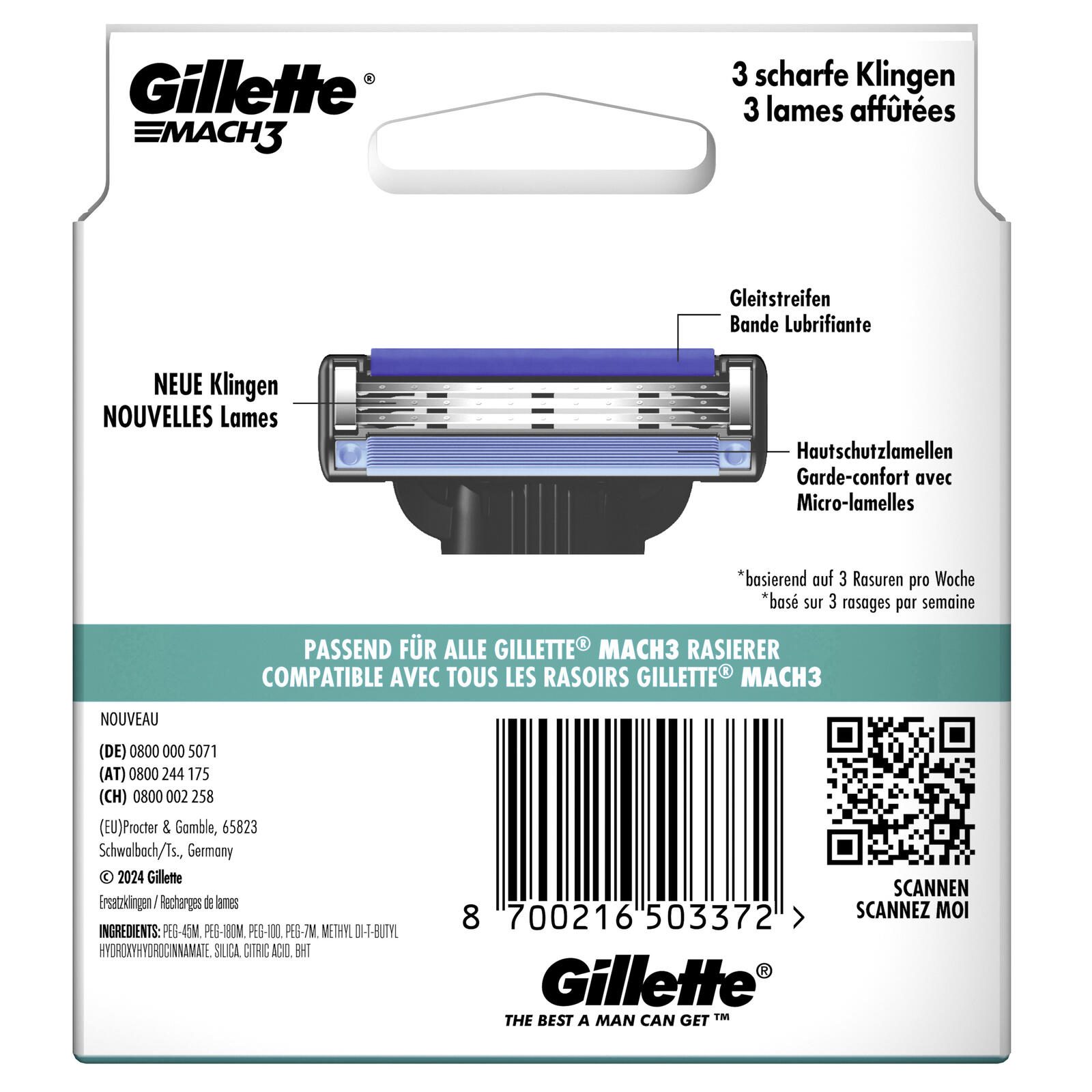 Die Gillette Mach3 Rasierklingen bieten eine besonders gründliche und komfortable Rasur für Männer mit allen Hauttypen. Mit ihrem bewährten Design ermöglichen sie eine sanfte Rasur, die Hautirritationen minimiert und gleichzeitig ein glattes Ergebnis erzielt. Die Klingen sind mit einem speziellen Gleitstreifen ausgestattet, der die Klinge sanft über die Haut gleiten lässt und somit für ein angenehmes Rasurgefühl sorgt.