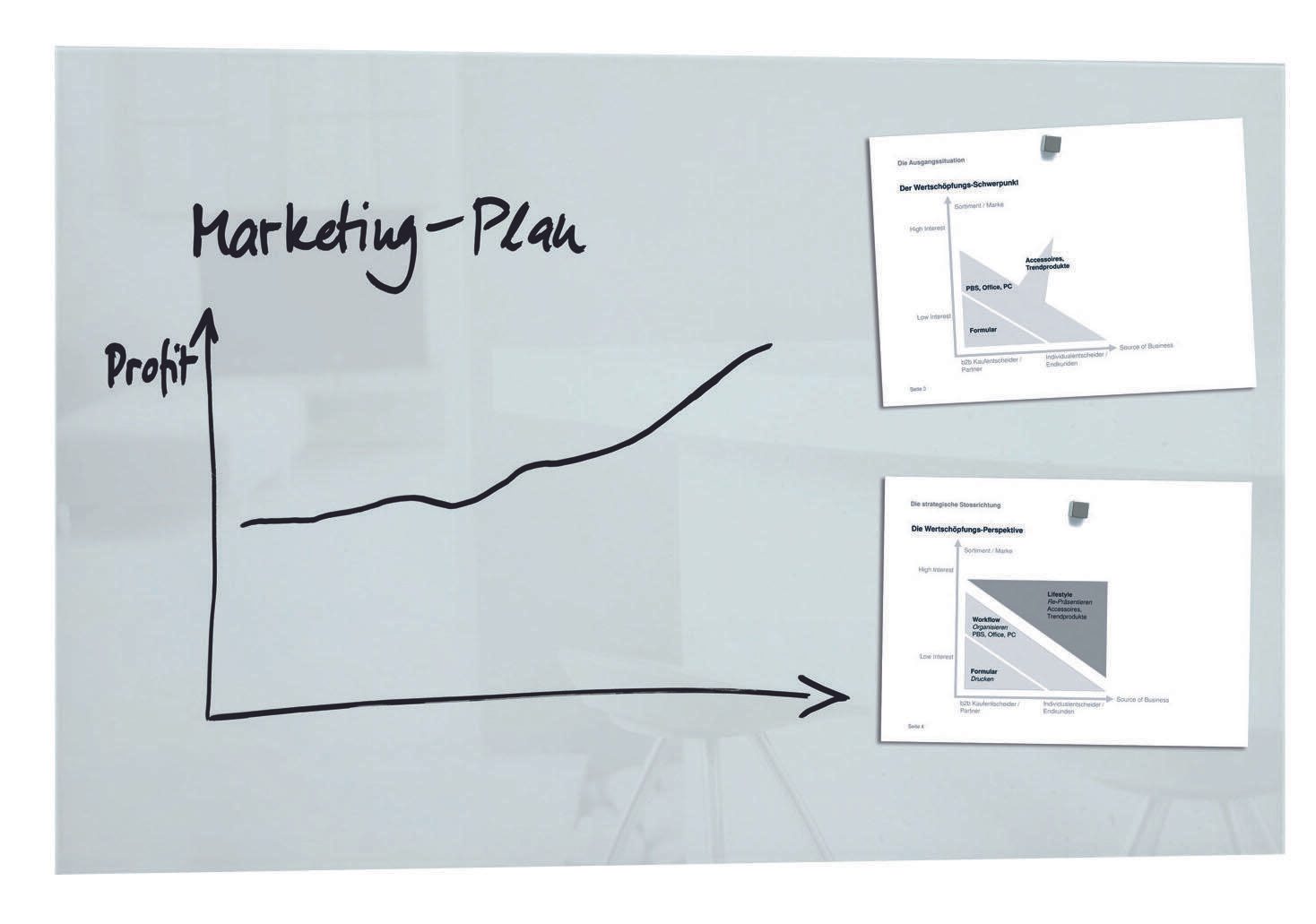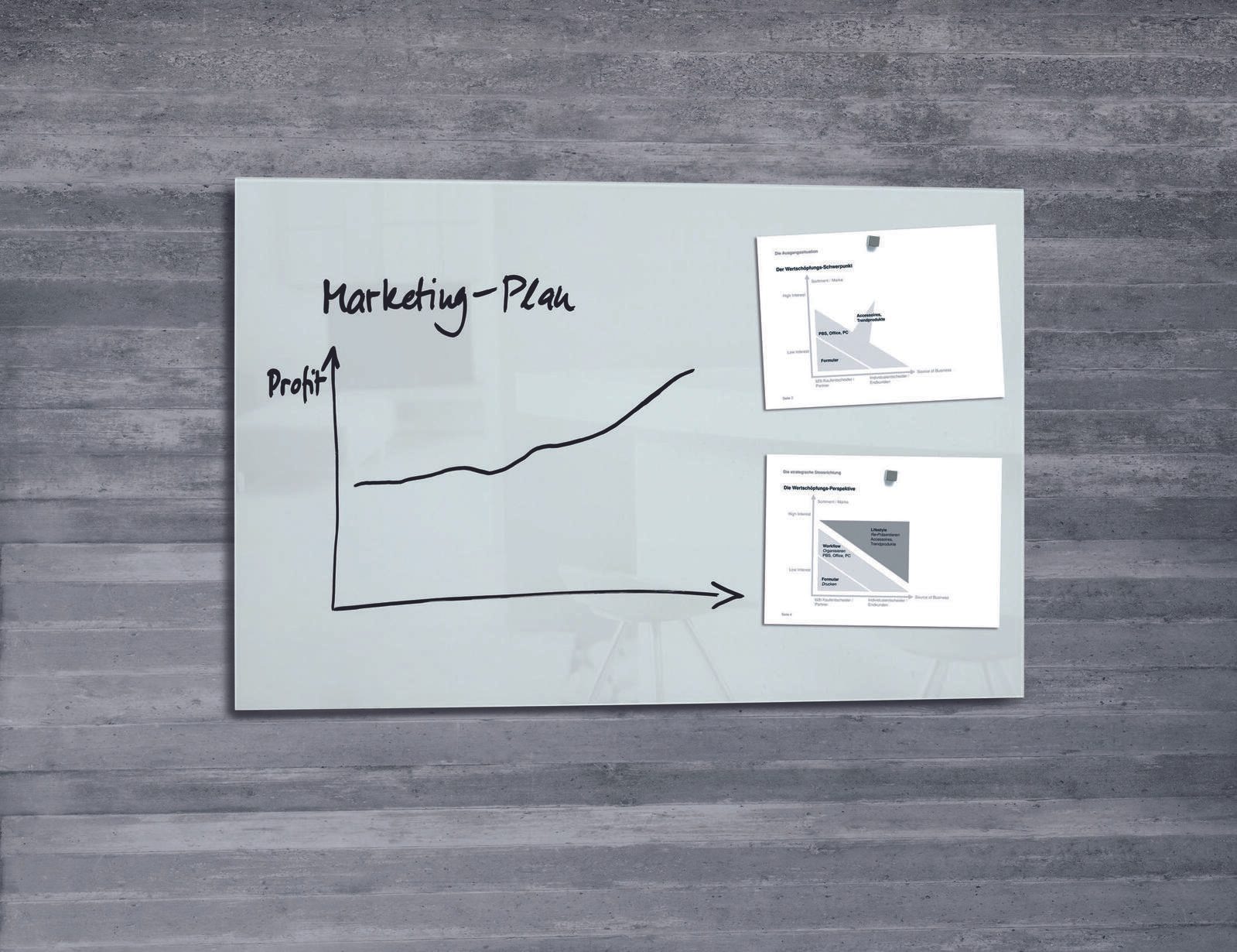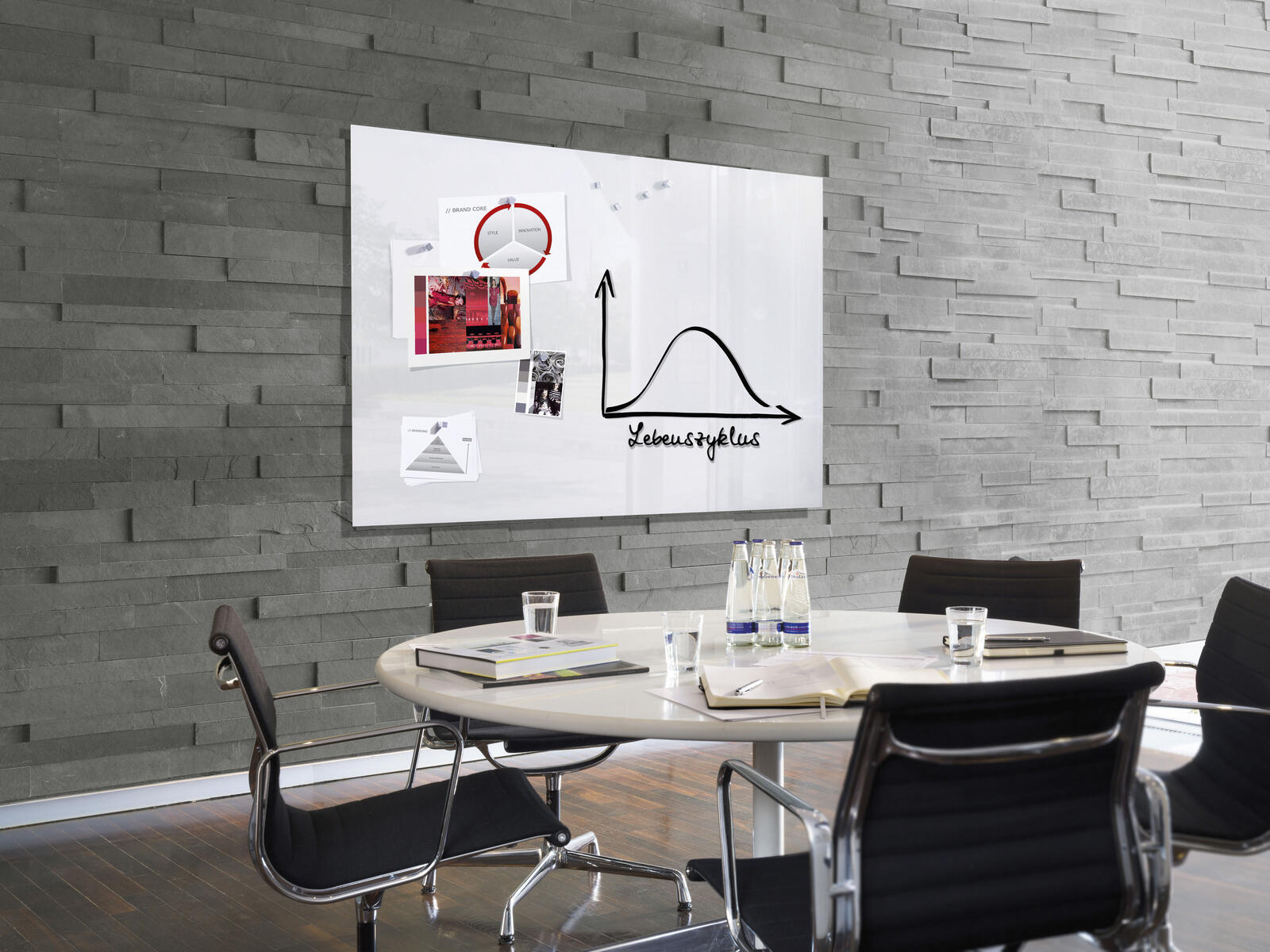 Die Tafeloberfläche aus gehärtetem Glas ermöglicht nicht nur das Anbringen von Magneten, sondern ist auch mit Kreidemarkern beschreibbar. So kannst du deine Gedanken festhalten, Ideen skizzieren oder wichtige Termine im Blick behalten.