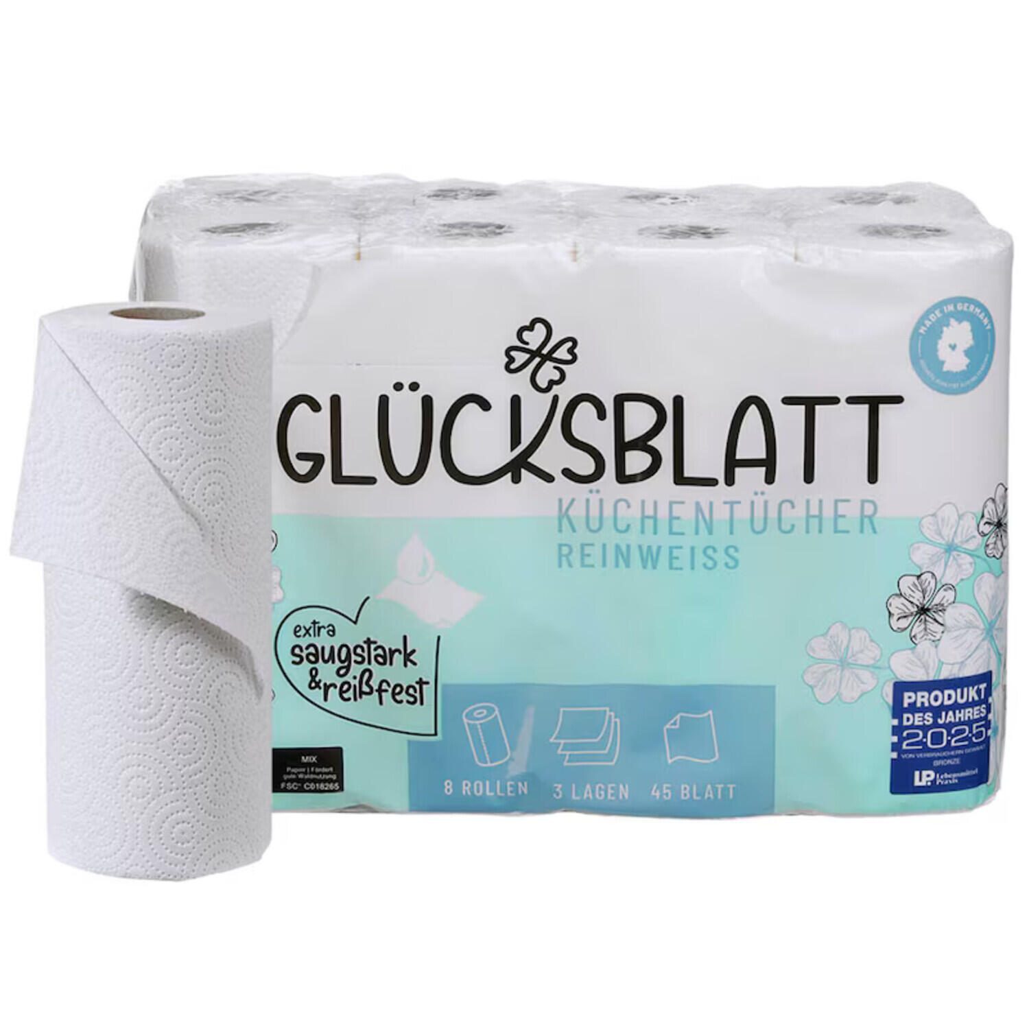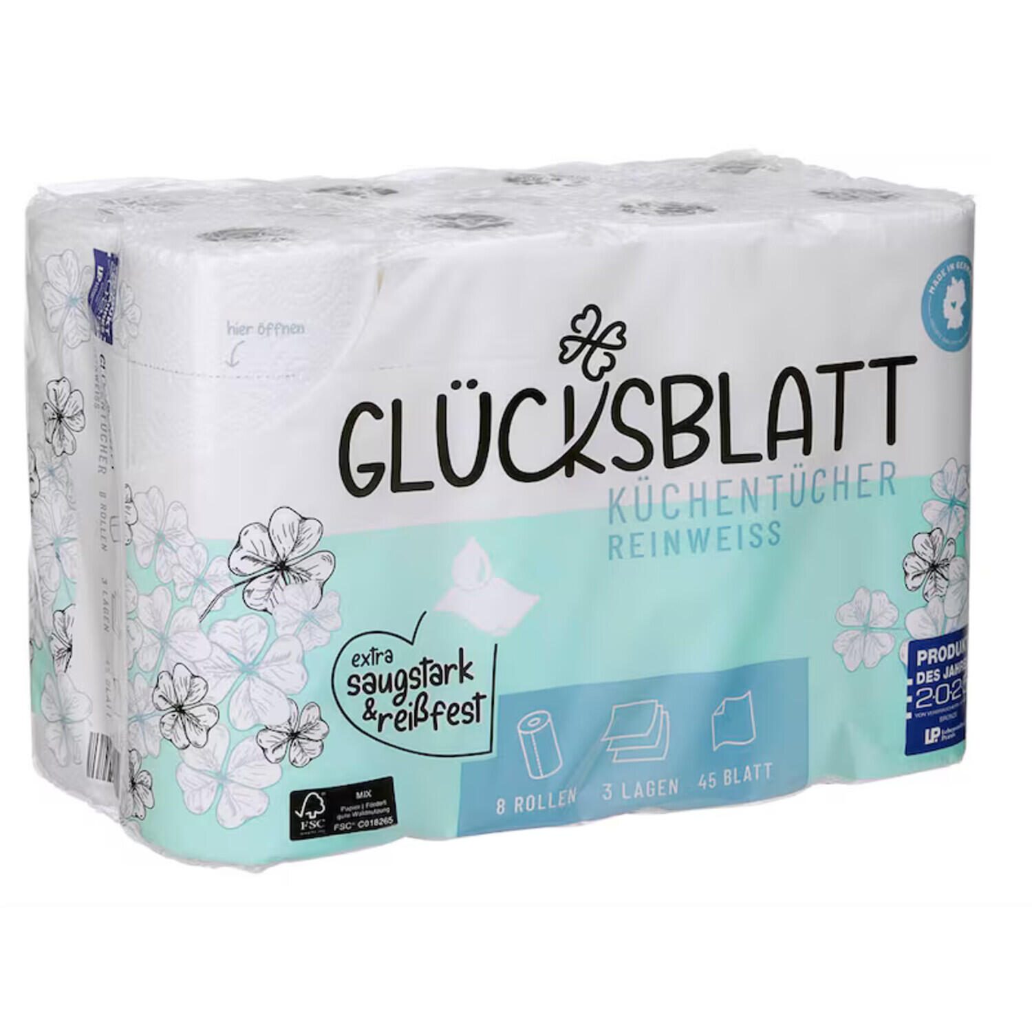 GLÜCKSBLATT Küchenrollen reinweiß, 3-lagig 1 Pack = 8 Rollen