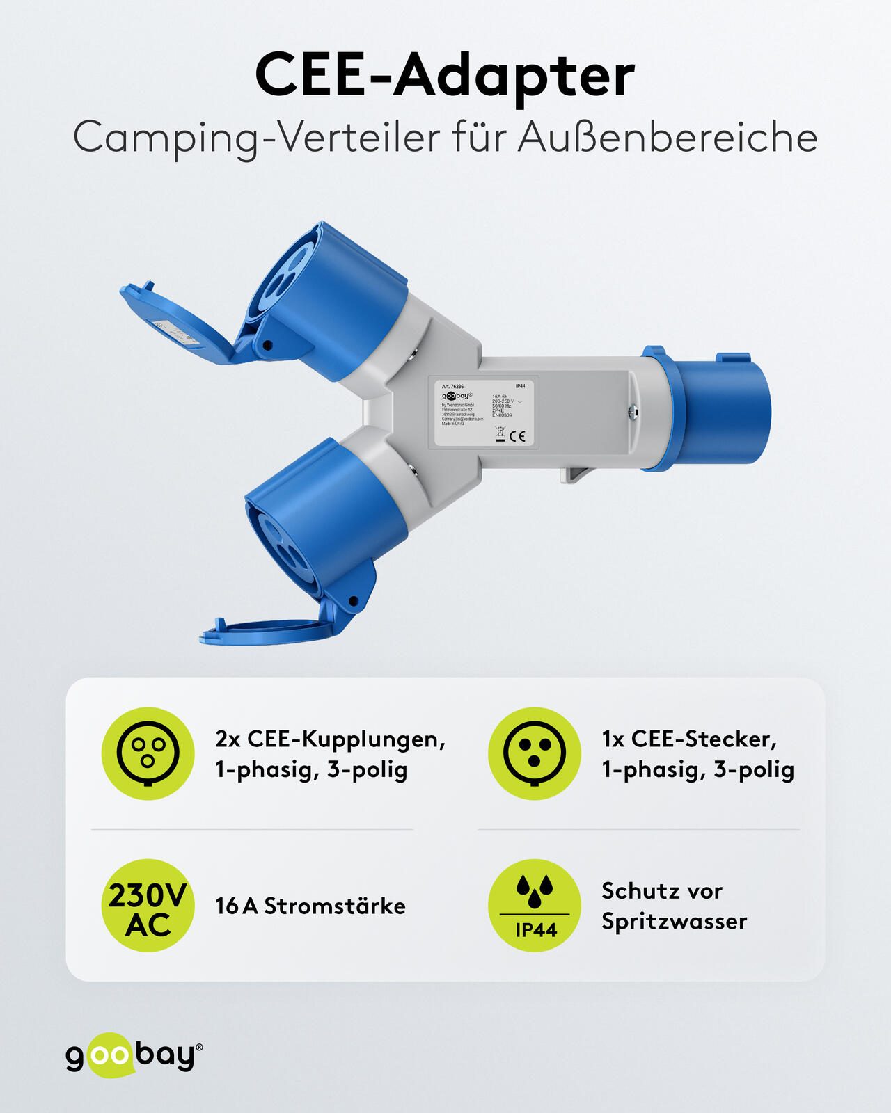Als CEE-Y-Adapter ermöglicht dieser Verteiler die Verteilung von Strom von einem einzelnen CEE-Stecker auf zwei CEE-Kupplungen, was die gleichzeitige Nutzung mehrerer Geräte ohne zusätzlichen Aufwand erlaubt. Die kompakte Bauweise und die hochwertige Verarbeitung machen den goobay Campingadapter zu einem unverzichtbaren Begleiter für alle, die im Außenbereich auf eine sichere und vielseitige Stromversorgung angewiesen sind.