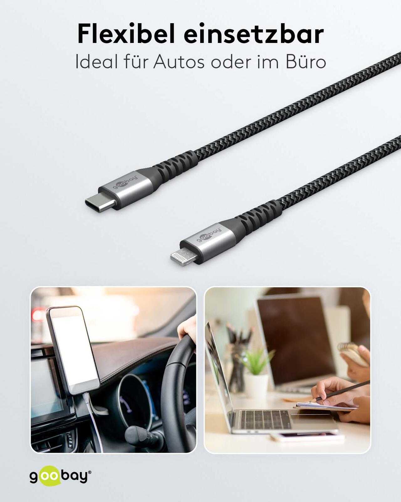 Das goobay Lightning/USB C Kabel ist ein kurzes Adapterkabel mit einer Länge von 0,5 Metern. Es verbindet Geräte mit Lightning-Anschluss mit solchen, die über einen USB-C-Anschluss verfügen. Die Farbkombination aus Grau und Schwarz sorgt für ein unauffälliges und modernes Design.