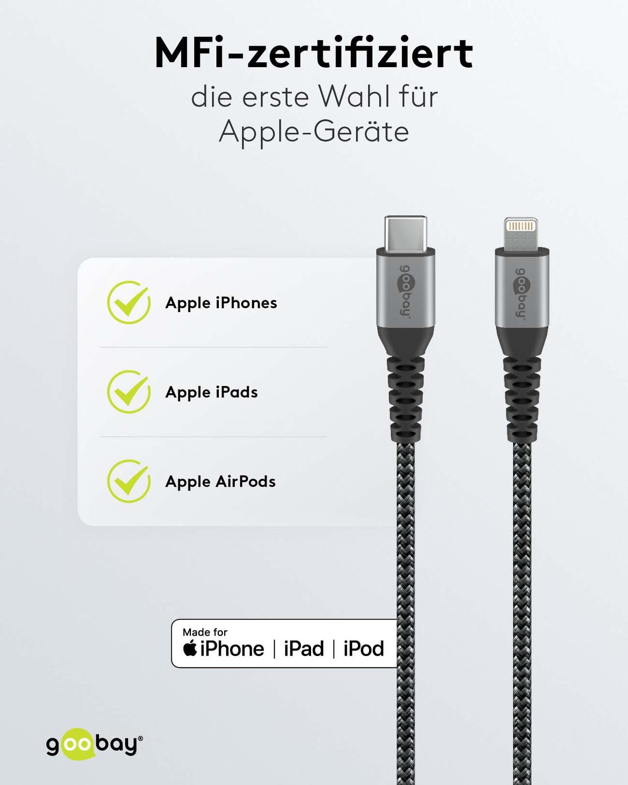 Dieses Adapterkabel von goobay verbindet Geräte mit einem Lightning-Anschluss mit solchen, die einen USB-C-Stecker nutzen. Die Kabellänge beträgt 1,0 Meter, was eine flexible Nutzung ermöglicht, ohne dass das Kabel zu kurz oder unhandlich wird. Die Farbgestaltung in Grau und Schwarz sorgt für ein unauffälliges und modernes Erscheinungsbild.