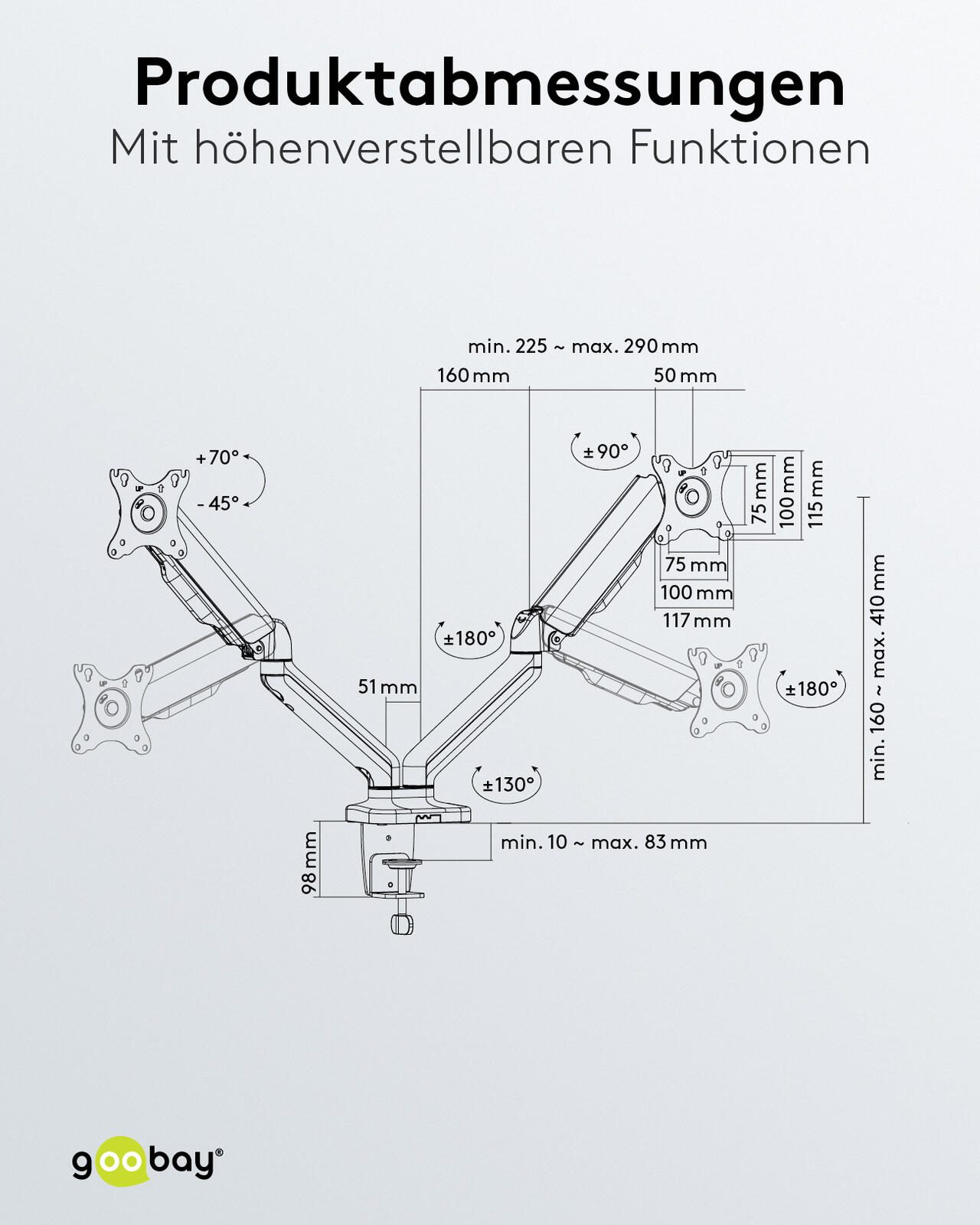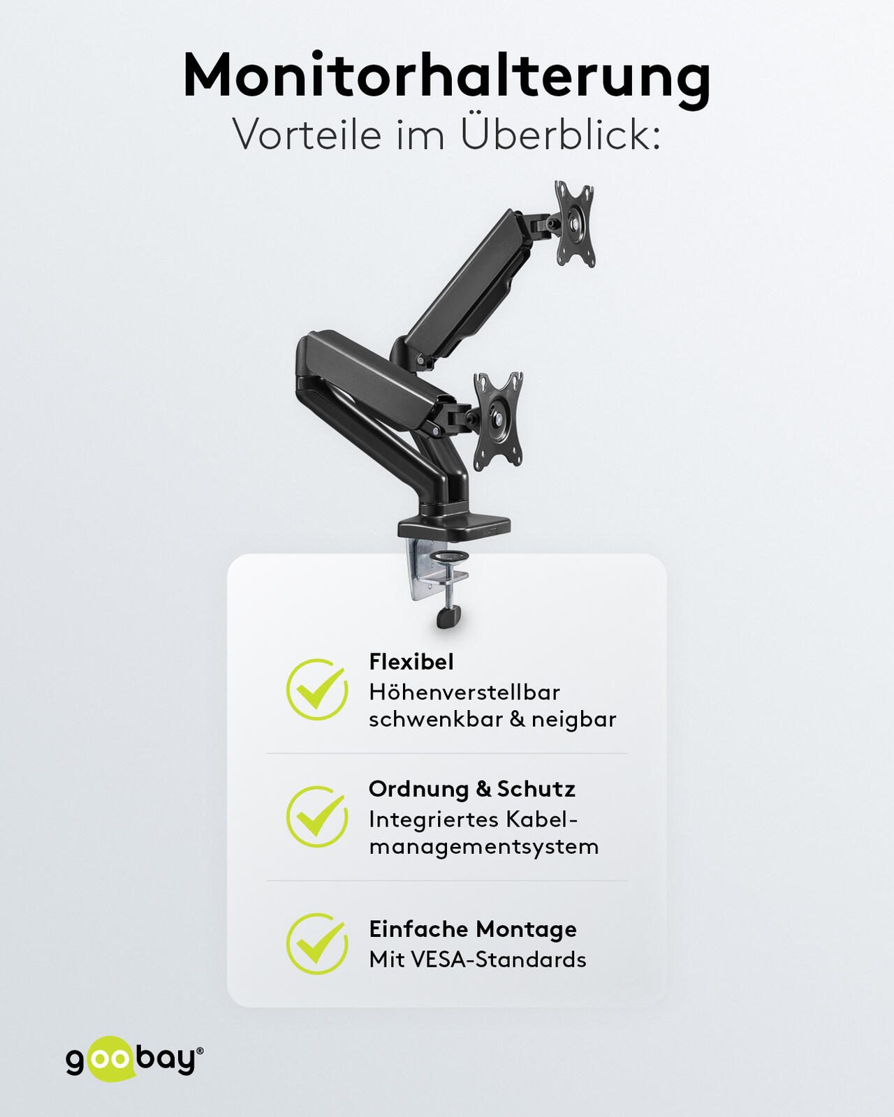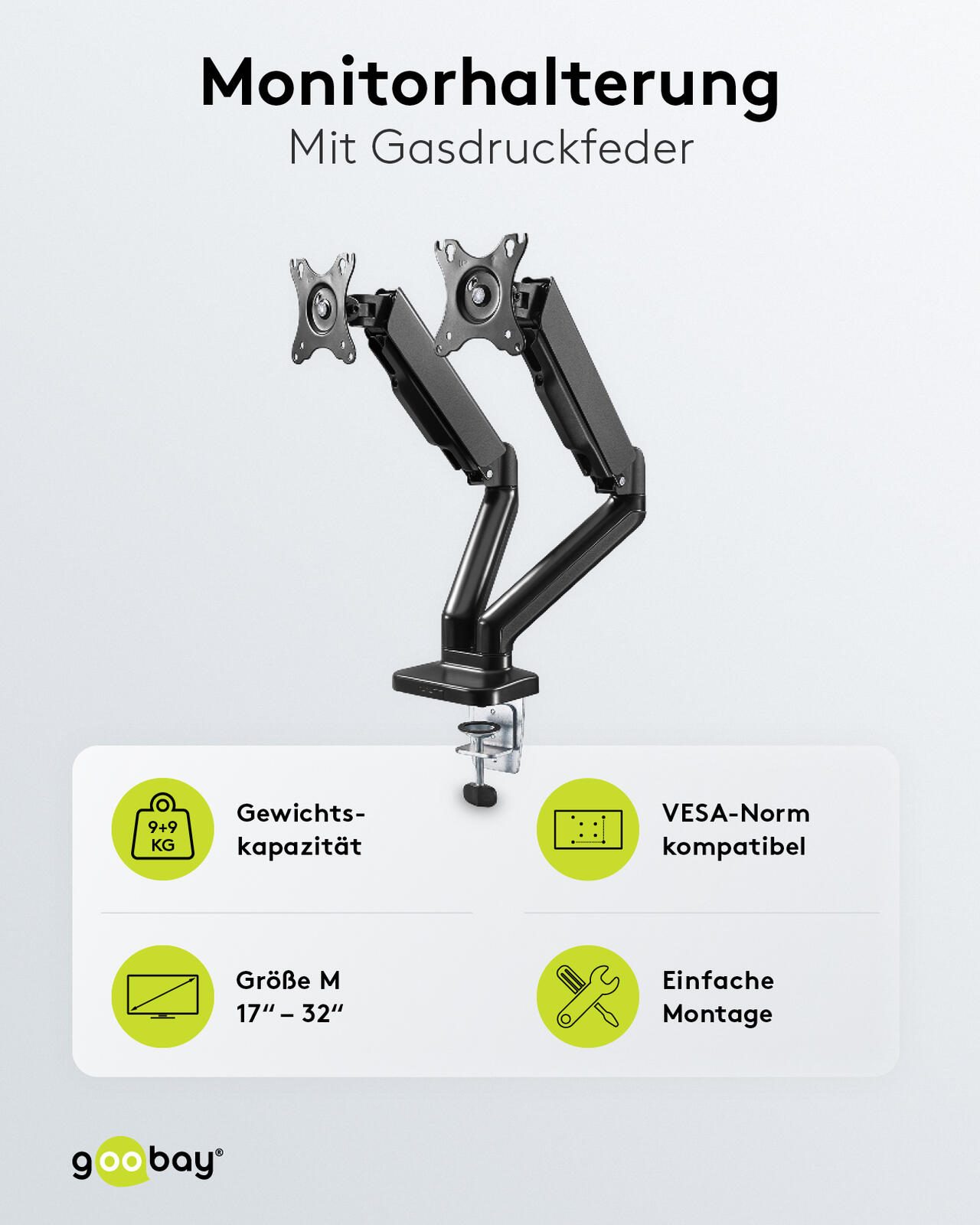 Die goobay Monitorhalterung 58531 ermöglicht die flexible und ergonomische Befestigung von zwei Monitoren mit Bildschirmgrößen von 17 bis 32 Zoll (43 bis 81 cm). Mit einer maximalen Tragkraft von 9 kg pro Arm ist sie ideal für die sichere Montage von Bildschirmen unterschiedlicher Größe und Gewichtsklasse. Die Halterung unterstützt die VESA-Standards 75 x 75 mm und 100 x 100 mm, was eine breite Kompatibilität mit gängigen Monitoren gewährleistet.