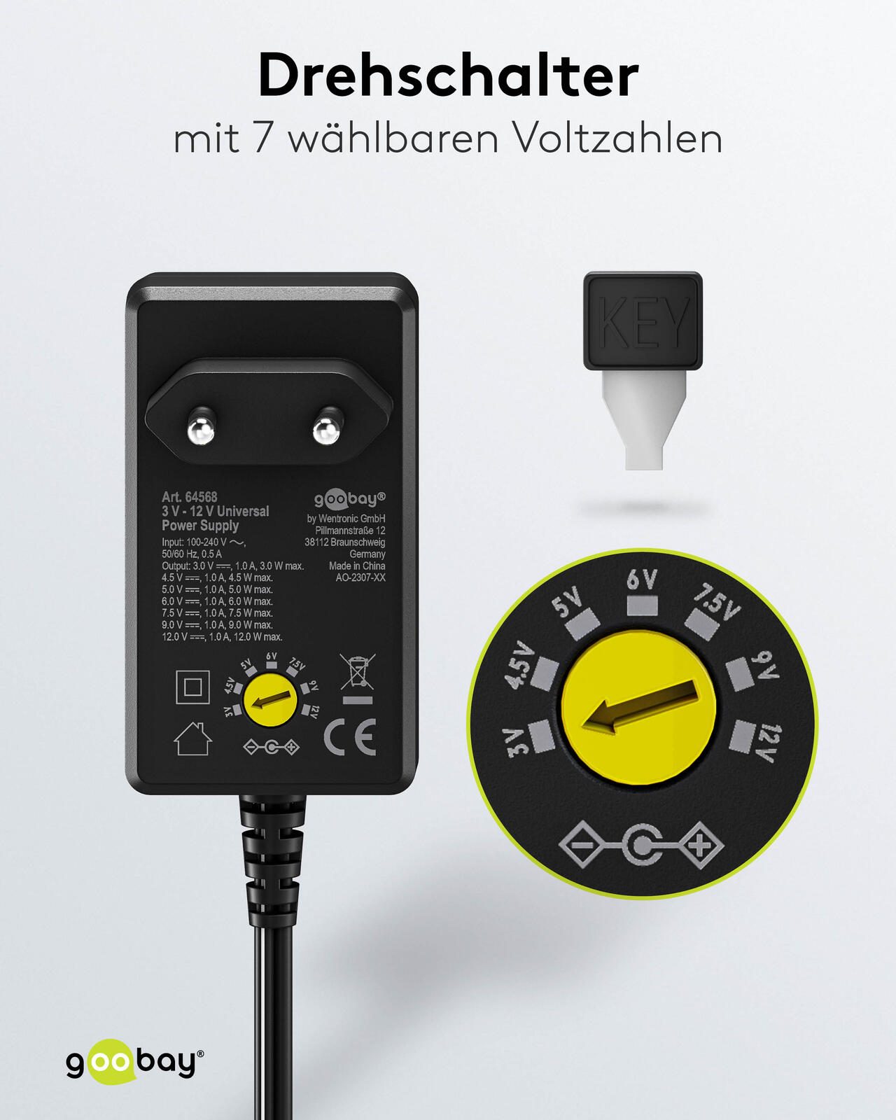 Das goobay Netzteil 64568 mit einer maximalen Ausgangsleistung von 12,0 Watt ist ein universell einsetzbares Gerät zur Stromversorgung verschiedener elektronischer Geräte. Es bietet eine Ausgangsstromstärke von 1.000 mA und verfügt über mehrere einstellbare Ausgangsspannungen von 3 V bis 12 V, darunter 3 V, 4,5 V, 5 V, 6 V, 7,5 V, 9 V und 12 V. Die Eingangsspannung liegt im Bereich von 100 bis 240 V, was einen weltweiten Einsatz ermöglicht.