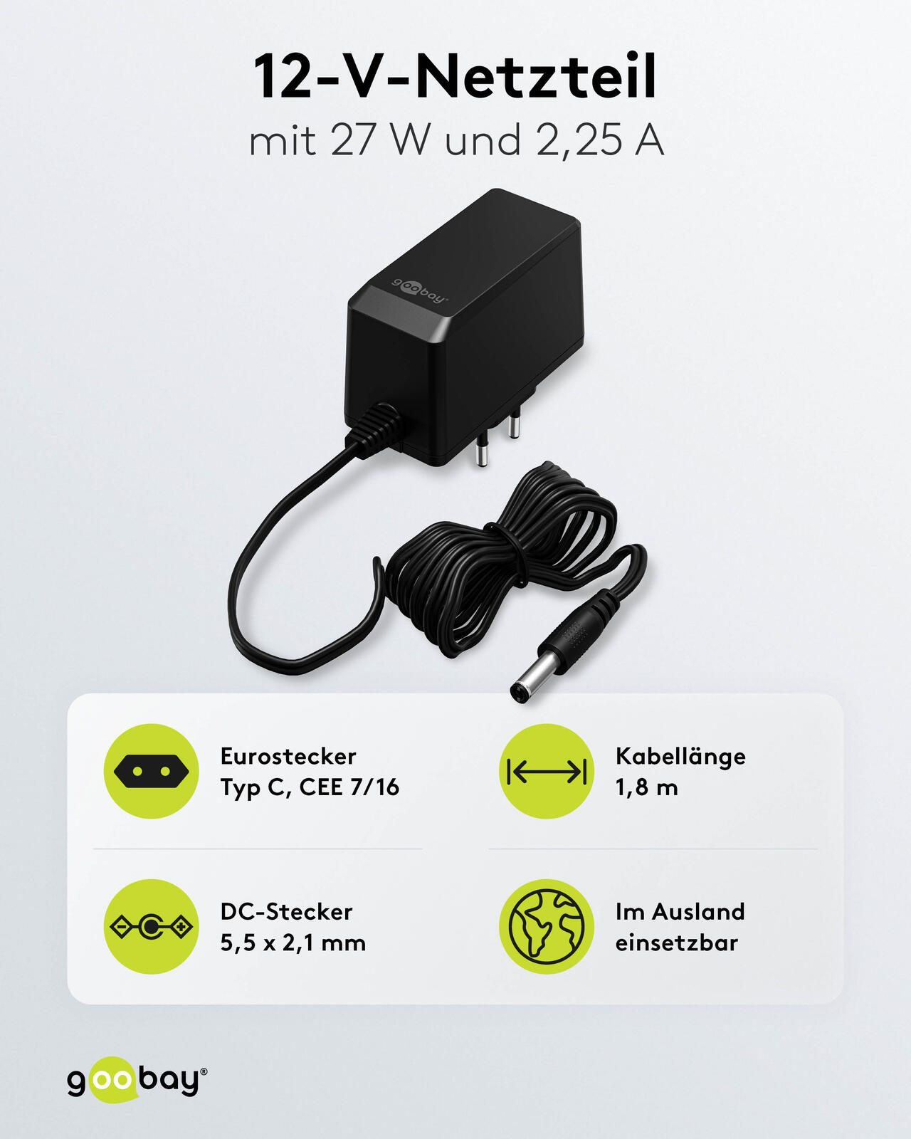 Das goobay Netzteil 64979 bietet eine maximale Ausgangsleistung von 27,0 Watt und ist speziell für Elektrogeräte mit einem DC-Stecker von 5,5 x 2,1 mm Anschluss geeignet. Es liefert eine Ausgangsspannung von 12 Volt bei einem Ausgangsstrom von 2.250 mA. Damit stellt es eine zuverlässige Stromversorgung für kompatible Geräte sicher.
