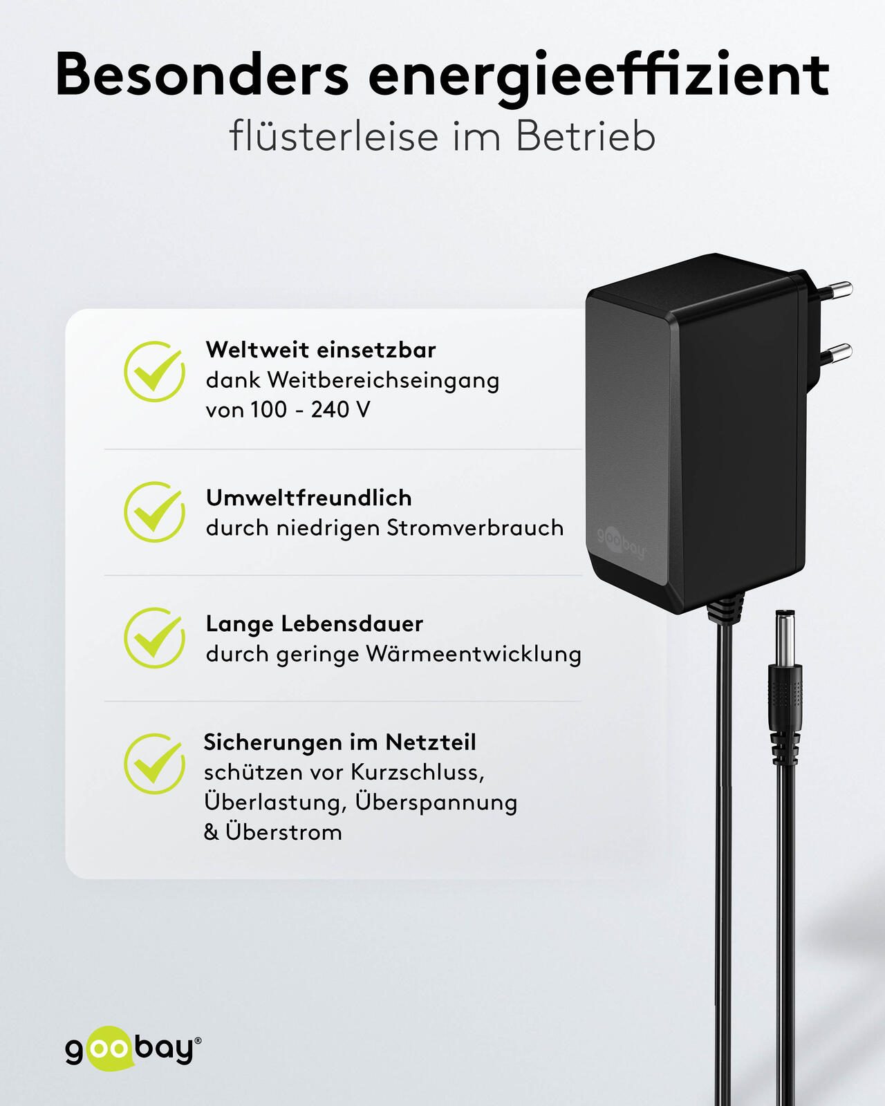 Hergestellt wird das Netzteil von der Wentronic GmbH unter der Marke goobay. Das Produkt gehört zur Kategorie Notebook- und Tablet-Zubehör und ist als Netzteil für verschiedene kompatible Elektrogeräte konzipiert. Die Kombination aus stabiler Leistung und umfassendem Schutz macht das Netzteil zu einer sicheren und praktischen Lösung für den Alltag.
