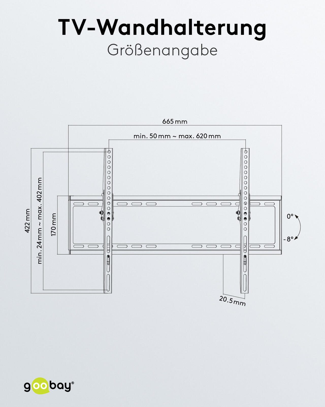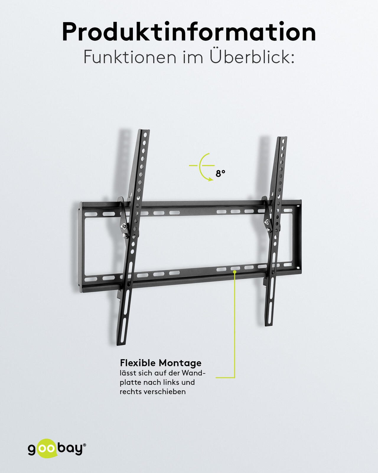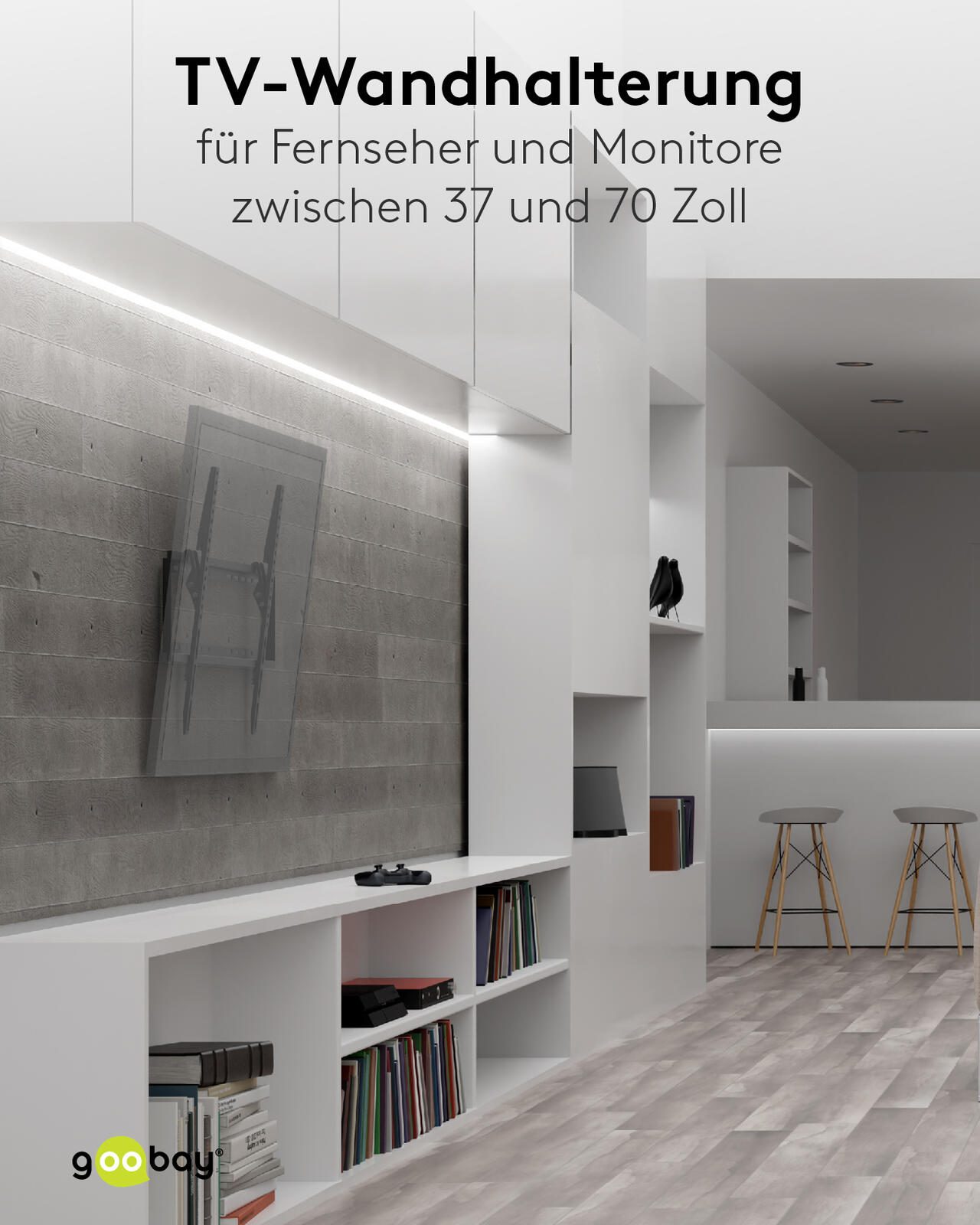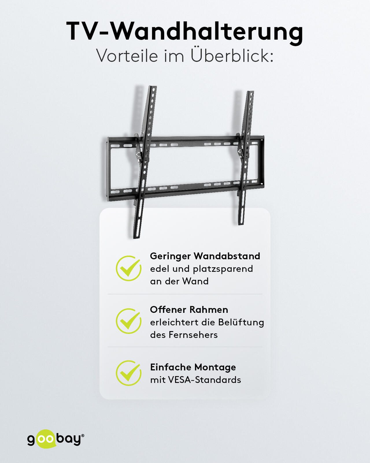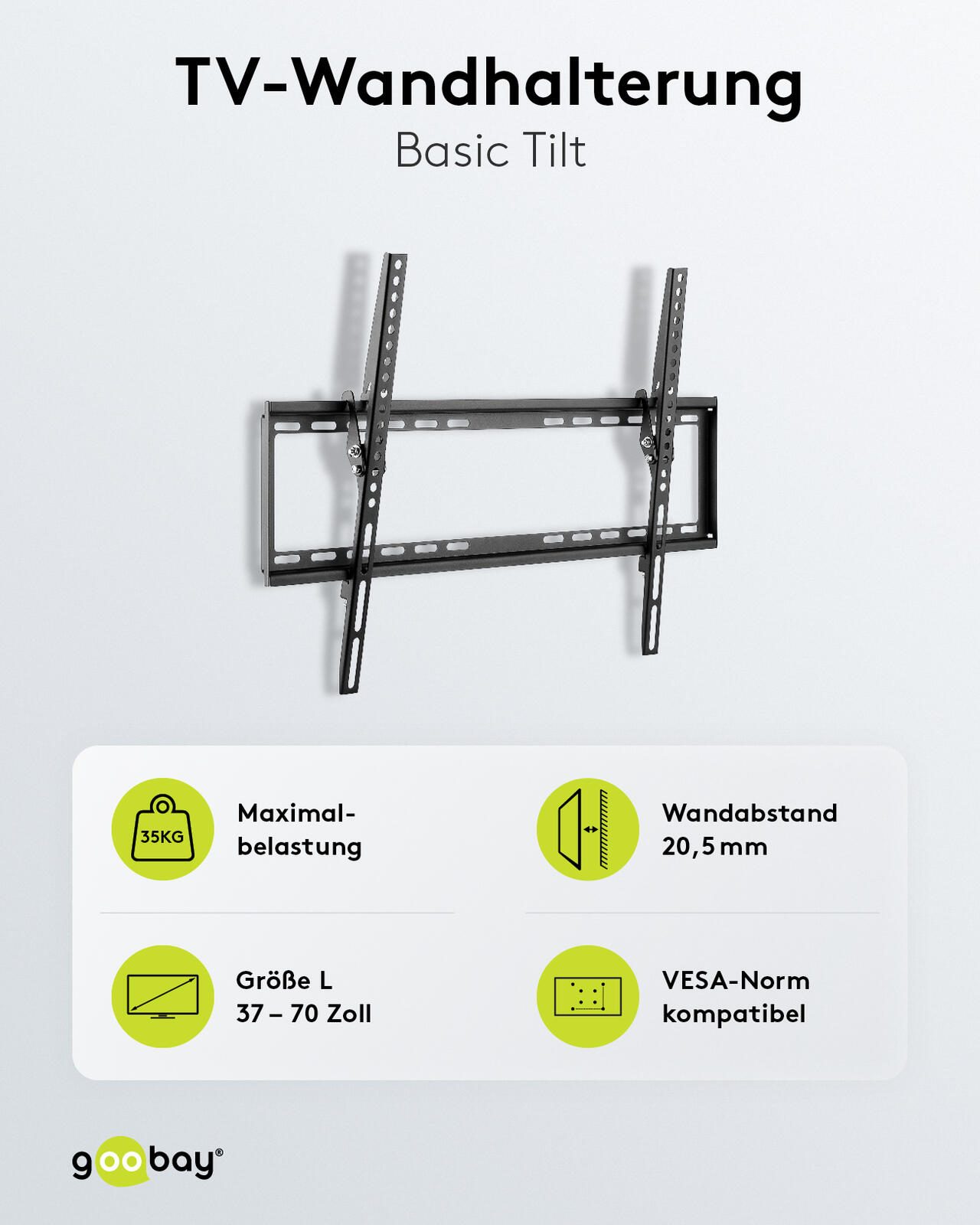 Die goobay TV-Halterung Basic TILT (L) in elegantem Schwarz bietet eine zuverlässige und stabile Lösung zur Wandmontage von Flachbildschirmen. Gefertigt aus robustem Stahl, garantiert sie eine hohe Tragkraft von bis zu 35 Kilogramm und ist damit ideal geeignet für Fernseher mit Bildschirmgrößen von 94 bis 178 cm (37 bis 70 Zoll). Die Halterung unterstützt den VESA-Standard von 200 x 200 bis 600 x 400 mm, was eine flexible Kompatibilität mit vielen gängigen TV-Modellen sicherstellt.