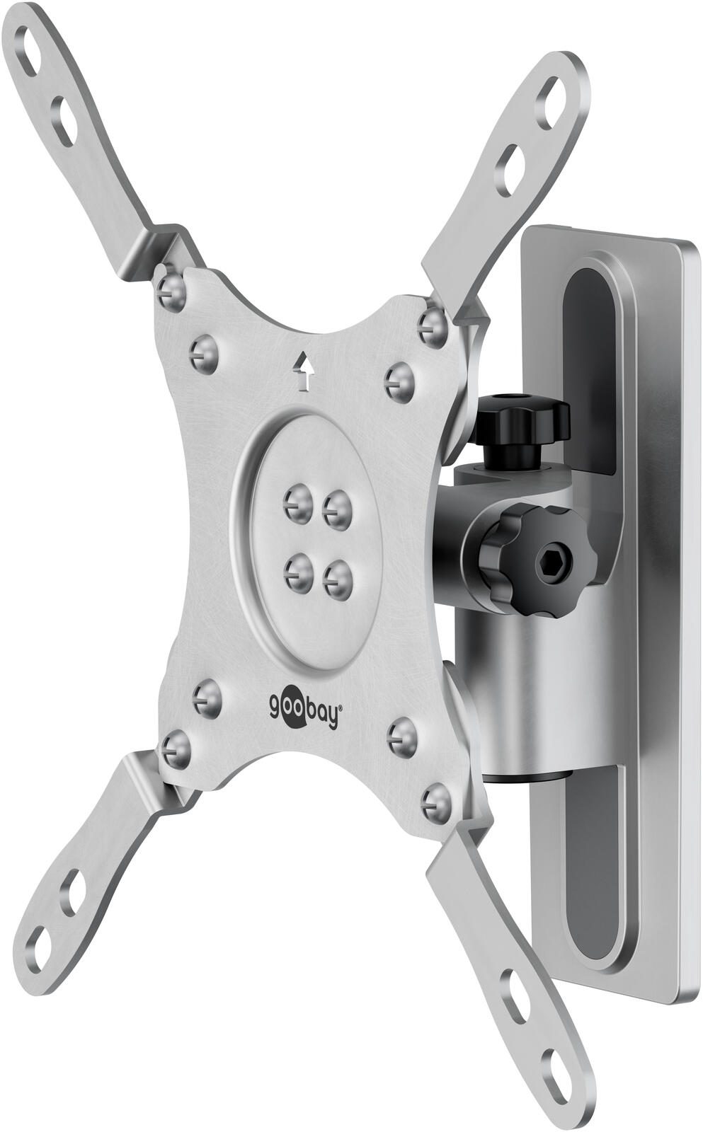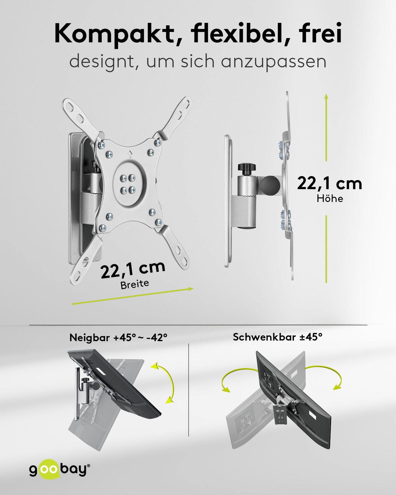 Die goobay TV-Halterung Caravan TILT (M) in elegantem Silber bietet eine flexible und stabile Lösung zur Wandmontage von Flachbildschirmen mit Bildschirmgrößen von 33 bis 109 cm (13 bis 43 Zoll). Sie unterstützt die VESA-Standards 75 x 75 bis 200 x 200 mm und ist damit kompatibel mit einer Vielzahl von Fernsehern und Monitoren. Die maximale Tragkraft beträgt 15 kg, was eine sichere Befestigung gewährleistet.