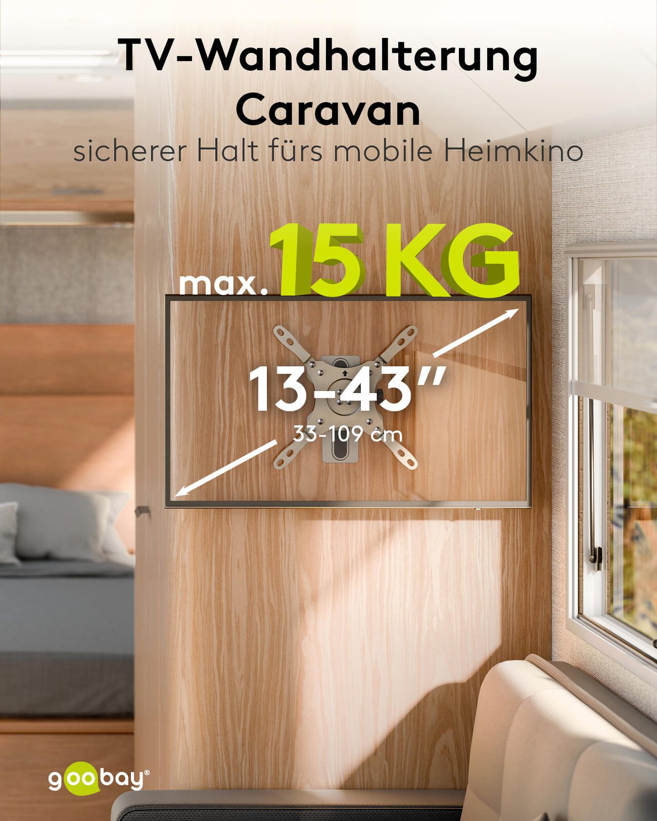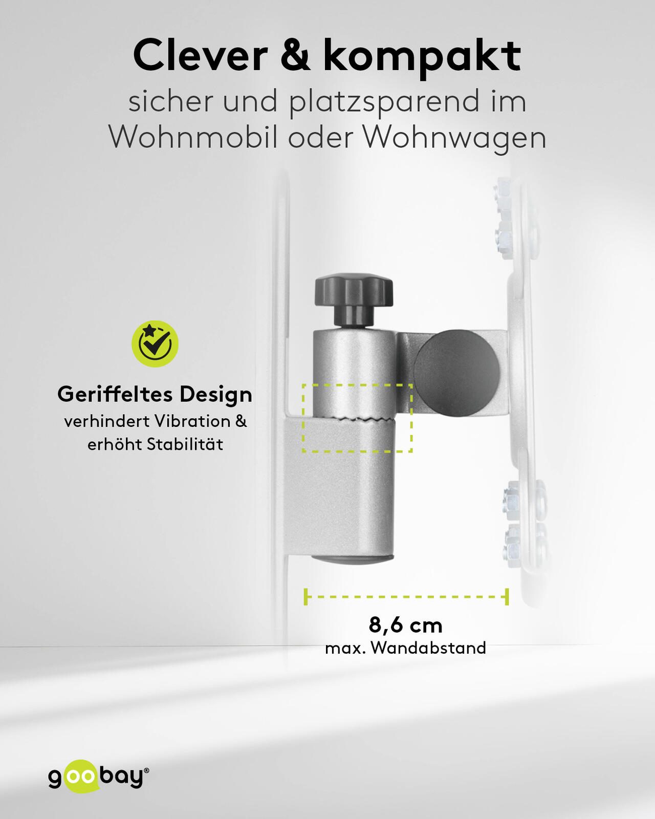 Die Halterung ist speziell für die Wandmontage konzipiert und eignet sich ideal für den Einsatz in Wohnmobilen oder Caravans, wo Platz und Flexibilität besonders wichtig sind. Die Serie Caravan TILT (M) von goobay verbindet durchdachtes Design mit hoher Funktionalität und sorgt für ein komfortables Fernseherlebnis auch unterwegs.