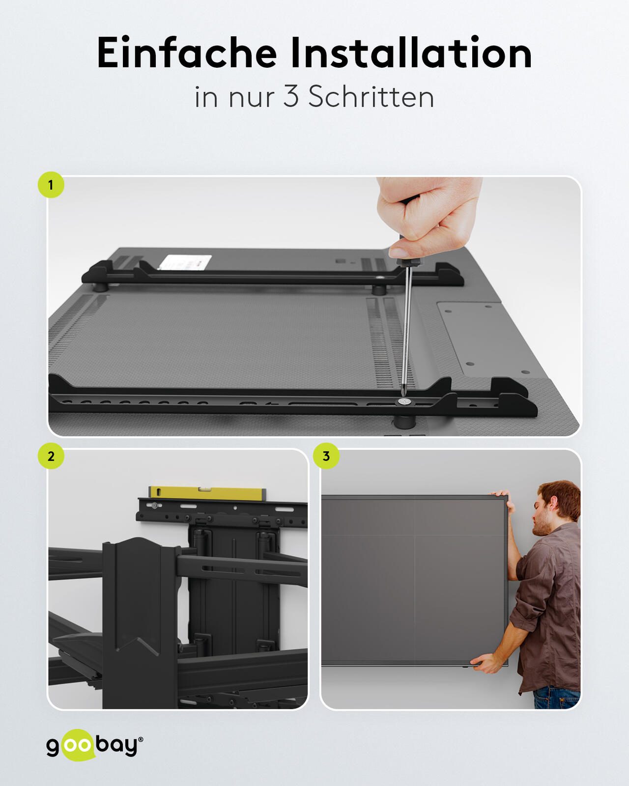 Die Montage erfolgt einfach an der Wand, wobei die Halterung mit ihrem schlichten schwarzen Farbton unauffällig und elegant wirkt. Die Kombination aus hochwertigem Stahl und durchdachtem Design sorgt für eine langlebige Lösung, die sowohl funktional als auch ästhetisch überzeugt. Die goobay TV-Halterung Pro FULLMOTION (KL) schwarz ist somit die ideale Wahl für alle, die Wert auf Flexibilität und Stabilität bei der Installation ihres Fernsehers legen.