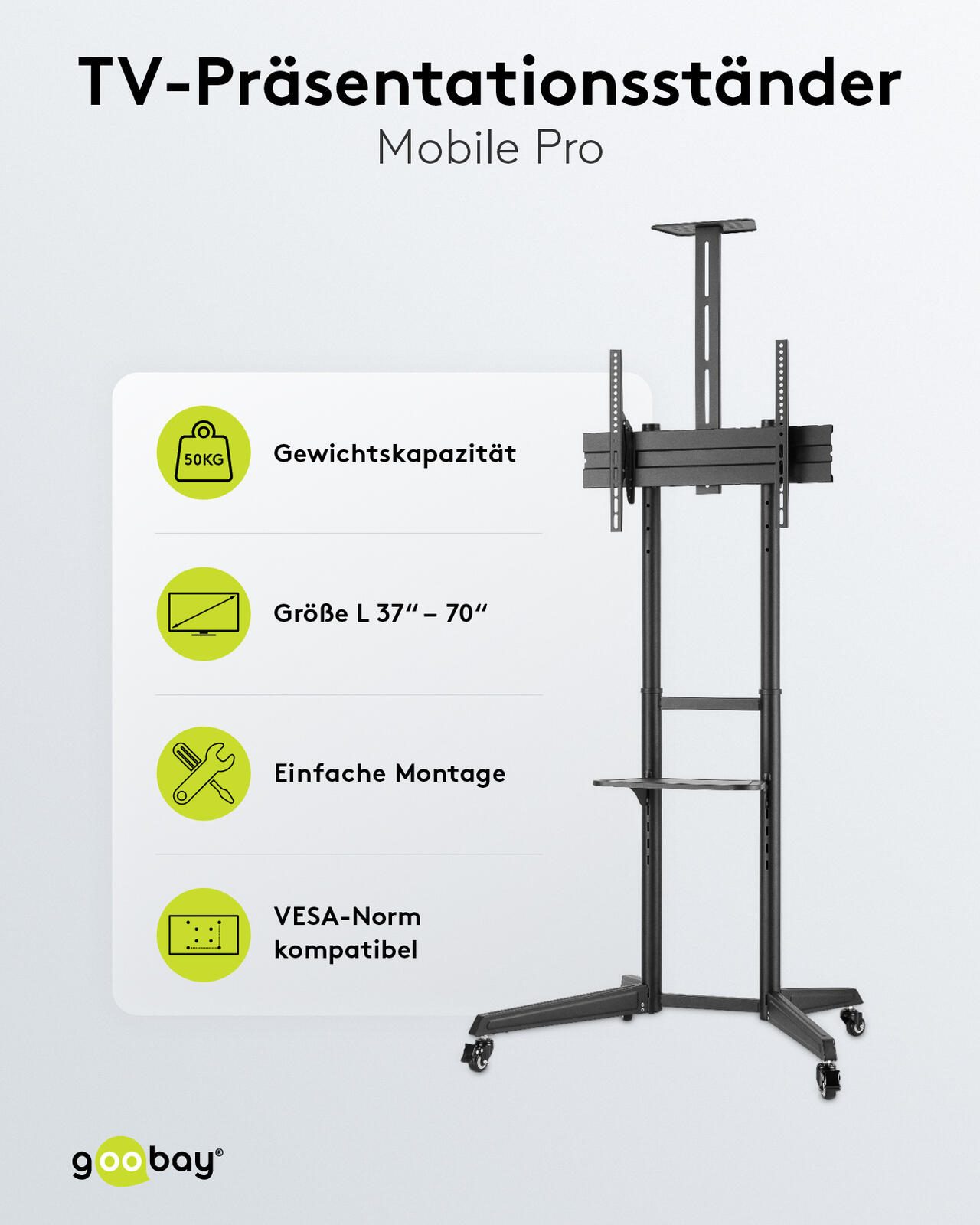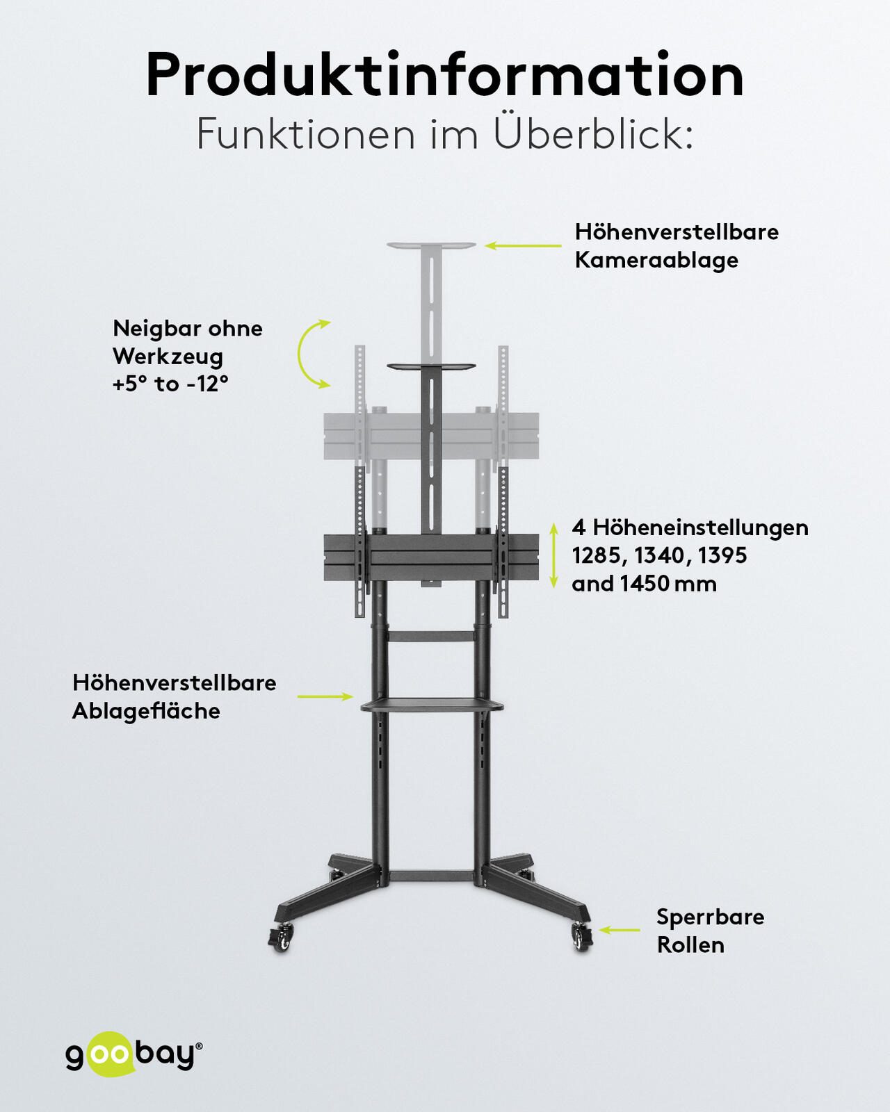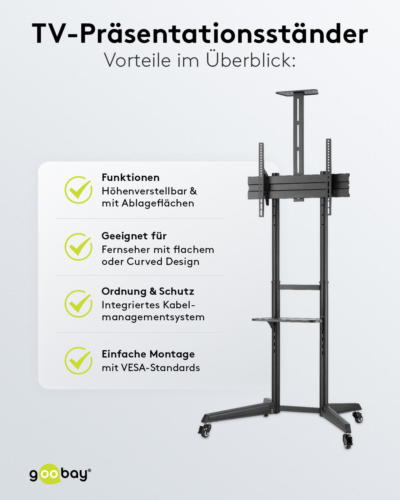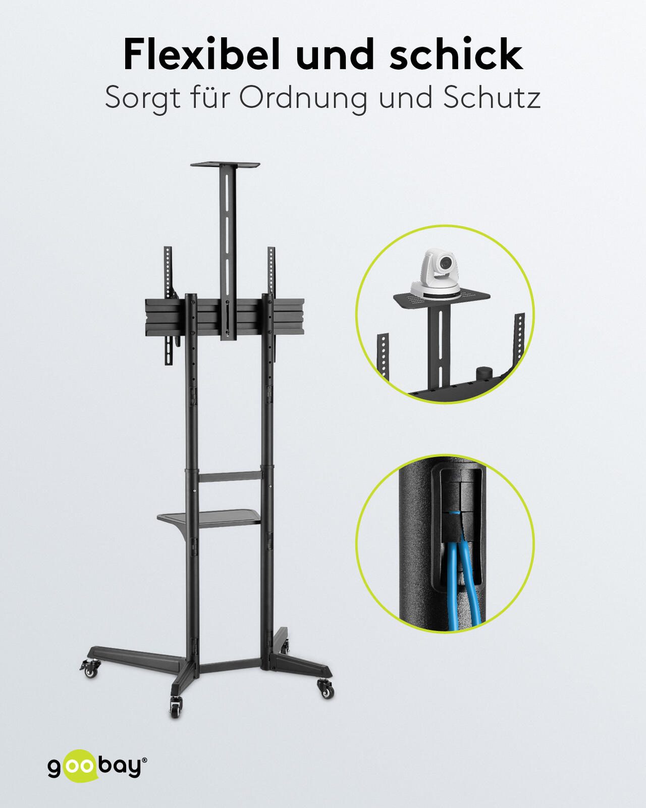 Der goobay TV-Ständer 59508 kombiniert Funktionalität und Stabilität in einem eleganten Design, das sich ideal für den Einsatz in Wohnzimmern, Büros oder Präsentationsräumen eignet. Die Kombination aus robustem Material, flexibler Verstellbarkeit und einfacher Handhabung macht ihn zu einer zuverlässigen Lösung für die sichere und komfortable Platzierung Ihres Fernsehers.