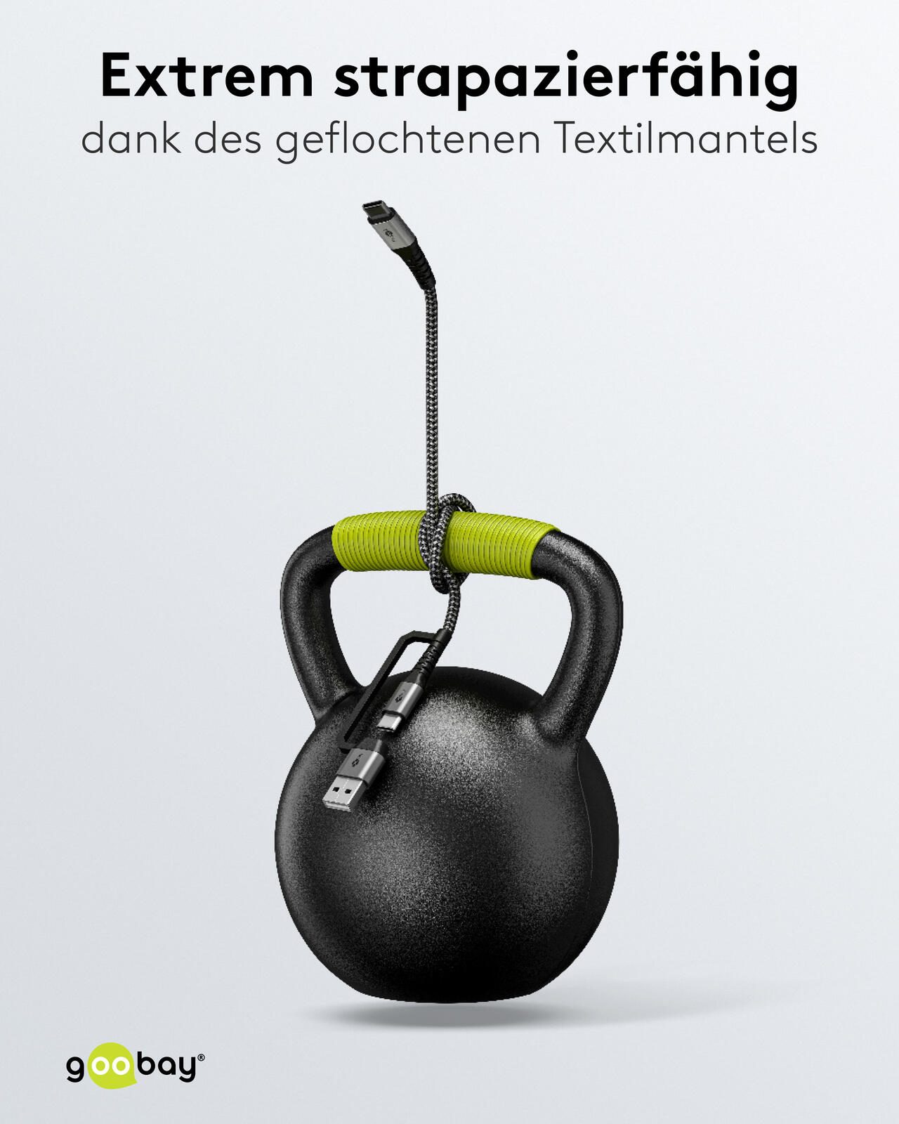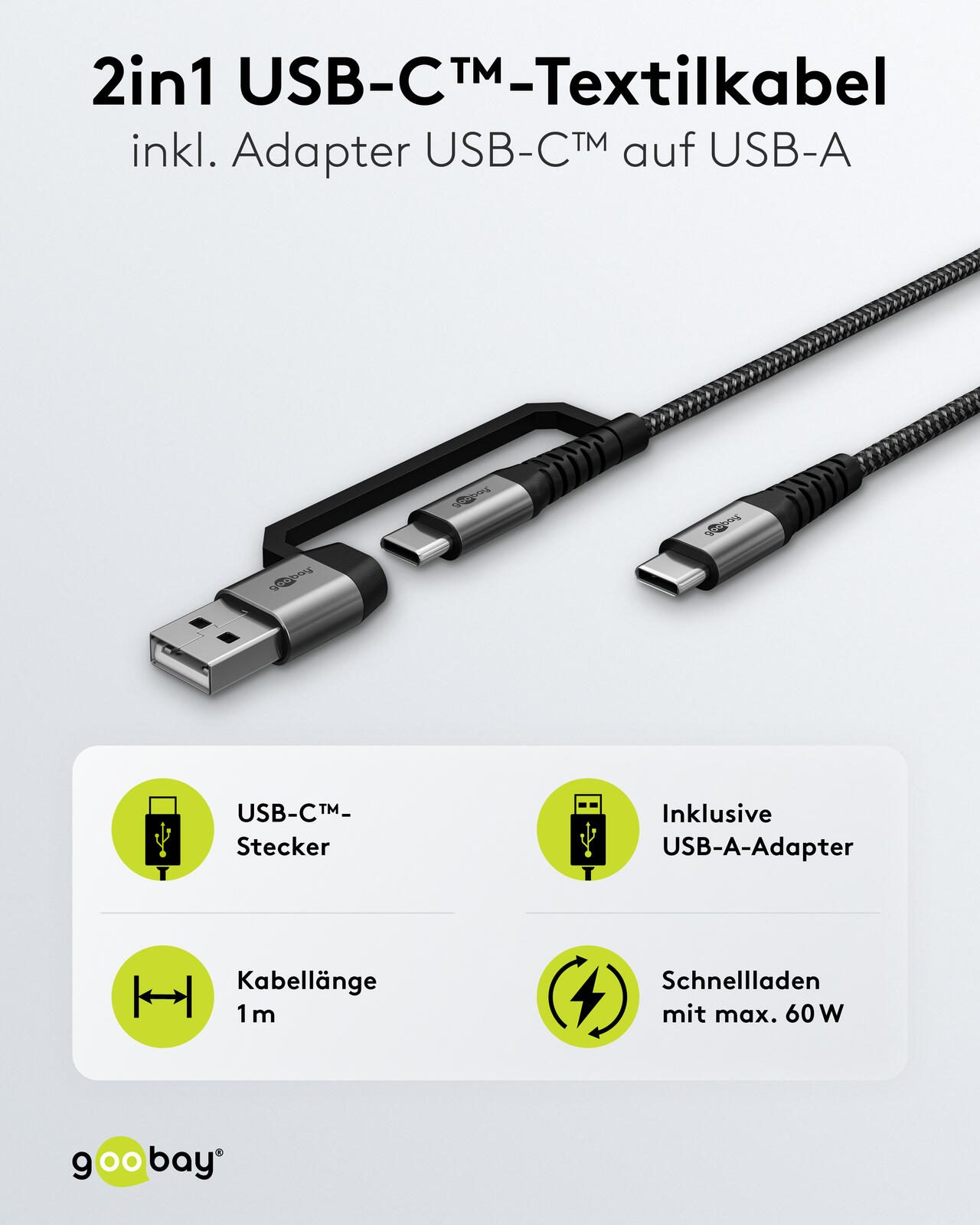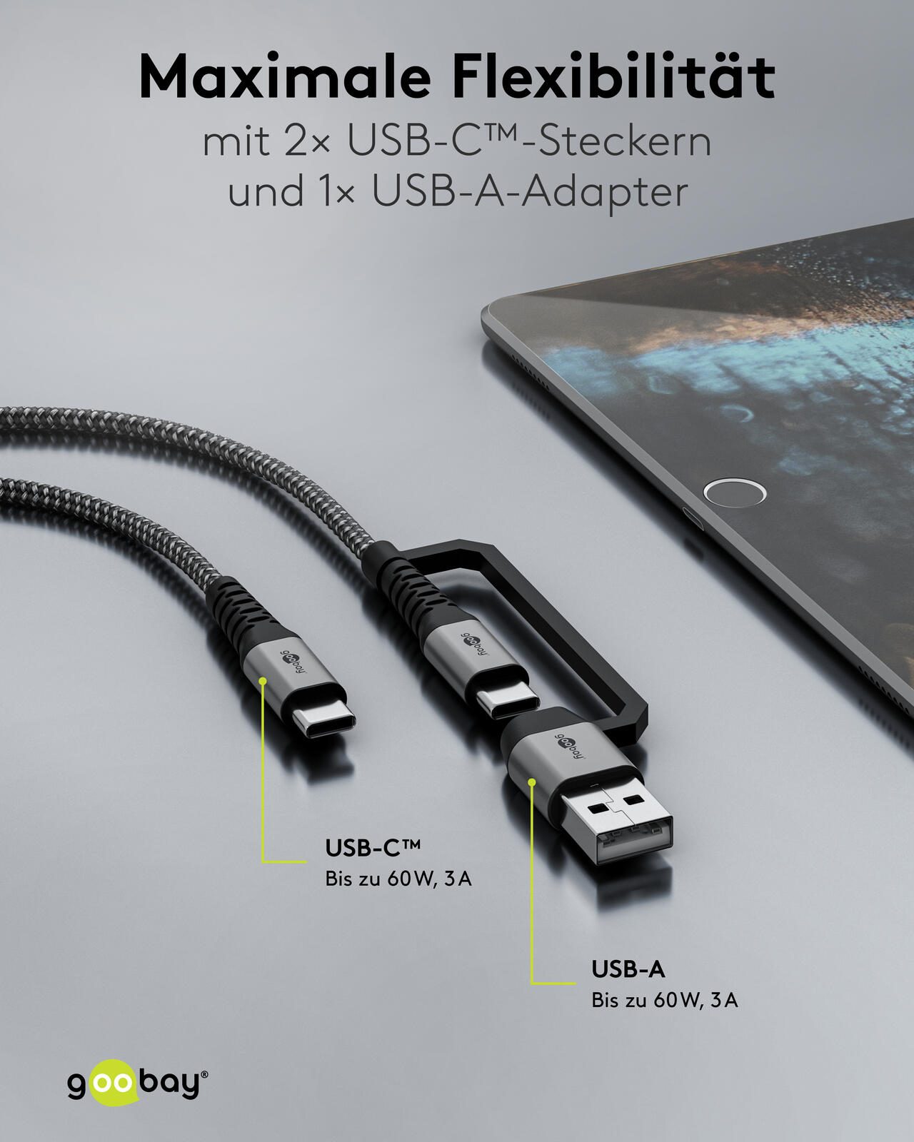 Das goobay USB 2.0 C/USB 2.0 C USB-Kabel bietet eine Kabellänge von 1,0 Meter und ist in den Farben grau und schwarz erhältlich. Es ist mit USB 2.0 C-Steckern an beiden Enden ausgestattet, wobei ein Anschluss alternativ auch als USB 2.0 A-Stecker ausgeführt ist. Dieses Kabel eignet sich zum Verbinden und Laden von Geräten mit entsprechenden USB-Anschlüssen.