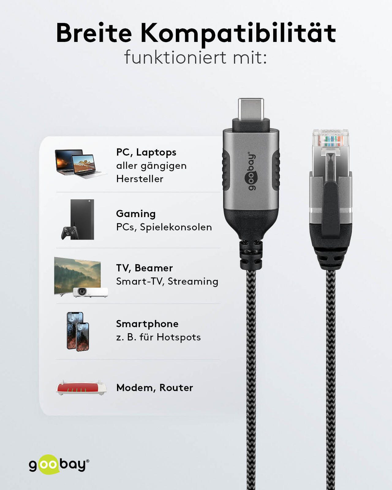 goobay USB-C/RJ45 Kabel 10m silber, schwarz