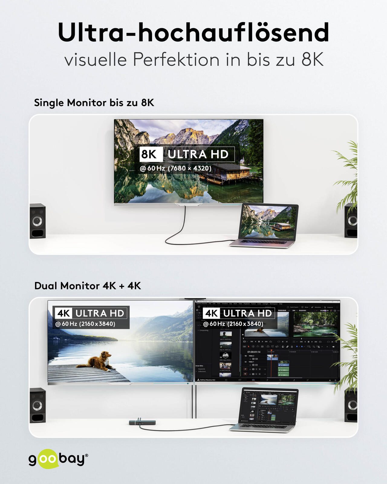 - Unterstützt Auflösungeb bis zu 8K mit 60 Hz bzw. 4K mit 120 Hz, Untersützt Power Delivery mit 240 W