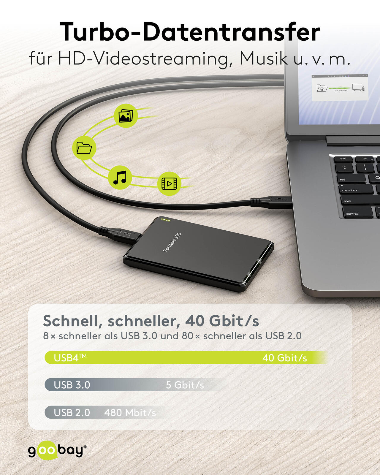 Das goobay USB4 Kabel mit einer Länge von 1 Meter überzeugt durch seine vielseitigen Einsatzmöglichkeiten und hohe Leistungsfähigkeit. Es unterstützt Auflösungen bis zu 8K bei 60 Hz sowie 4K bei 120 Hz, was es ideal für anspruchsvolle Anwendungen wie hochauflösendes Videostreaming oder professionelle Grafikbearbeitung macht. Damit garantiert es eine brillante Bildqualität und flüssige Darstellung.