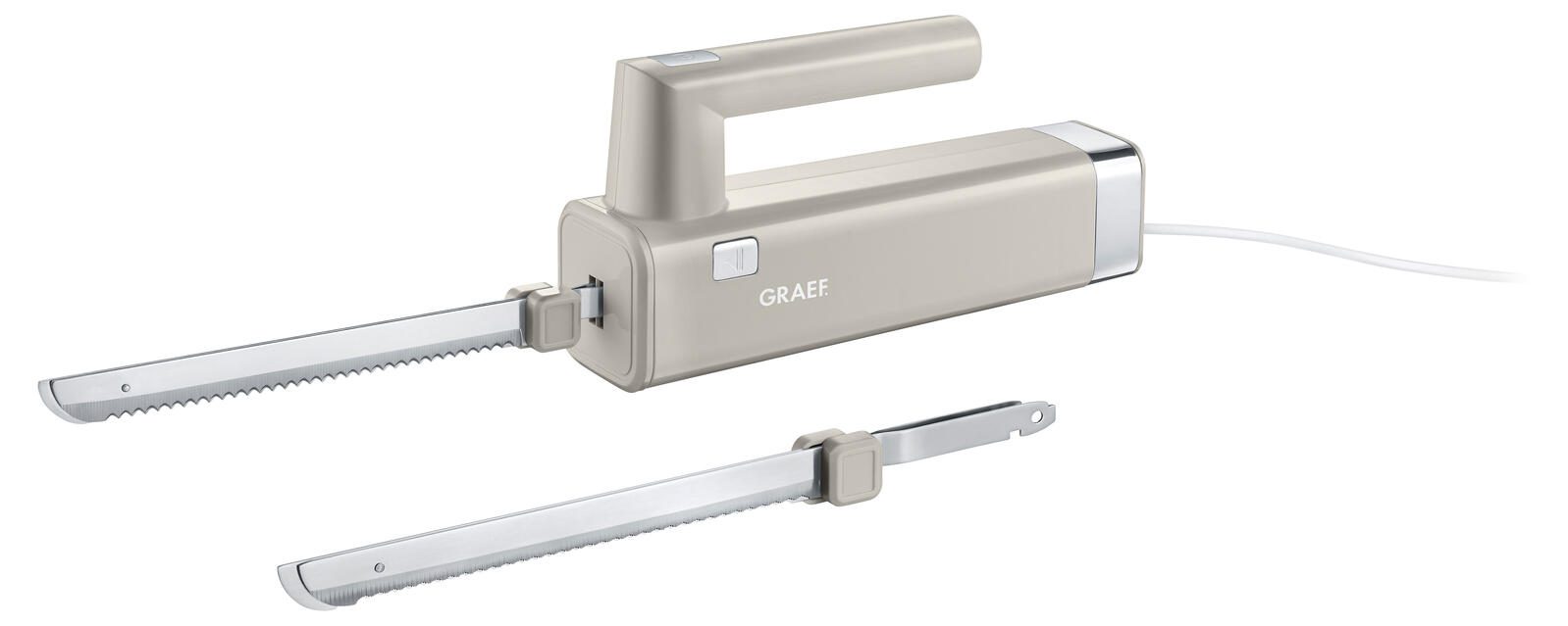 Das GRAEF EK508 Elektrische Messer in elegantem Taupe verbindet modernes Design mit hoher Funktionalität. Ausgestattet mit einem leistungsstarken 150-Watt-Motor ermöglicht es müheloses und präzises Schneiden verschiedenster Lebensmittel. Die professionellen Wellenschliffklingen sorgen für saubere Schnitte, während die spezielle Tiefkühlklinge das Schneiden von gefrorenen Produkten erleichtert. Die Klingen sind aus hochwertigem Edelstahl gefertigt und gewährleisten somit Langlebigkeit und Hygiene.