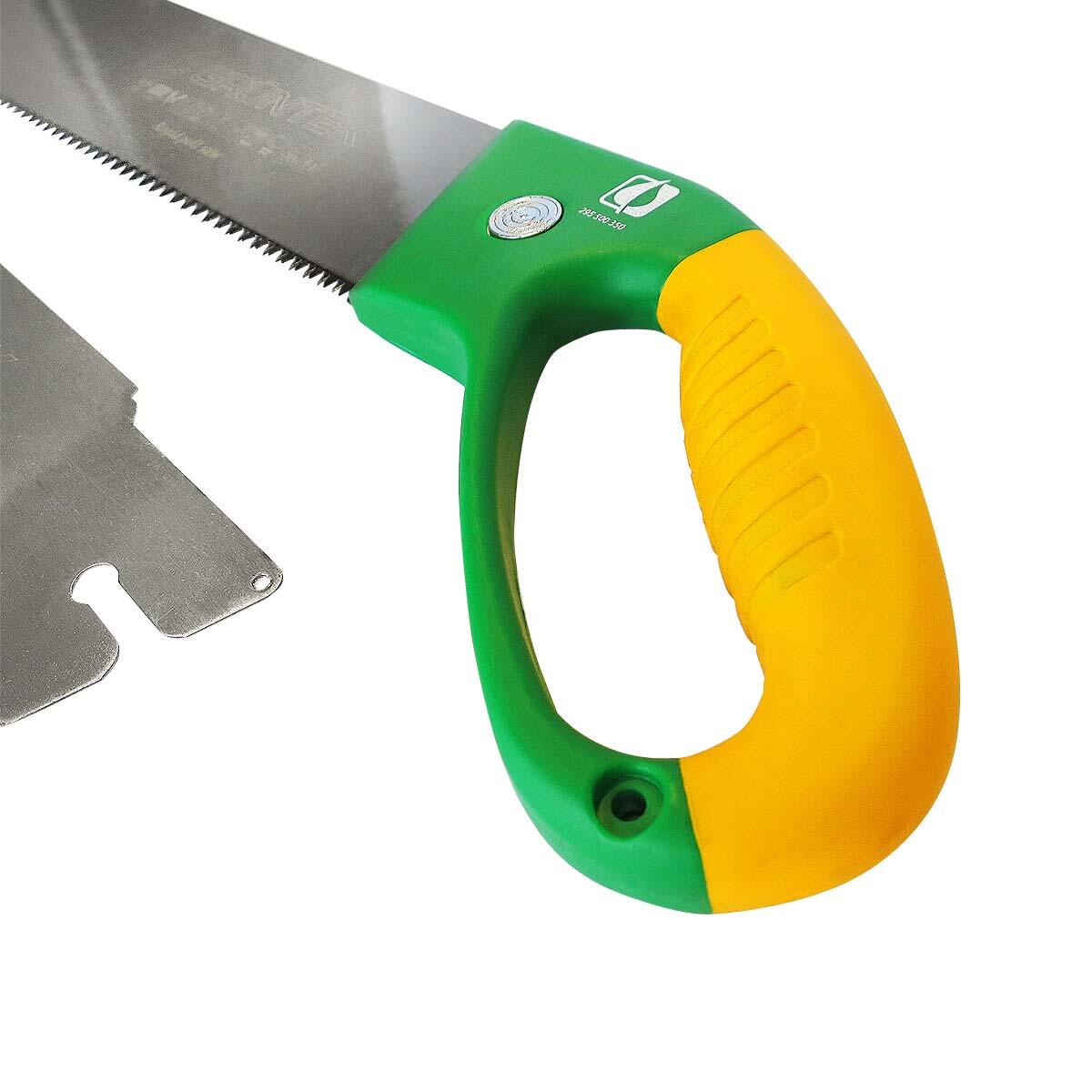 - Besonderheiten: 3D-Schliff je Zahn, gehärtetes Sägeblatt, ergonomisch geformter Anti-Rutsch-Griff, Aufhängeloch, stoßfester ABS-Kunststoff, gummierter Griff, auswechselbare Sägeblätter, zwei Sägeblätter im Lieferumfang enthalten