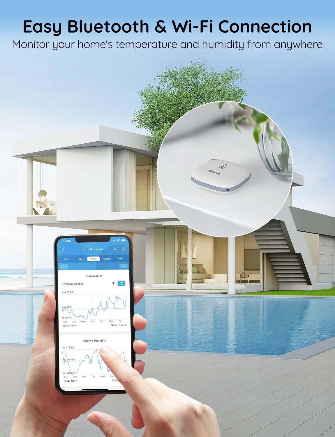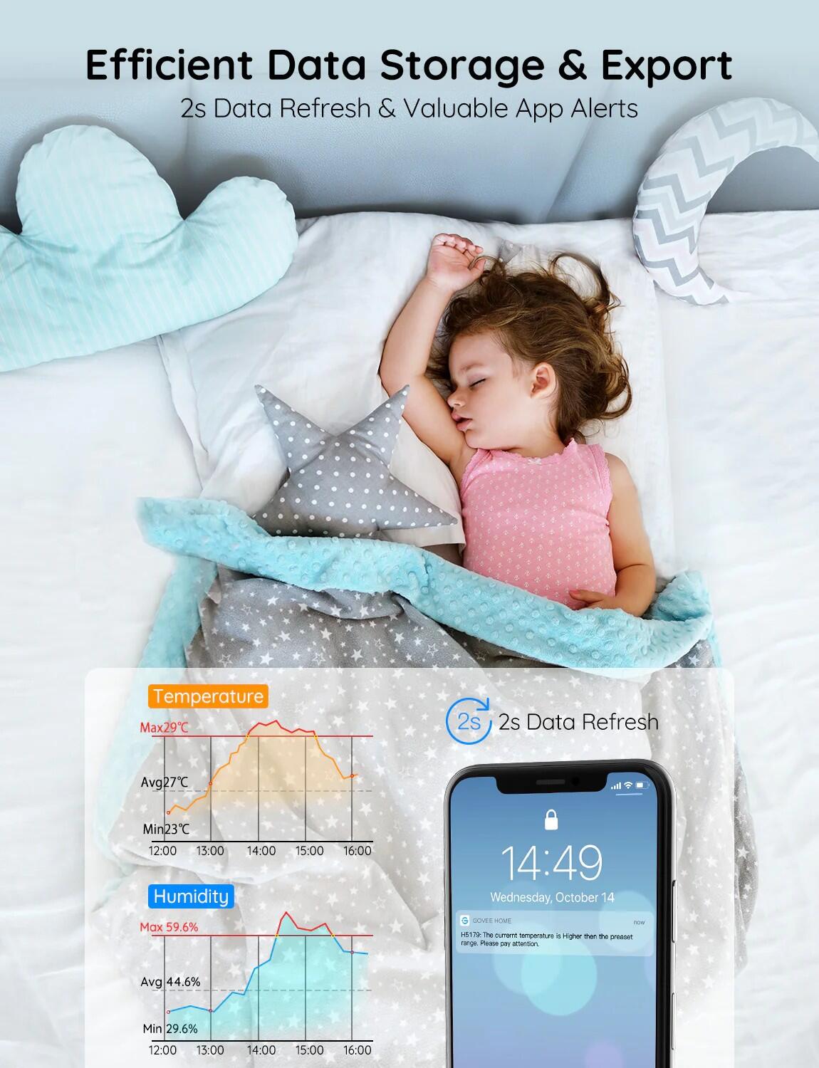 - Sofortige Benachrichtigungen: Legen Sie voreingestellte Temperatur- und Luftfeuchtigkeitsbereiche fest und erhalten Sie sofort eine App-Benachrichtigung, wenn die Werte außerhalb des Bereichs liegen.