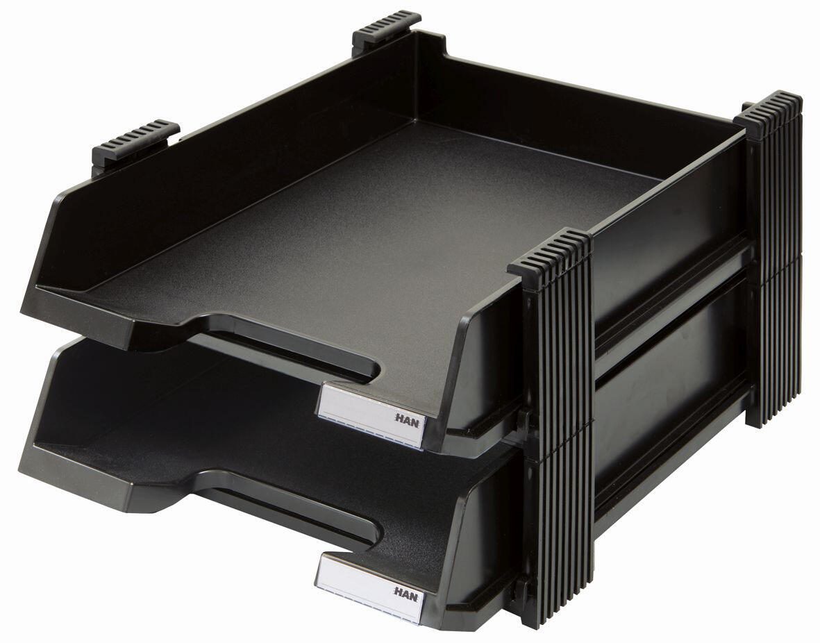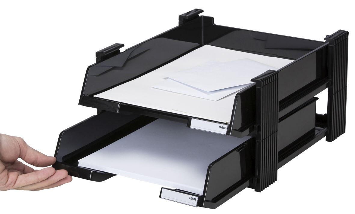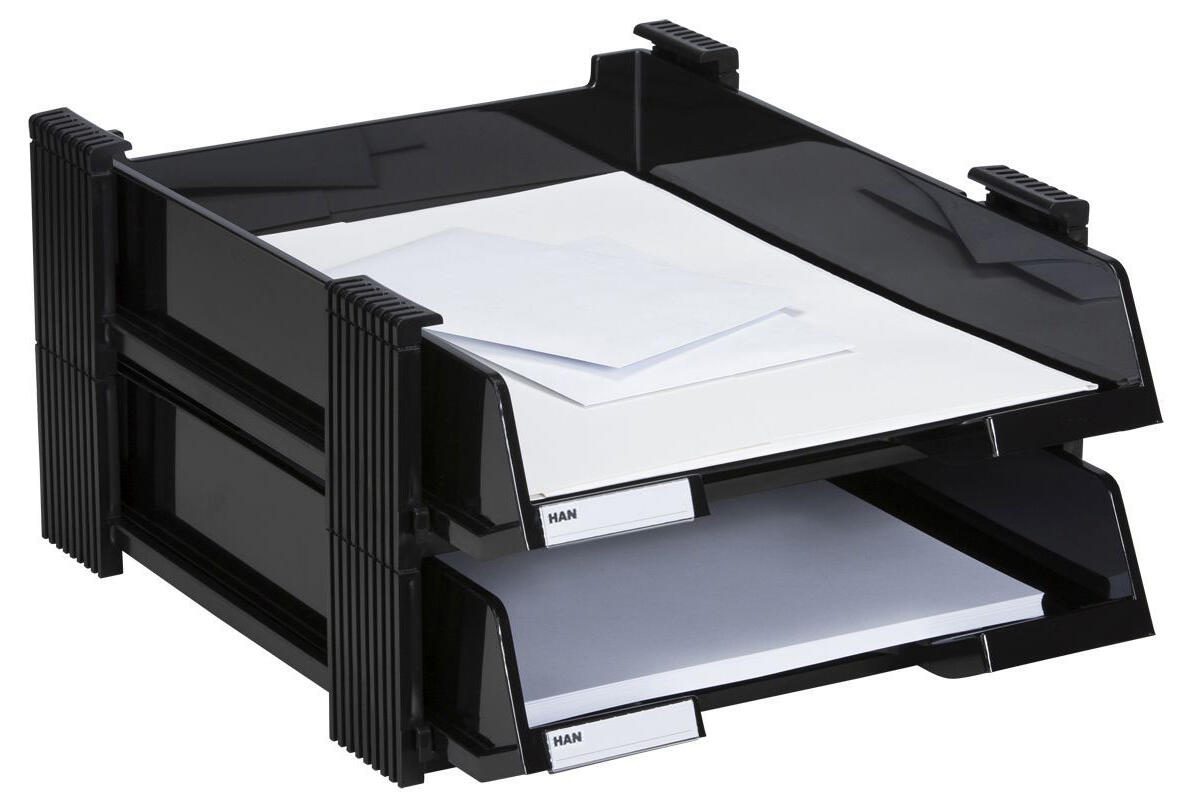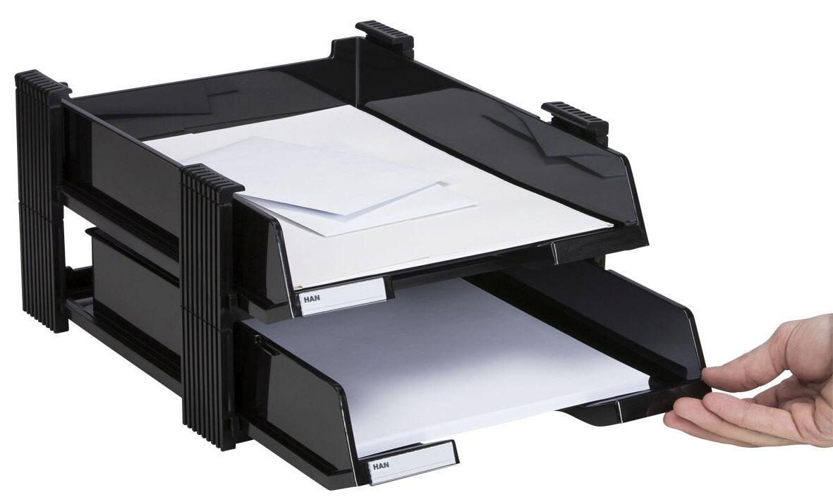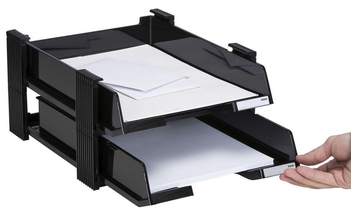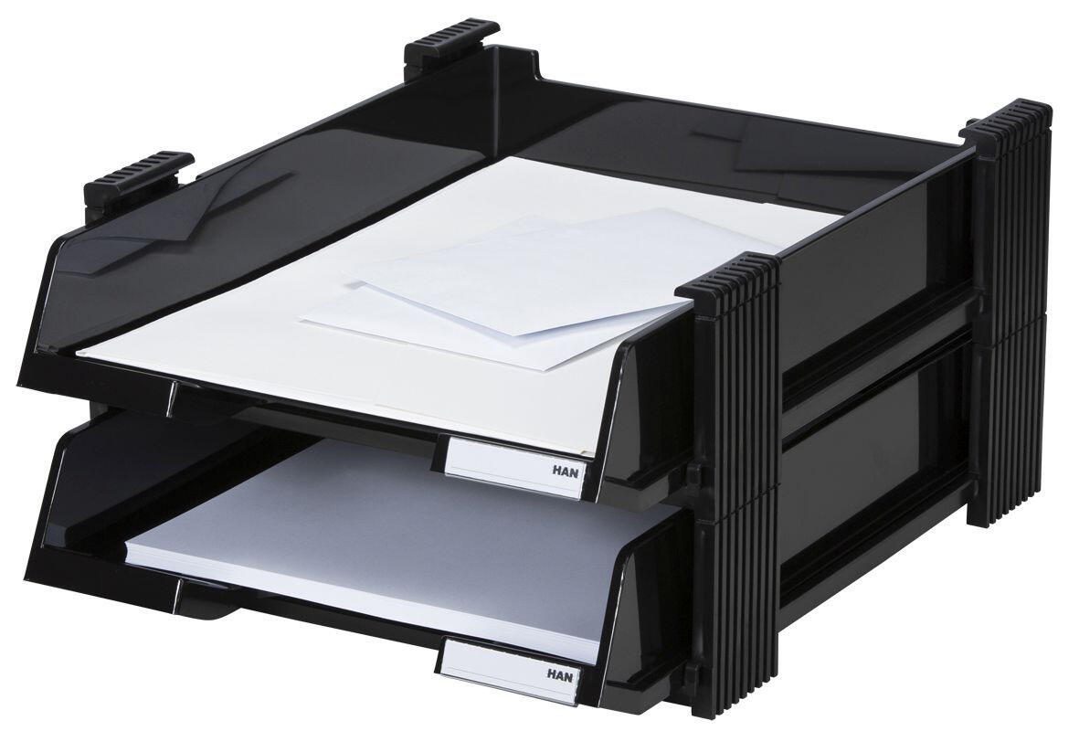 Das HAN Briefablagen-Set DIN C4 in elegantem Schwarz vereint Funktionalität und ansprechendes Design. Mit einem robusten Stapelgestell bietet dieses Set eine optimale Lösung, um deine Dokumente und Unterlagen ordentlich zu organisieren. Die Ablagen sind speziell für das Format DIN C4 konzipiert und ermöglichen es dir, auch größere Dokumente mühelos zu verstauen. Die Außenmaße von 27,4 x 35,0 x 16,3 cm machen das Set zu einem platzsparenden Begleiter auf deinem Schreibtisch oder im Regal. Hergestellt aus hochwertigem Polystyrol, zeichnet sich das Material durch seine Langlebigkeit und Widerstandsfähigkeit aus. Die schwarze Farbgebung sorgt für eine moderne Optik und fügt sich harmonisch in jede Büroeinrichtung ein. Ein weiteres Highlight ist die Stapelbarkeit der Ablagen. Du kannst mehrere Einheiten übereinanderstellen, um den verfügbaren Platz optimal zu nutzen und gleichzeitig einen aufgeräumten Eindruck zu hinterlassen. Dies ist besonders vorteilhaft in kleinen Büros oder bei der Arbeit von zu Hause aus, wo jeder Zentimeter zählt. Das HAN Briefablagen-Set ist nicht nur praktisch, sondern auch stilvoll. Es ist ideal für alle, die Wert auf Ordnung und Ästhetik legen. Mit diesem Set bringst du Struktur in deinen Arbeitsbereich und schaffst eine Umgebung, in der du effizient arbeiten kannst. Die Kombination aus Funktionalität, Qualität und zeitlosem Design macht dieses Produkt zu einer ausgezeichneten Wahl für jeden, der seine Unterlagen professionell verwalten möchte.Technische Daten