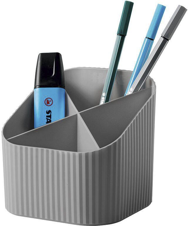 Der HAN Stiftehalter Han Köcher Re-X-Loop in grau ist nicht nur ein praktisches Utensil für deinen Schreibtisch, sondern auch umweltfreundlich. Die Maße von 11,1 x 12,1 x 10,6 cm bieten genügend Platz für deine Stifte und Büroaccessoires, denn dieser Stiftehalter verfügt über insgesamt 4 Fächer.