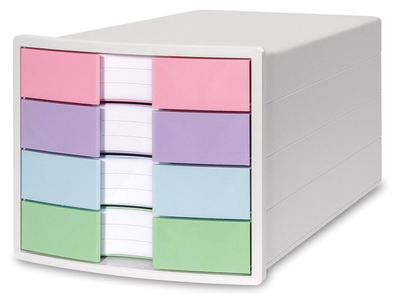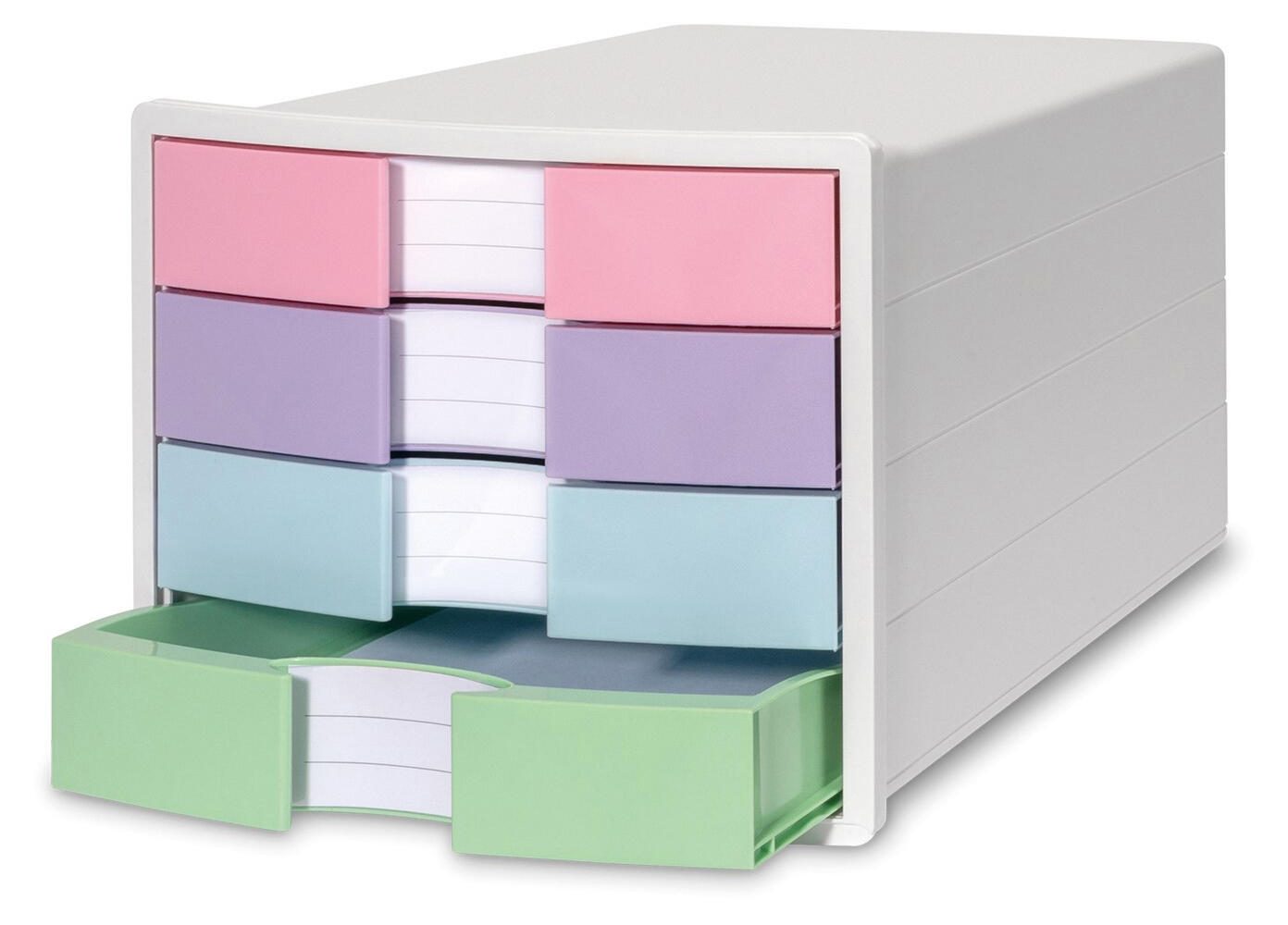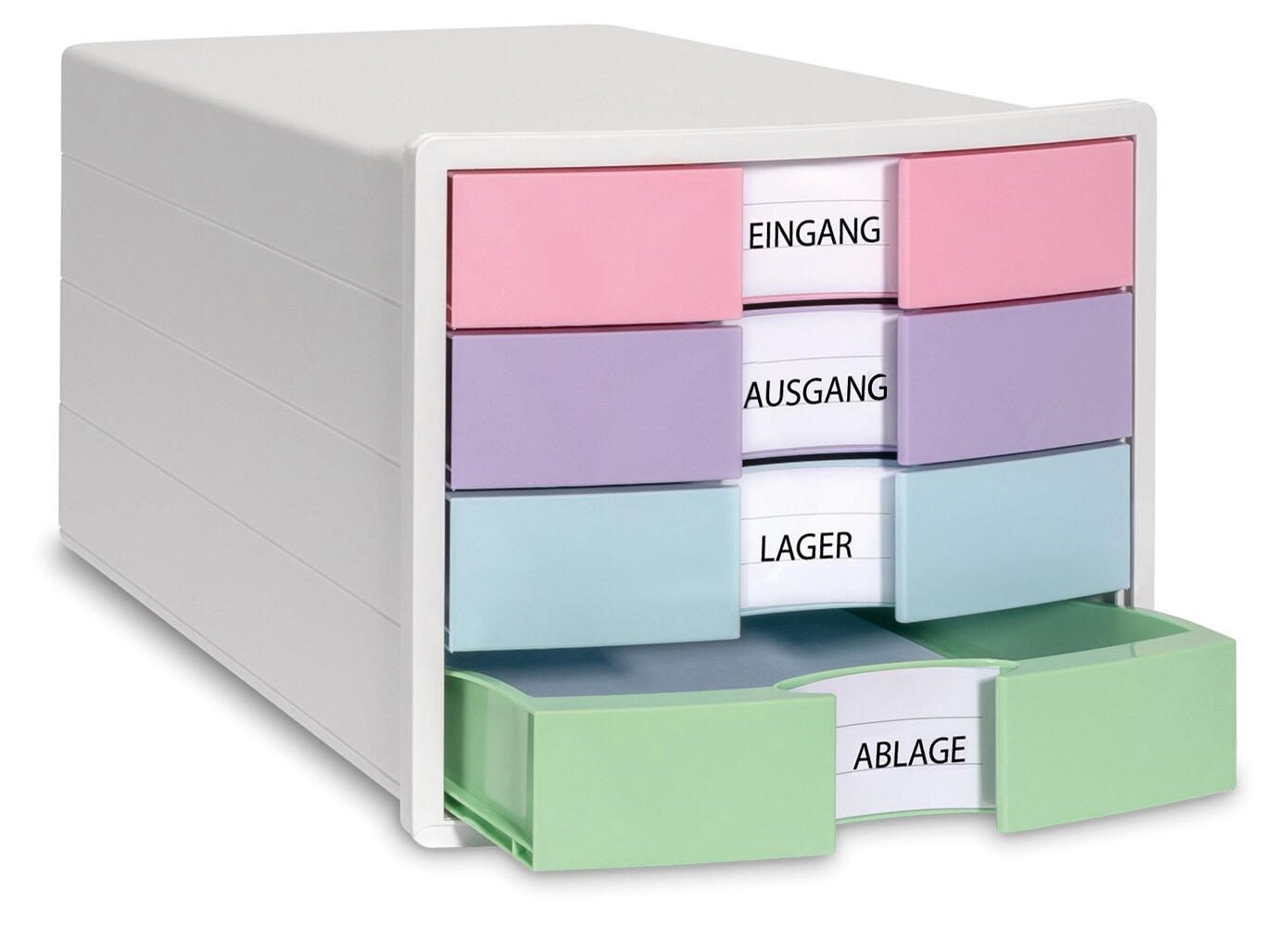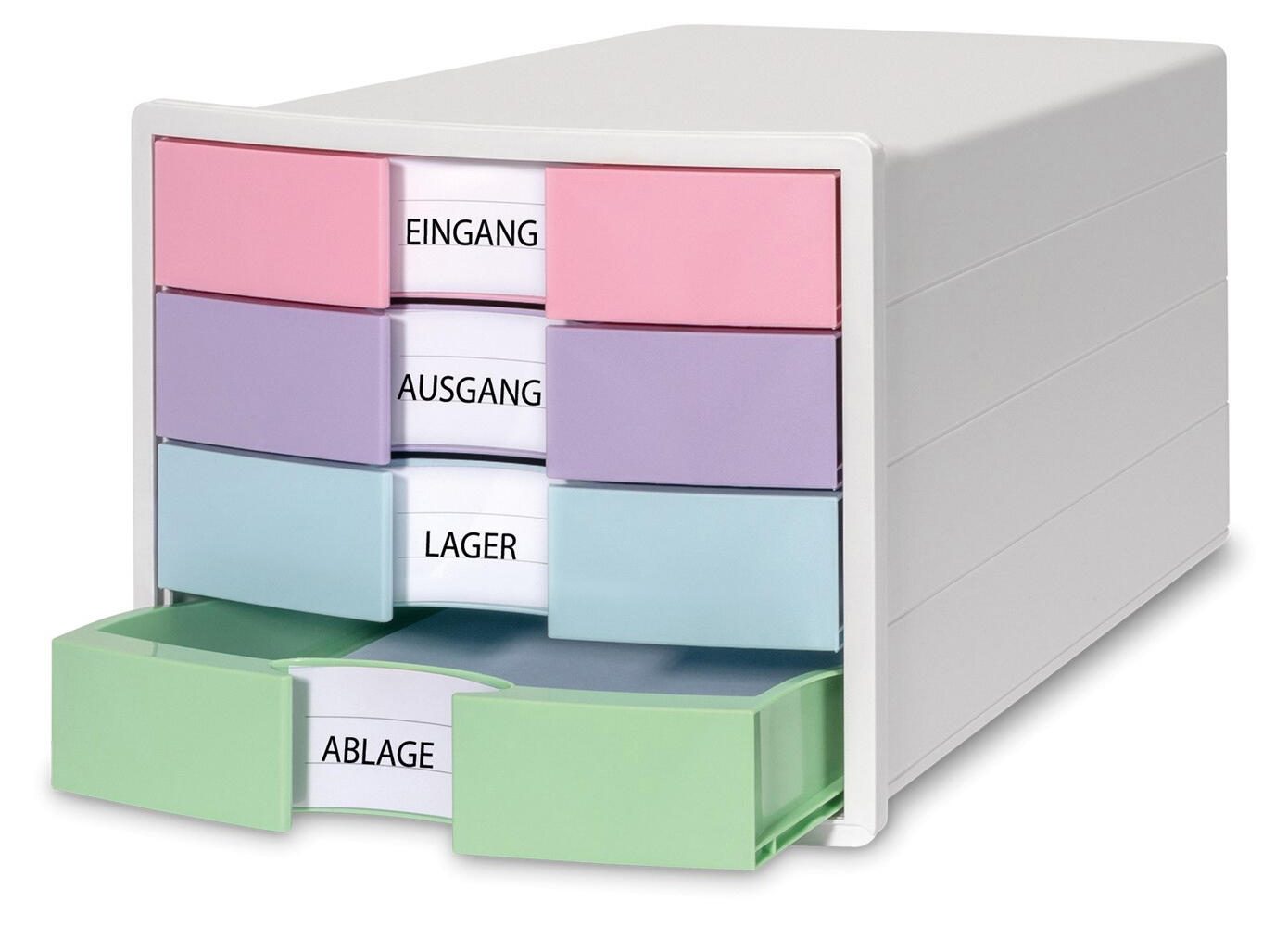 Die HAN Schubladenbox IMPULS DIN A4 geschlossen ist eine praktische Aufbewahrungslösung für Dokumente im Format DIN A4 und DIN C4. Sie besteht aus robustem Polystyrol-Kunststoff und verfügt über vier geschlossene Schubladen, die eine ordentliche und sichere Aufbewahrung ermöglichen. Die Schubladen sind in den Farben Rosa, Lila, Blau und Grün gehalten, wodurch sich die Box farblich an verschiedene Arbeitsumgebungen anpassen lässt.