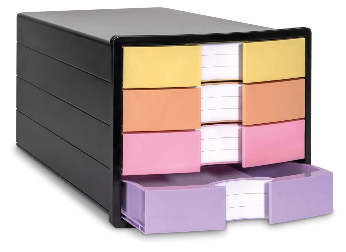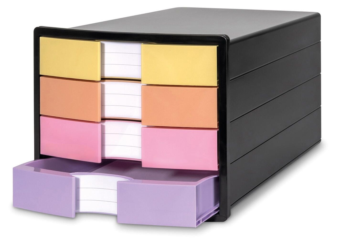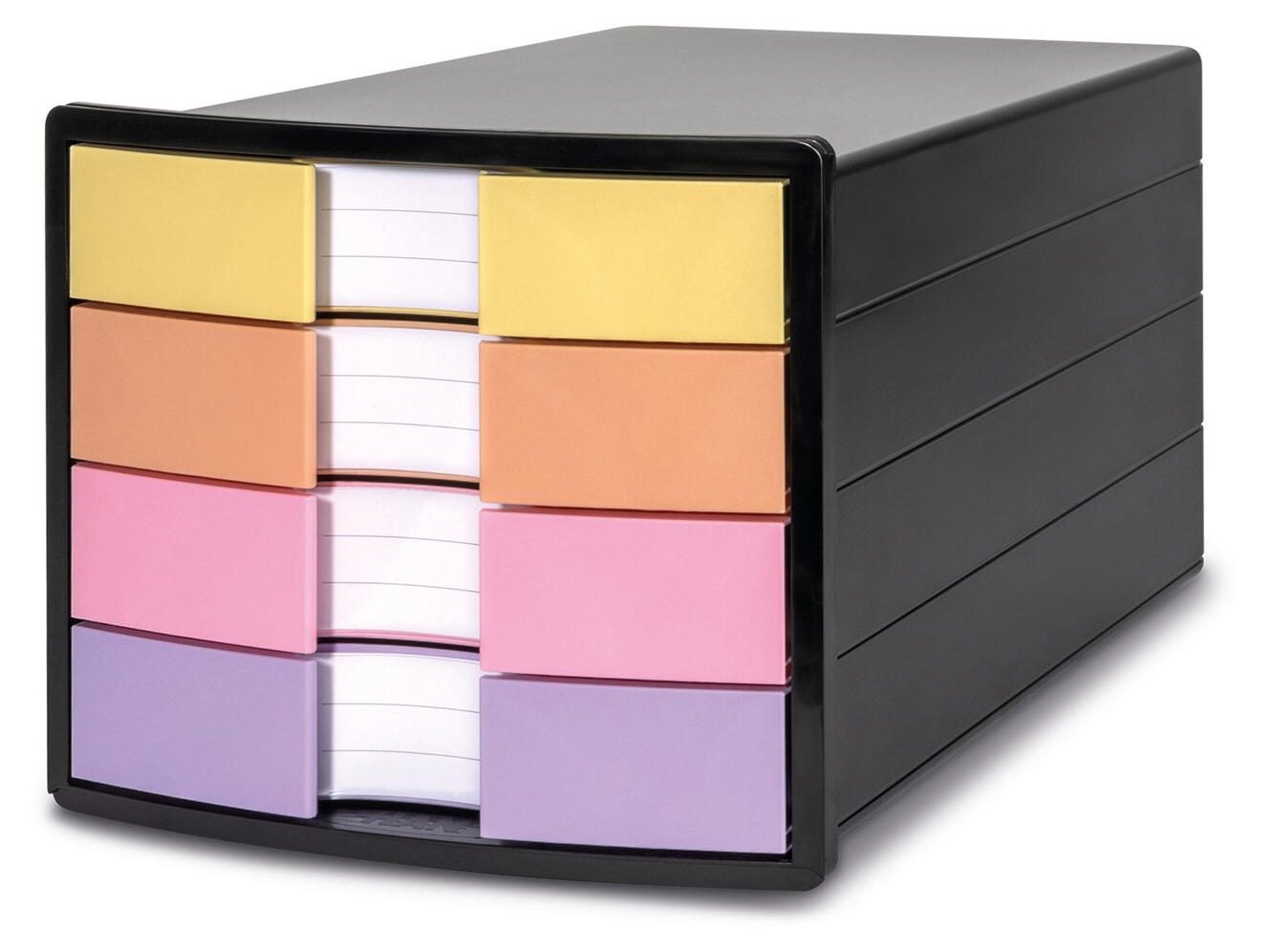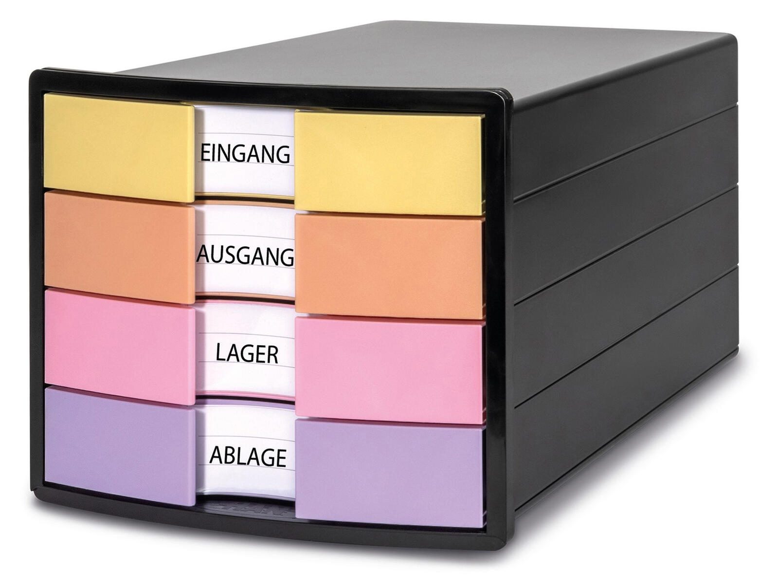 Die HAN Schubladenbox IMPULS DIN A4 geschlossen ist ein praktisches Aufbewahrungsmöbel für Dokumente und Unterlagen im Format DIN A4 sowie DIN C4. Sie besteht aus robustem Polystyrol-Kunststoff und bietet mit ihren vier geschlossenen Schubladen ausreichend Platz zur übersichtlichen Organisation. Die Schubladen sind in den Farben Gelb, Orange, Rosa und Lila gestaltet, was eine farbliche Unterscheidung der Inhalte erleichtert.