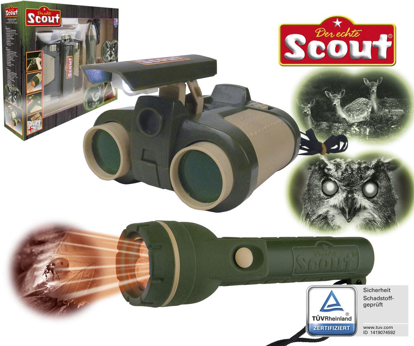 - Produktmaß: Nachtsicht-Fernglas: 11,0 x 12,0 x 5,5 cm; Nachtsicht-Taschenlampe: 15,3 cm x Ø 4,2 cm