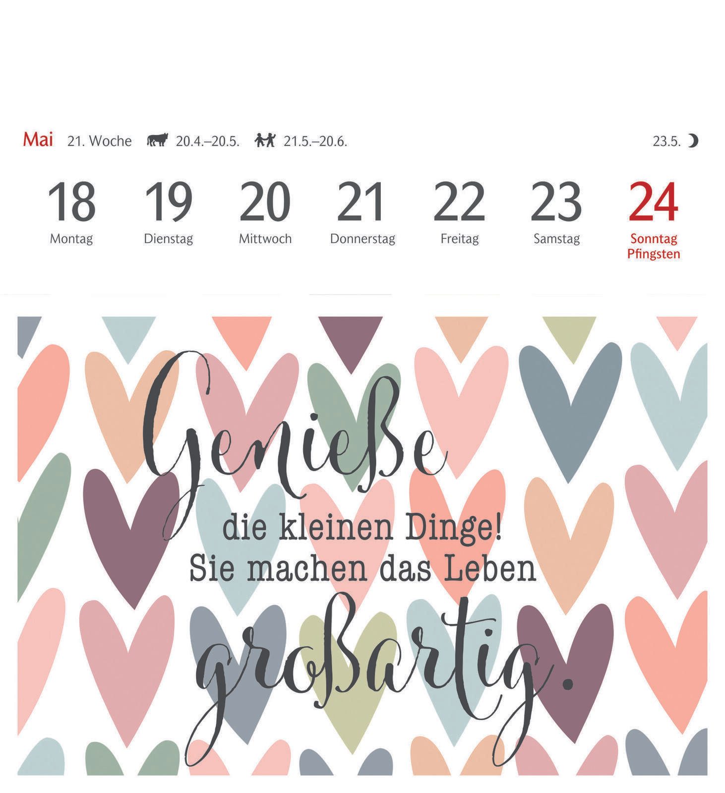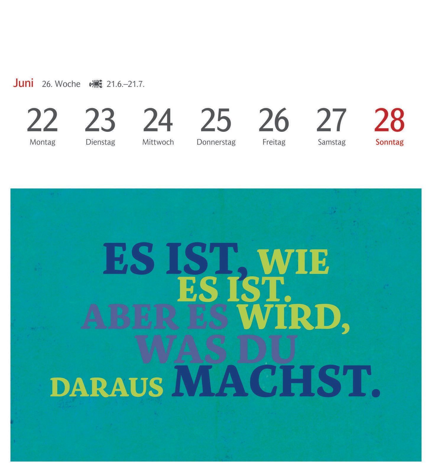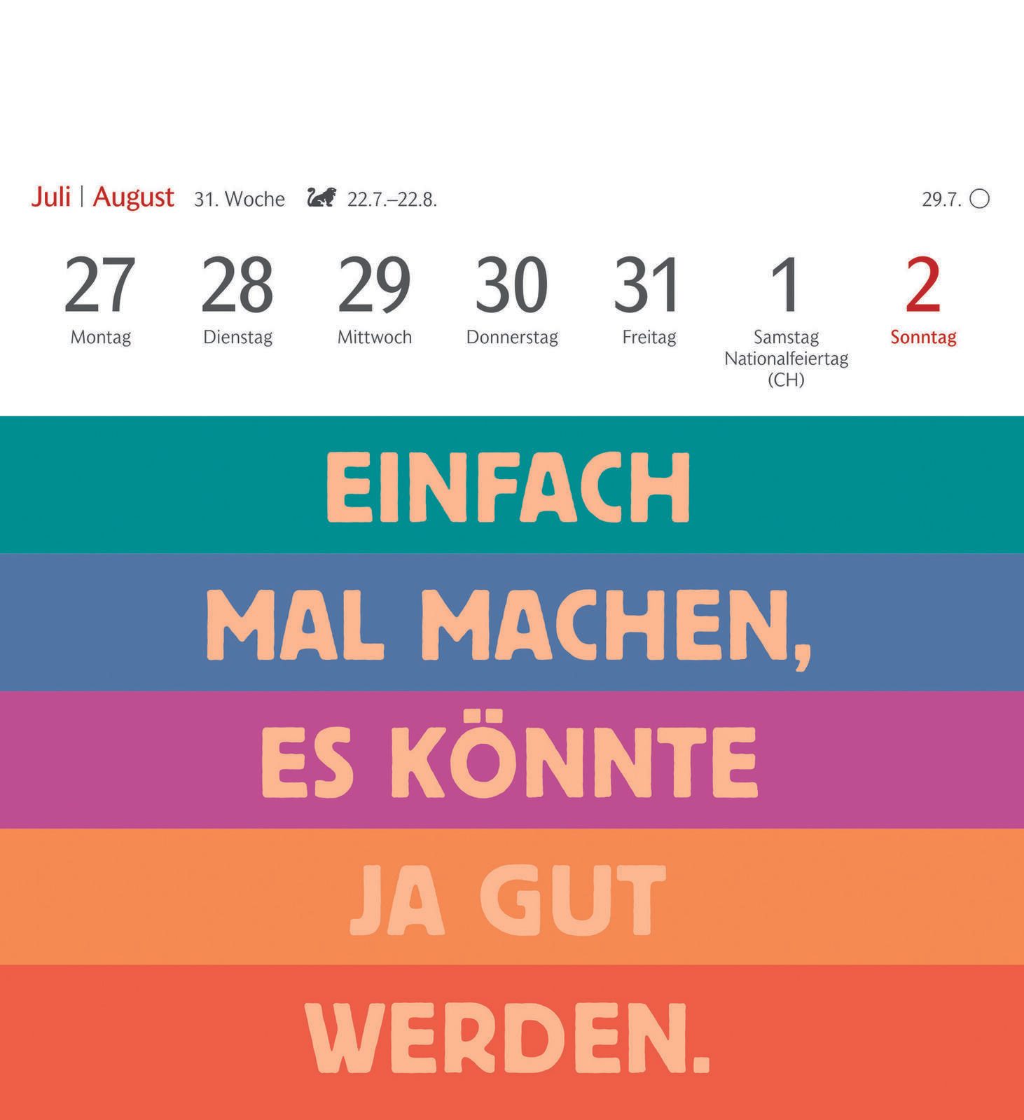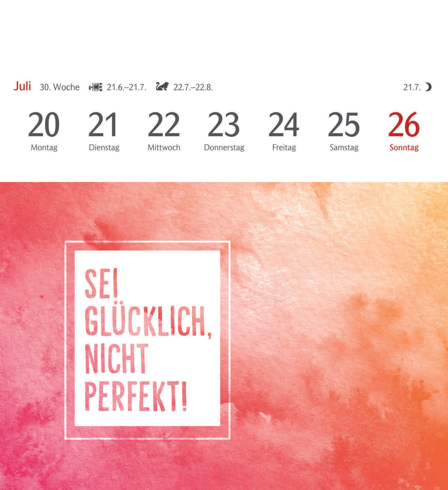 Die Bindung des Kalenders erfolgt durch Klebung, was eine flache und kompakte Form garantiert. Das verwendete Material sorgt für eine angenehme Haptik und eine langlebige Qualität, sodass der Kalender über das gesamte Jahr hinweg gut erhalten bleibt. Die Gestaltung erlaubt es, einzelne Seiten als Postkarten zu verwenden, was den Kalender besonders vielseitig macht.