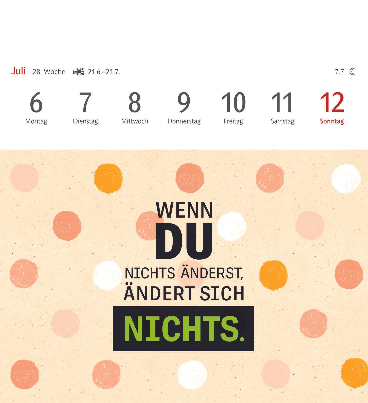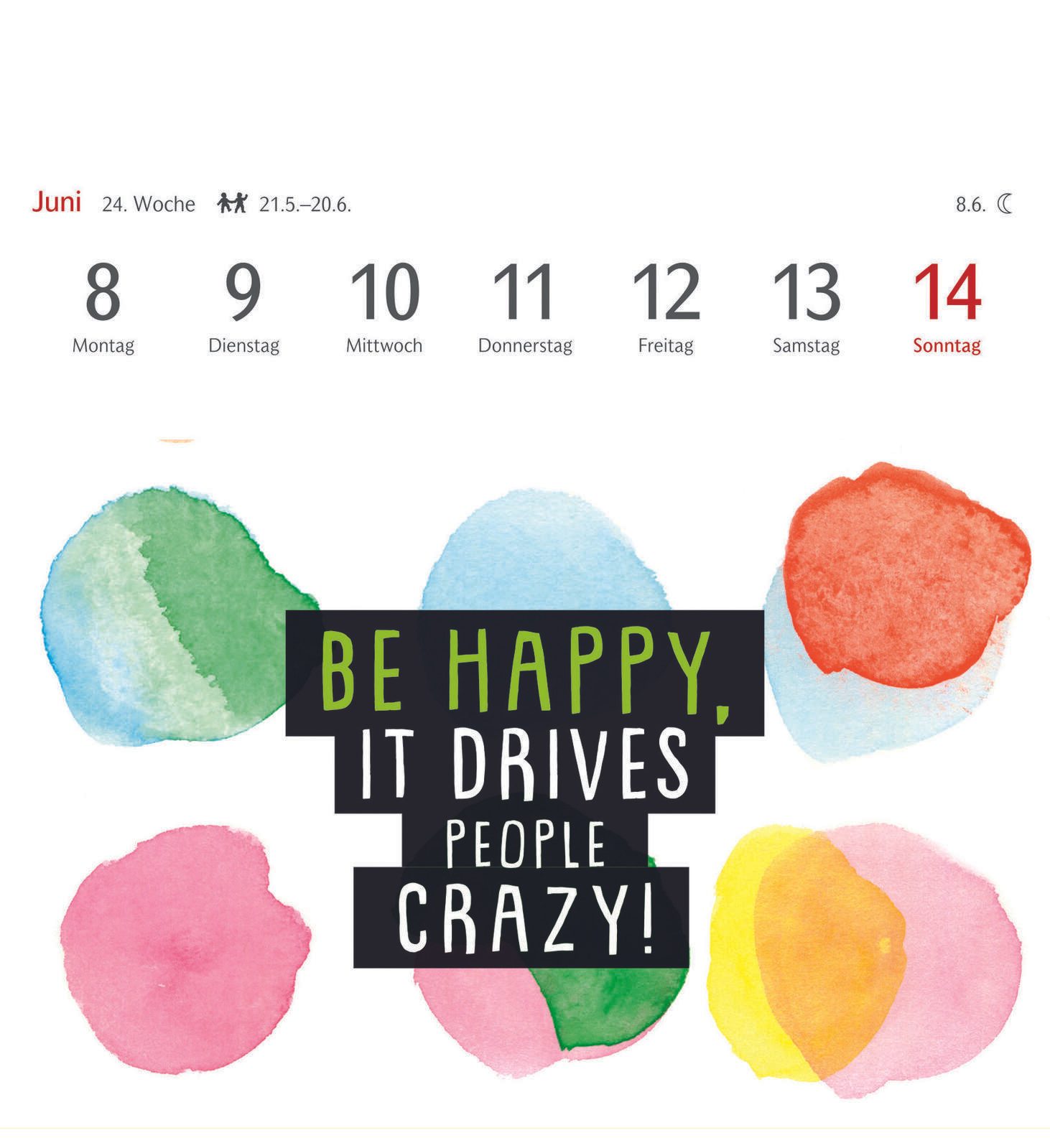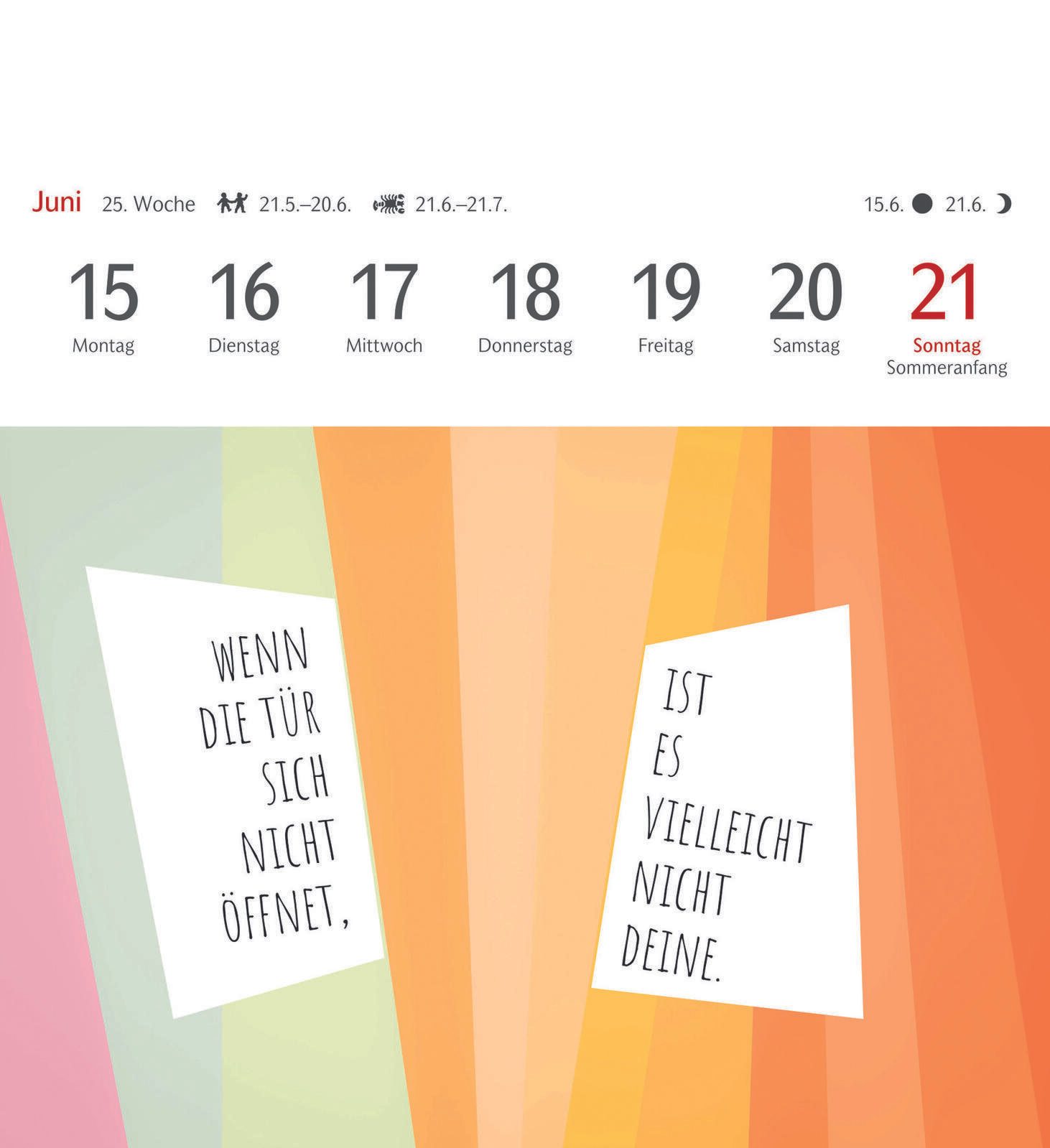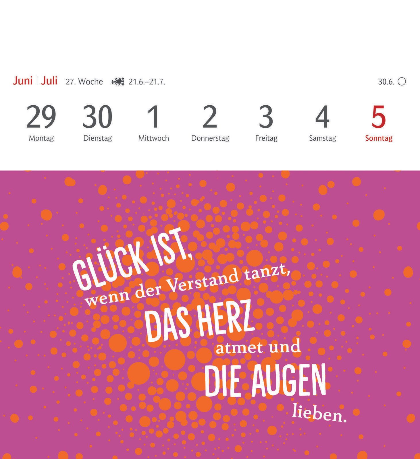 Die Bindung des Kalenders erfolgt durch Klebung, was eine flache und kompakte Form garantiert. Das verwendete Material sorgt für eine angenehme Haptik und eine langlebige Qualität, sodass der Kalender über das gesamte Jahr hinweg gut erhalten bleibt. Die Gestaltung erlaubt es, einzelne Seiten als Postkarten zu verwenden, was den Kalender besonders vielseitig macht.