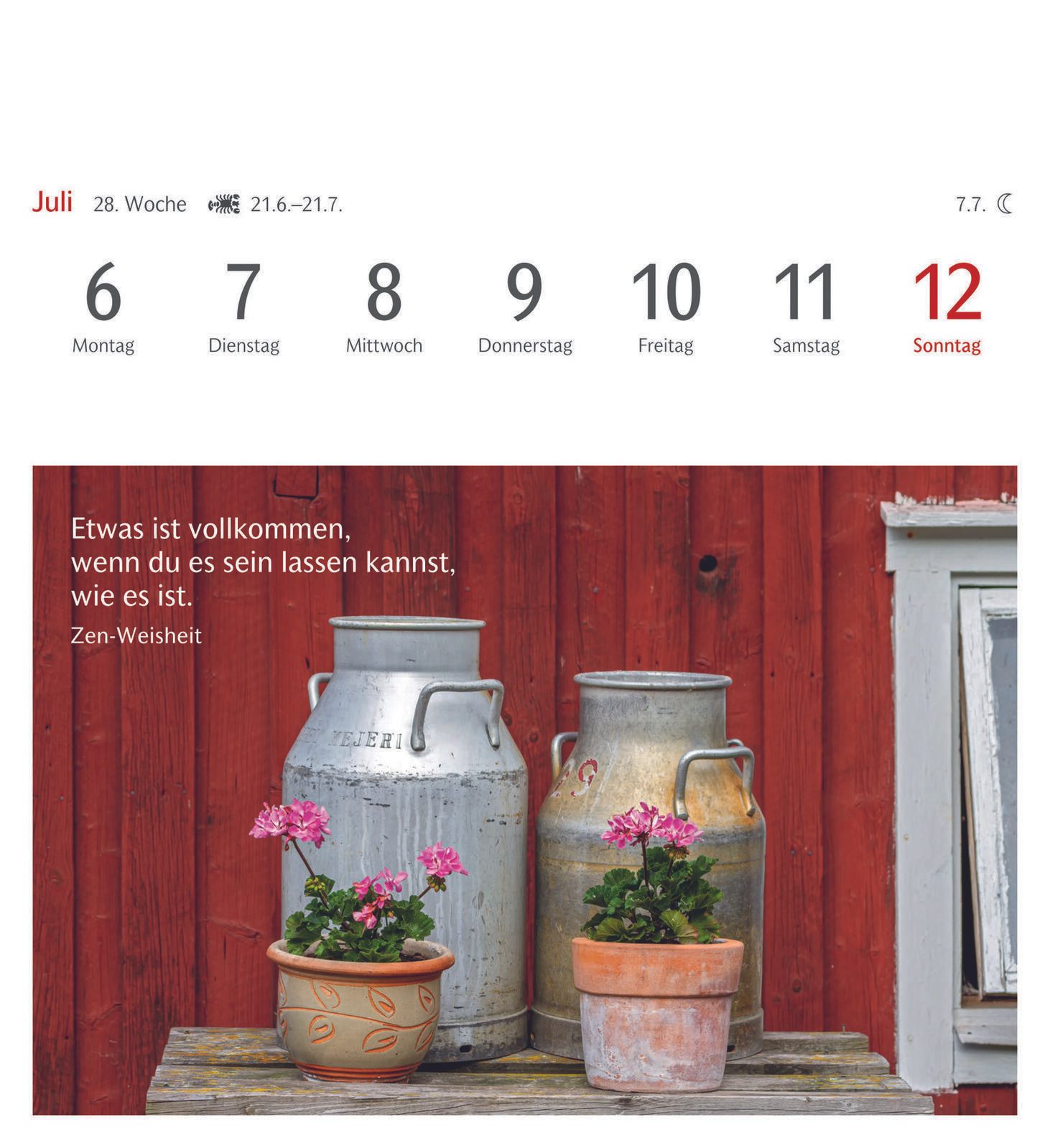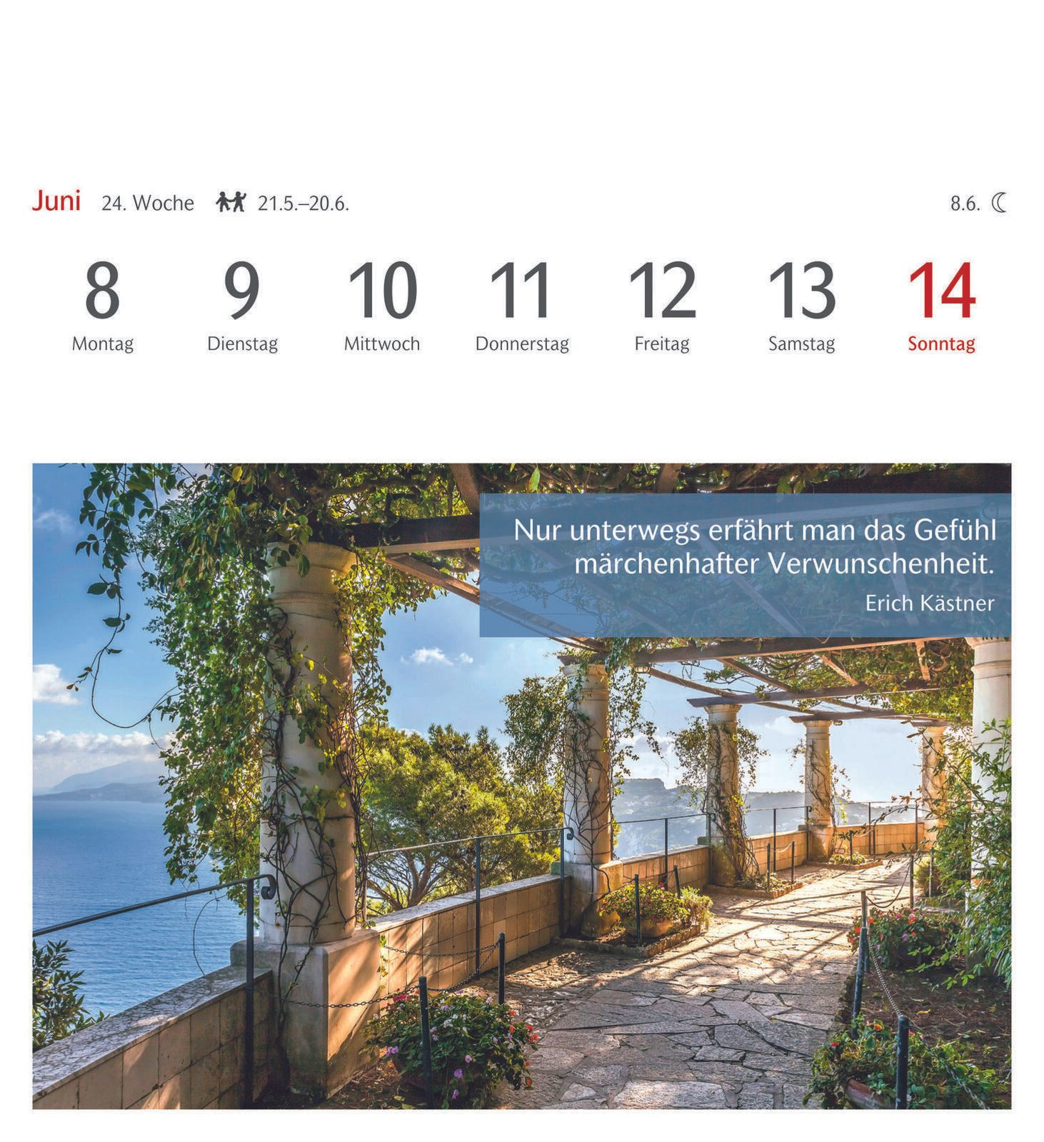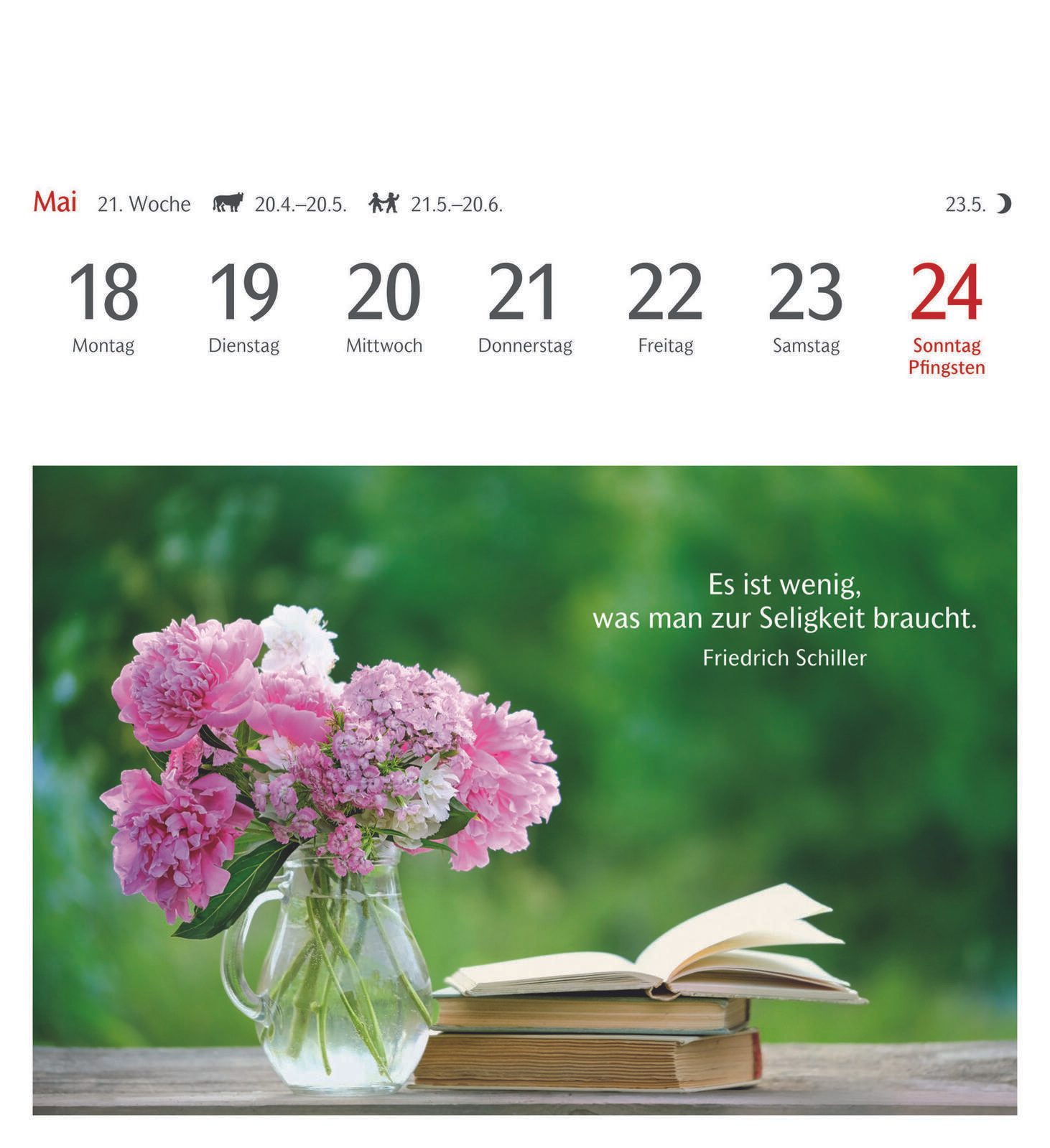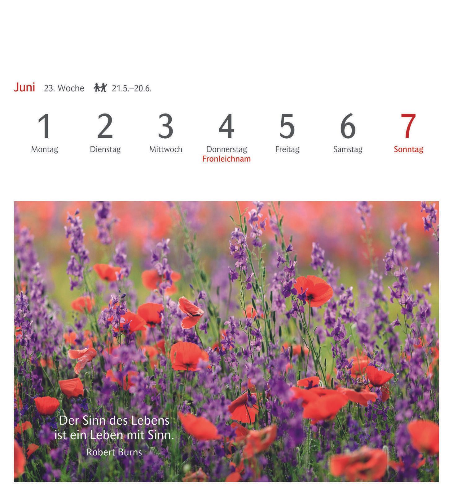 Die Bindung des Kalenders erfolgt durch Klebung, was eine flache und stabile Verbindung der Seiten gewährleistet. Das Material des Kalenders ist Karton, das sowohl robust als auch umweltfreundlich ist. Die Farbgestaltung des Kalenders und der Bindung ist dezent und fügt sich gut in verschiedene Wohn- oder Arbeitsumgebungen ein.