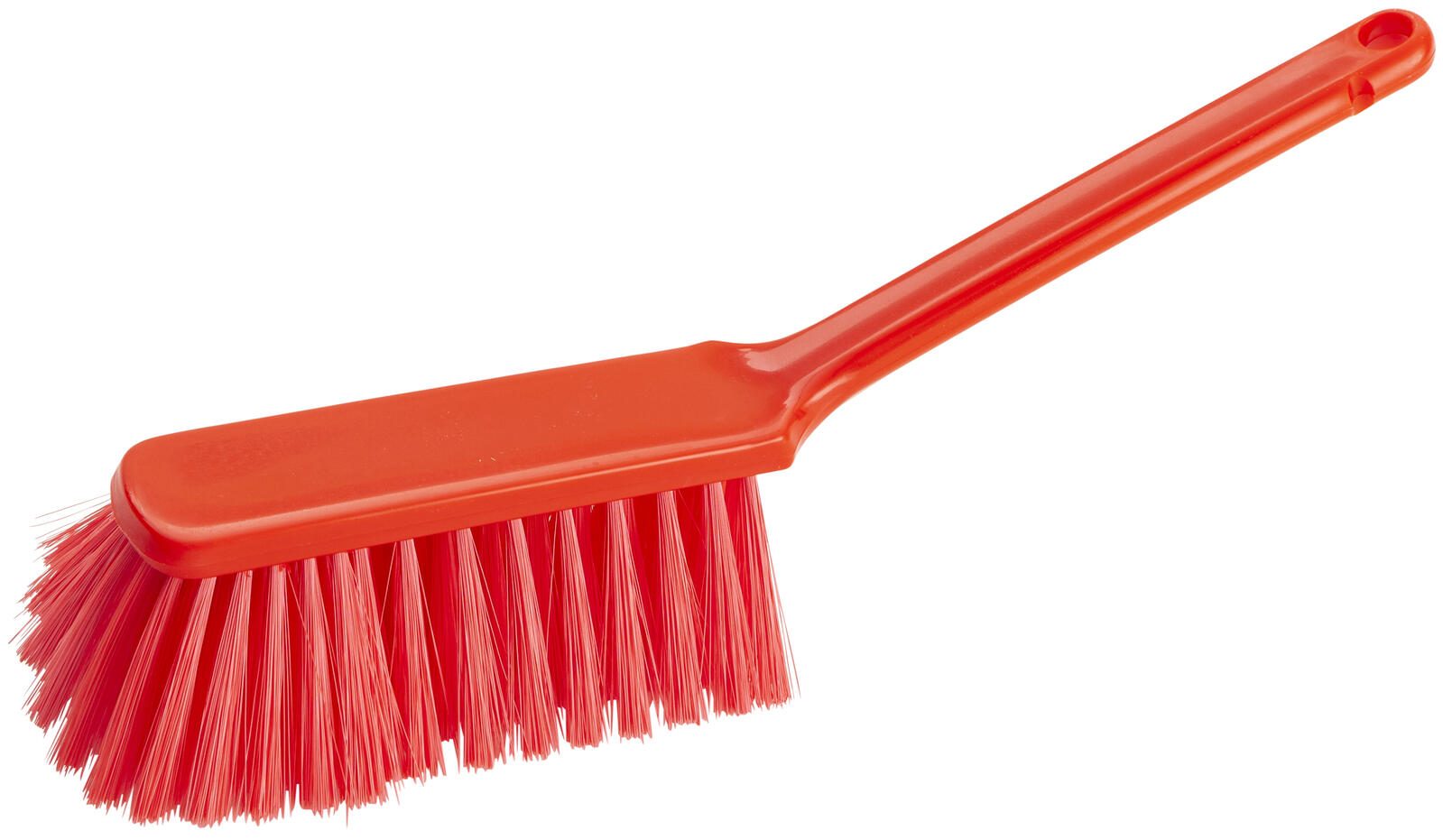 Zu den praktischen Eigenschaften des Handfegers gehört ein Aufhängeloch, das eine einfache und platzsparende Aufbewahrung ermöglicht. Das Gerät ist ungeschlitzt und in einem auffälligen Rotton gehalten, was die Sichtbarkeit erleichtert und den Handfeger optisch klar erkennbar macht.