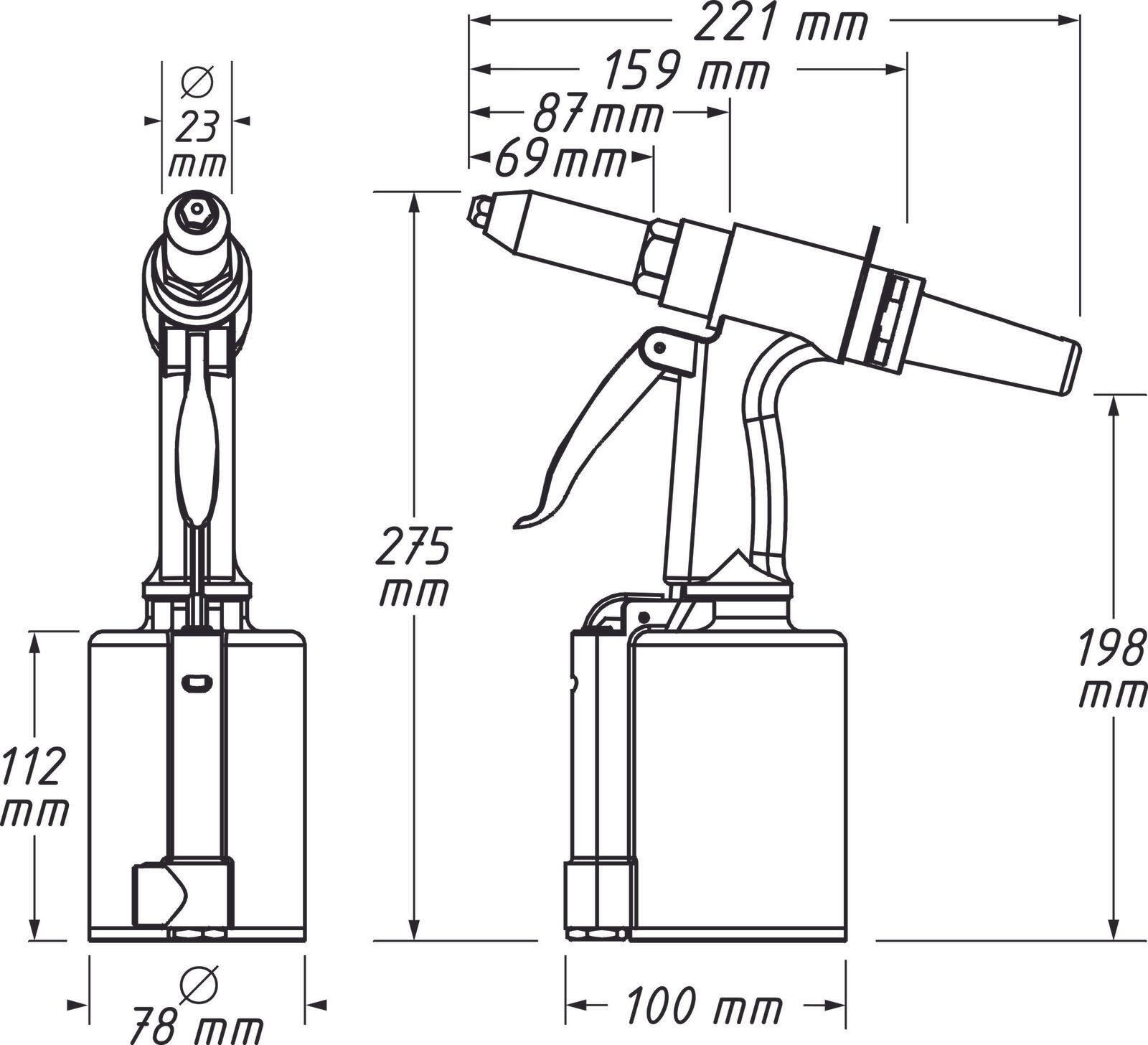 Im Lieferumfang sind vier verschiedene Mundstücke enthalten, die die Vielseitigkeit der Pistole zusätzlich erhöhen und eine Anpassung an unterschiedliche Nietgrößen erlauben. Die Kombination aus ergonomischem Design und technischer Präzision unterstützt Sie bei anspruchsvollen Nietarbeiten und sorgt für ein komfortables Handling auch bei längerem Einsatz.
