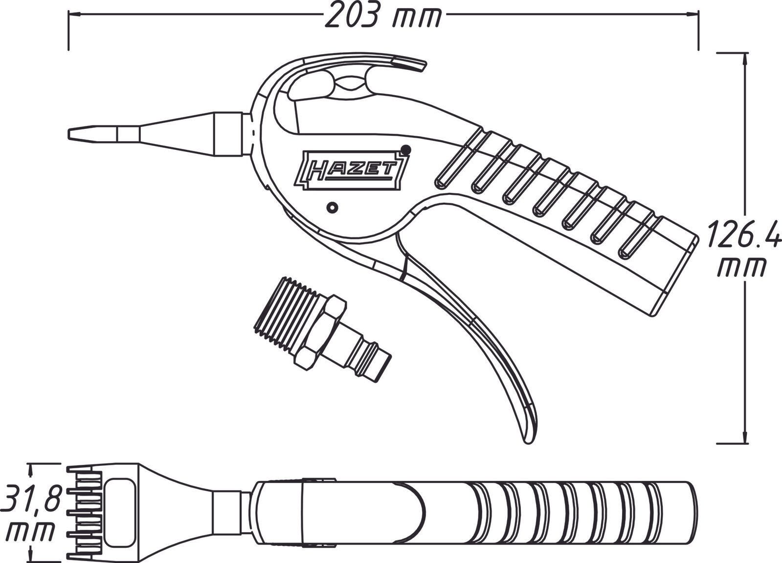 Die HAZET Ausblaspistole 9040P-5 ist ein Werkzeug, das mit Druckluft betrieben wird und sich durch seine robuste Bauweise aus Metall auszeichnet. Mit einer Gesamtlänge von 20,3 cm liegt sie gut in der Hand und ist für verschiedene Anwendungen im Bereich der Druckluftpistolen geeignet.