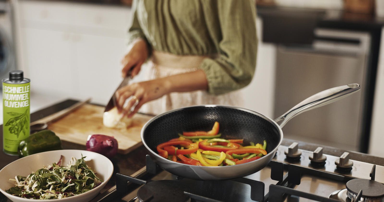 - Setumfang: 1x Edelstahlpfanne Ø 28cm, 1x Edelstahlpfanne Ø 24cm, 1x 500ml Olivenöl