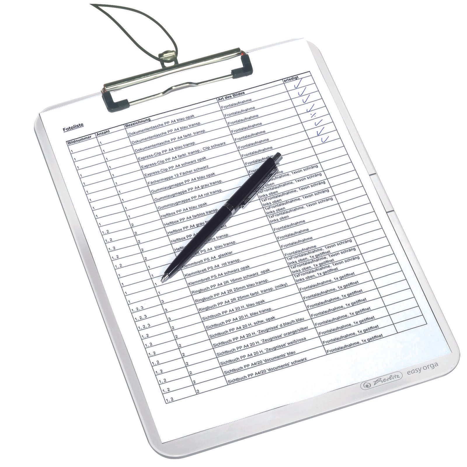 Das herlitz Klemmbrett DIN A4 glasklar ist die ideale Lösung für alle, die ihre Unterlagen professionell präsentieren und organisieren möchten. Mit seinen transparenten Eigenschaften bietet dieses Klemmbrett nicht nur eine ansprechende Optik, sondern ermöglicht auch einen schnellen Zugriff auf deine Dokumente. Das Maß von 22,50 x 31,50 cm macht es perfekt für DIN A4 Formate, sodass du problemlos bis zu 50 Blatt sicher aufbewahren kannst. Hergestellt aus hochwertigem Polystyrol, zeichnet sich das Klemmbrett durch seine Langlebigkeit und Stabilität aus. Der silberne Metallclip an der kurzen Seite sorgt dafür, dass deine Unterlagen festgehalten werden, ohne sie zu beschädigen. Dies ist besonders wichtig, wenn du häufig unterwegs bist oder Präsentationen hältst, denn so bleiben deine Dokumente stets ordentlich und griffbereit. Die glasklare Farbe des Klemmbretts verleiht ihm eine moderne und elegante Note, die in jedem beruflichen Umfeld gut ankommt. Ob im Büro, in der Schule oder bei Präsentationen – das herlitz Klemmbrett ist ein unverzichtbares Hilfsmittel, das dir hilft, deine Unterlagen stilvoll zu präsentieren und gleichzeitig den Überblick zu behalten. Dank seines durchdachten Designs und der hochwertigen Materialien ist das herlitz Klemmbrett nicht nur funktional, sondern auch ein echter Blickfang. Es eignet sich hervorragend für alle, die Wert auf Qualität und Ästhetik legen. Mit diesem Klemmbrett bist du bestens ausgestattet, um deine Dokumente optimal zu organisieren und professionell aufzutreten.Technische Daten