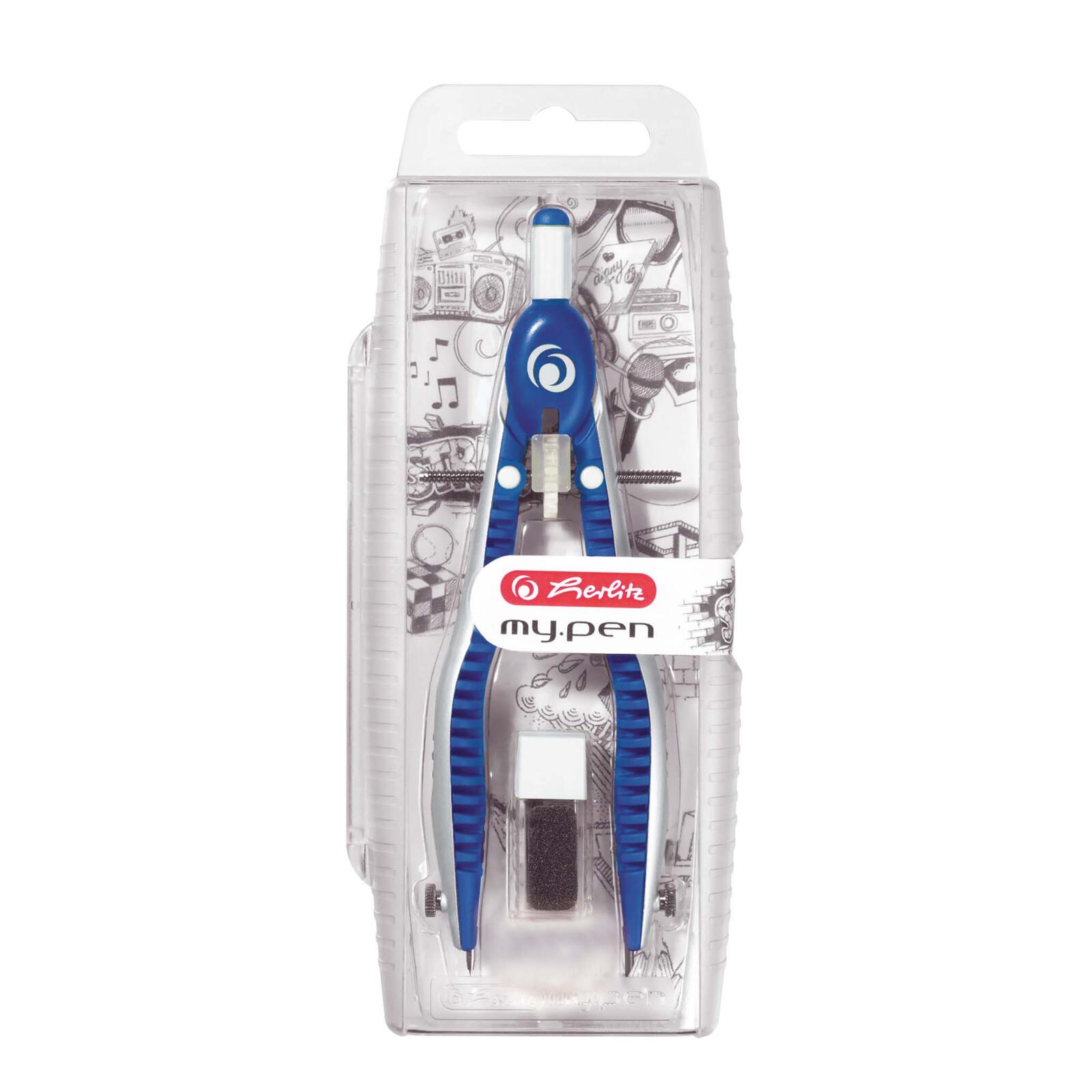 Der herlitz my.pen Zirkel in Blau-Weiß ist ein Schnellverstellzirkel, der mit einer Mitteltriebsspindel ausgestattet ist. Dieser hochwertige Zirkel aus Metall stammt aus der renommierten Serie my.pen von herlitz.
