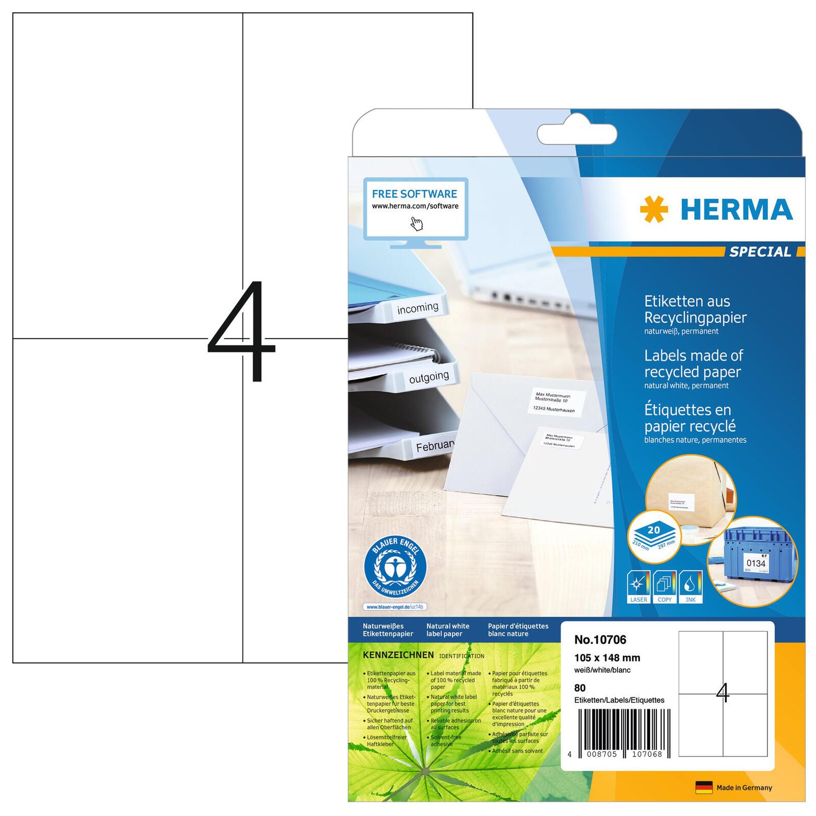 Die HERMA 10706 Recycling Etiketten sind rechteckige Etiketten mit den Maßen 105,0 x 148,0 mm. Sie sind auf A4-Bögen angeordnet, wobei ein Pack 20 Blatt mit insgesamt 80 Etiketten enthält. Die Etiketten sind aus Papier gefertigt und besitzen eine weiße Farbe, die eine vielseitige Nutzung ermöglicht.