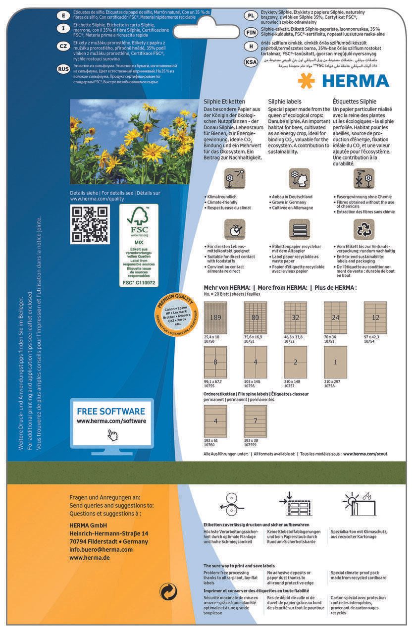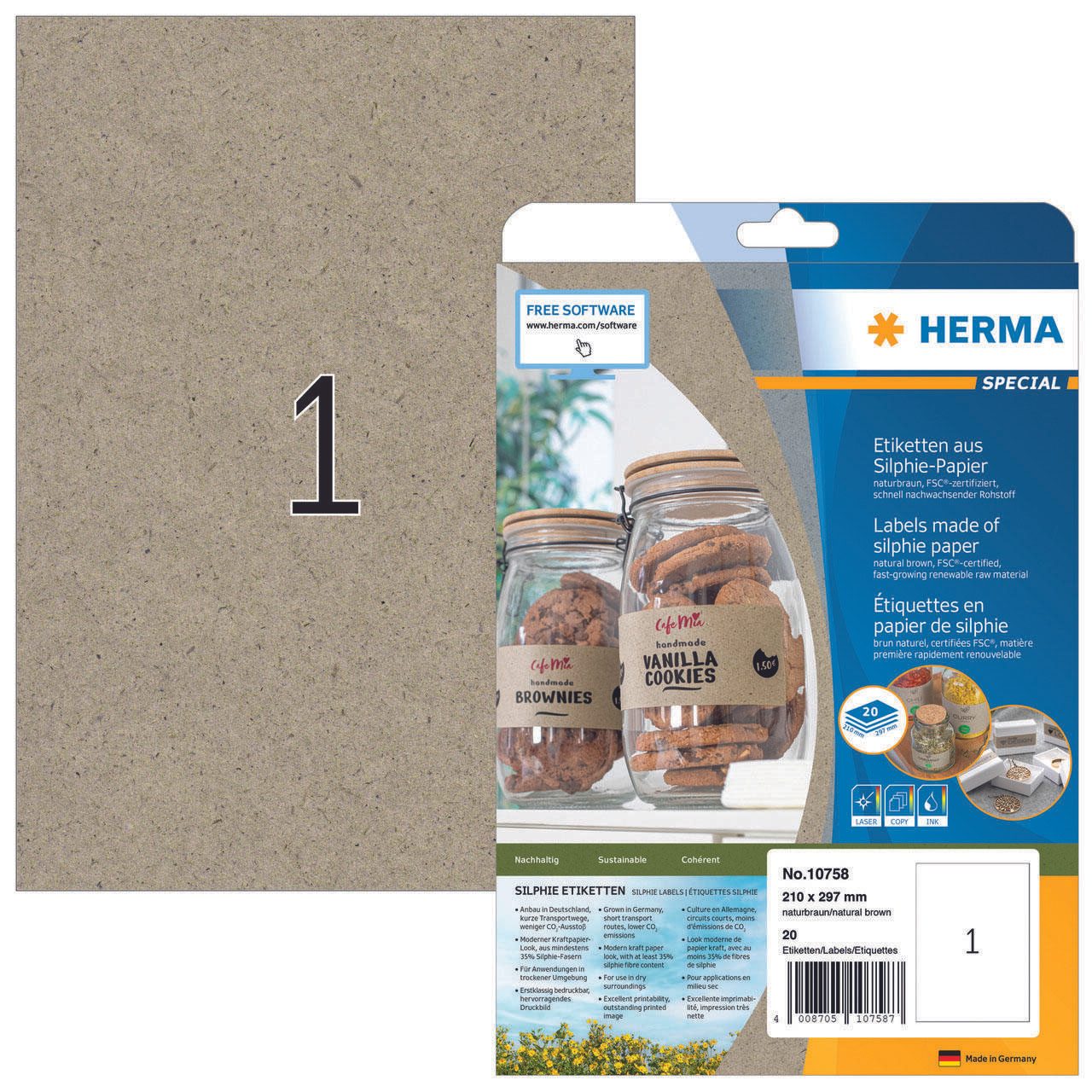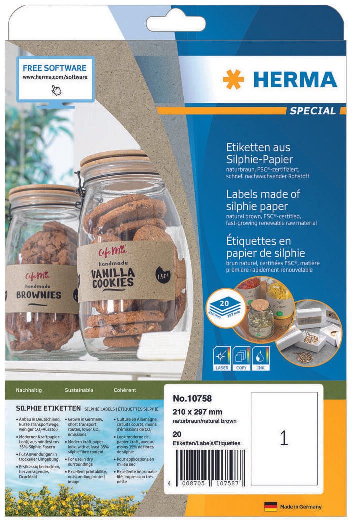 Die HERMA Etikett.Silphie 210x297 bietet eine praktische Lösung für all deine Etikettierungsbedürfnisse. Mit einer Größe von 210,0 x 297,0 mm eignet sich dieses rechteckige Etikett perfekt für eine Vielzahl von Anwendungen, sei es im Büro, zu Hause oder für kreative Projekte. Die braune Farbe verleiht den Etiketten eine natürliche und ansprechende Optik, die sich harmonisch in verschiedene Umgebungen einfügt. Jede Packung enthält 20 Blatt, was dir ausreichend Material für deine Etikettierungsprojekte bietet. Die HERMA Etiketten sind nicht nur einfach zu bedrucken, sondern auch vielseitig einsetzbar. Egal, ob du Adressetiketten, Produktetiketten oder organisatorische Beschriftungen benötigst, diese Etiketten sind die ideale Wahl. Die hohe Qualität und die Benutzerfreundlichkeit der HERMA Produkte garantieren, dass deine Etiketten stets professionell und ansprechend aussehen. Die HERMA Etikett.Silphie ist nicht nur funktional, sondern auch umweltfreundlich. Durch die Verwendung von Silphie-Papier, das aus nachwachsenden Rohstoffen hergestellt wird, trägst du aktiv zum Umweltschutz bei. Diese Etiketten sind somit nicht nur eine praktische Wahl, sondern auch eine bewusste Entscheidung für nachhaltige Produkte. Mit HERMA Etikett.Silphie 210x297 kannst du sicher sein, dass du ein Produkt erhältst, das sowohl in der Anwendung als auch in der Qualität überzeugt. Vertraue auf die Erfahrung und das Engagement von HERMA, um deine Etikettierungsprojekte zu einem Erfolg zu machen.Technische Daten
